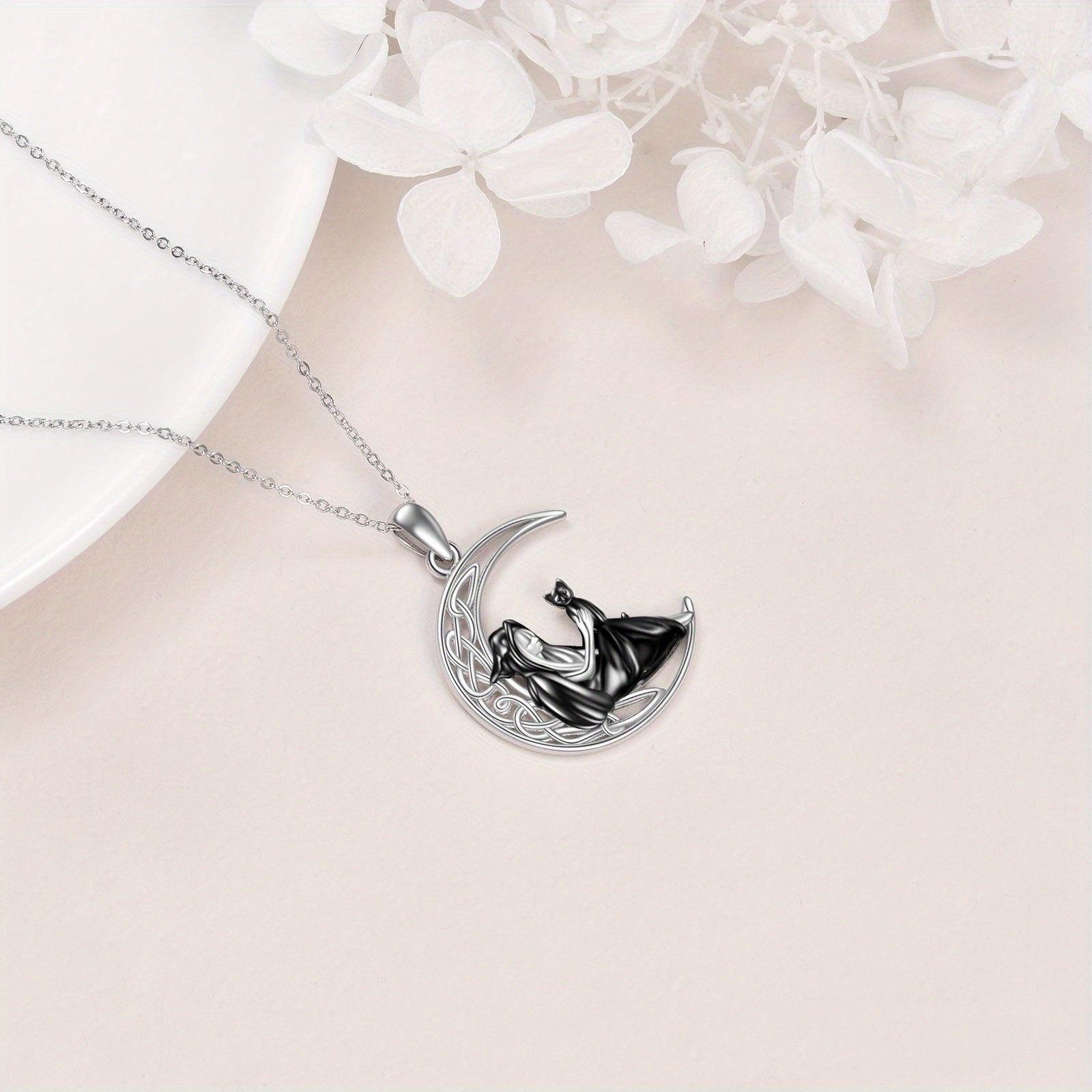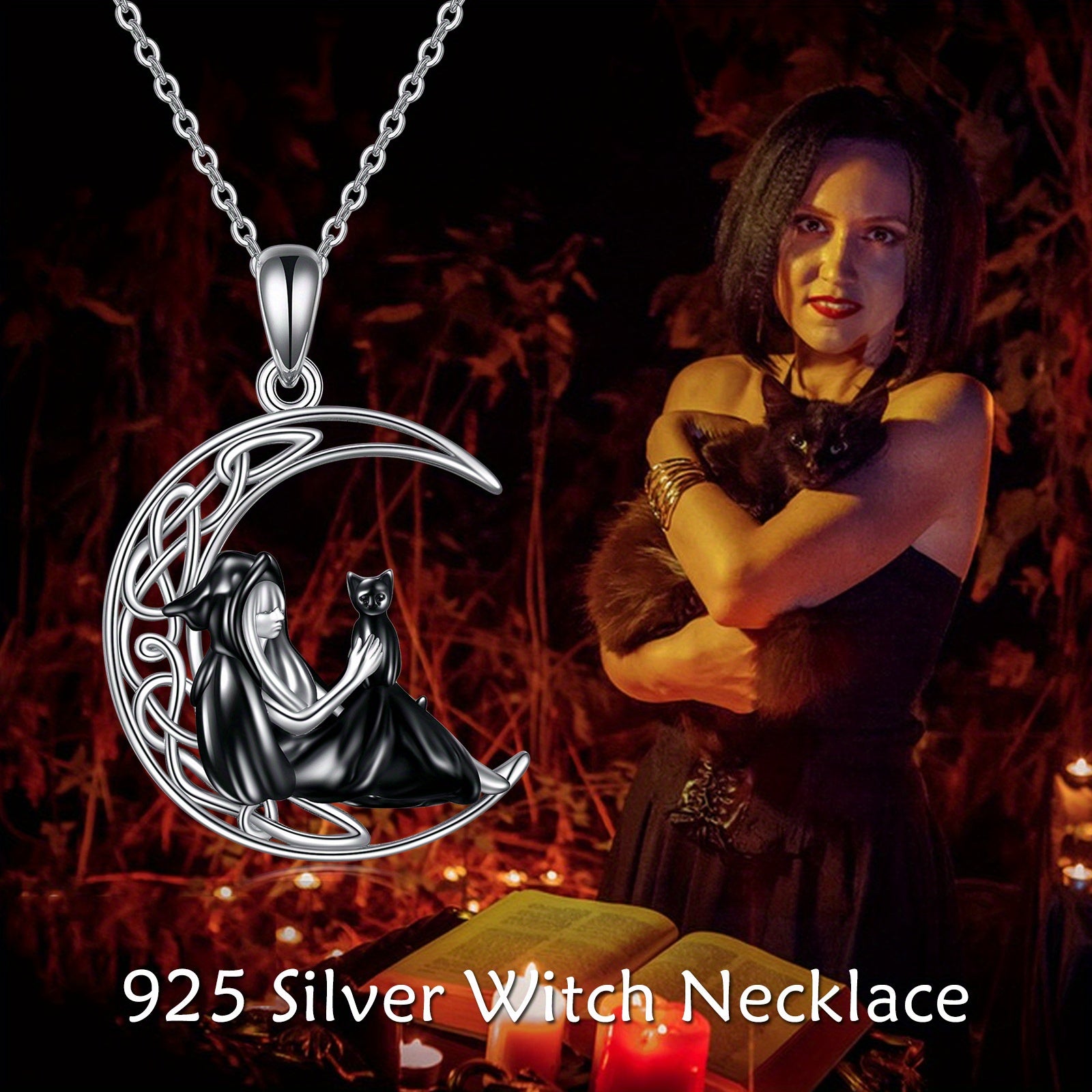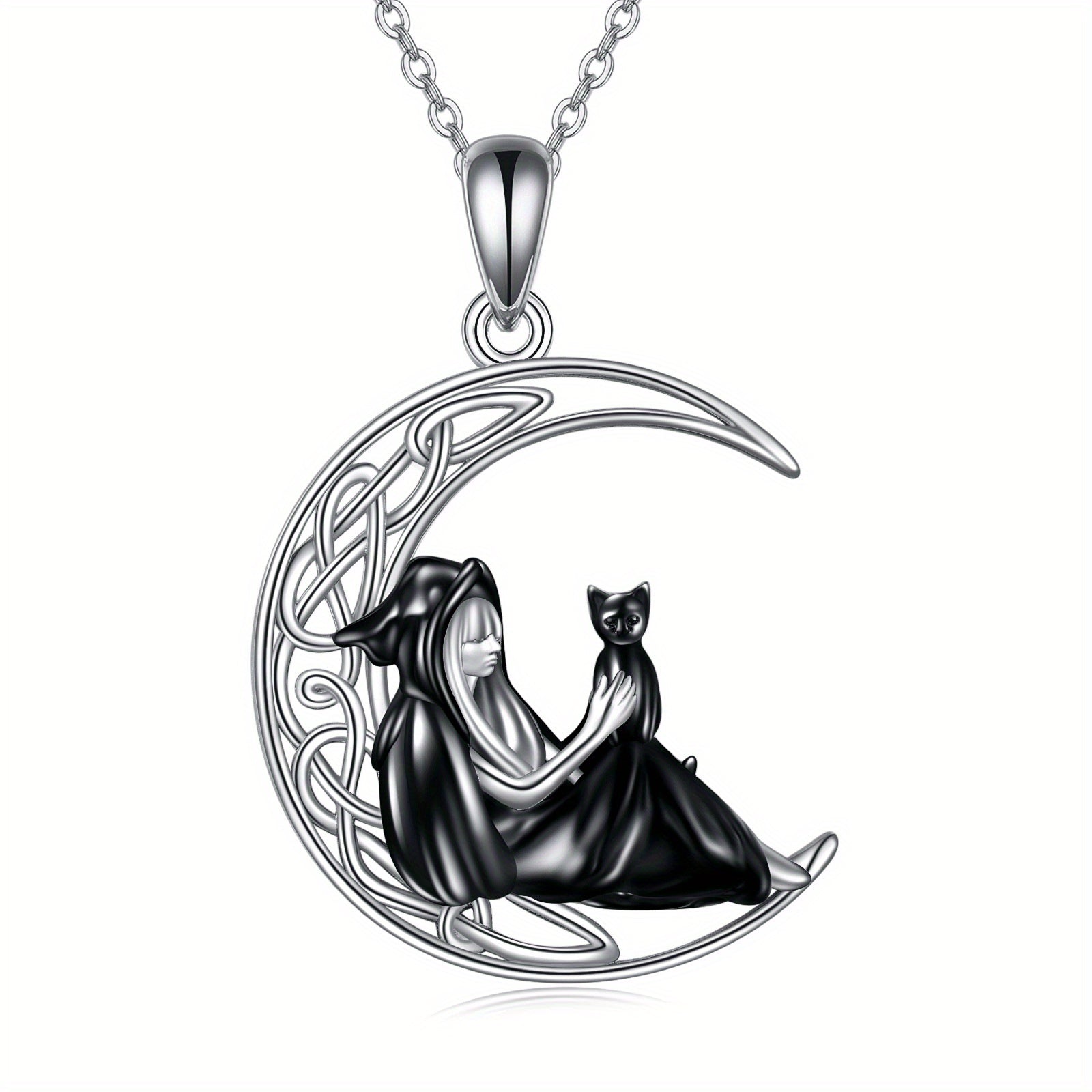 This witch necklace features a charming design of a witch and cat against a Celtic moon, making it a perfect piece of Halloween jewellery for women and girls.