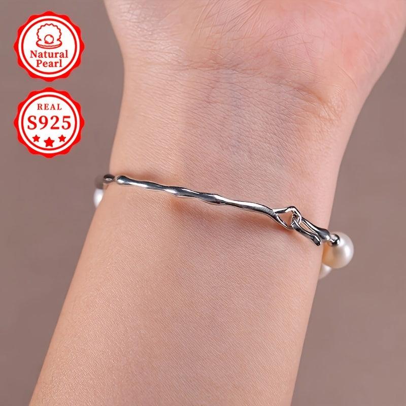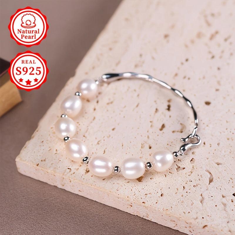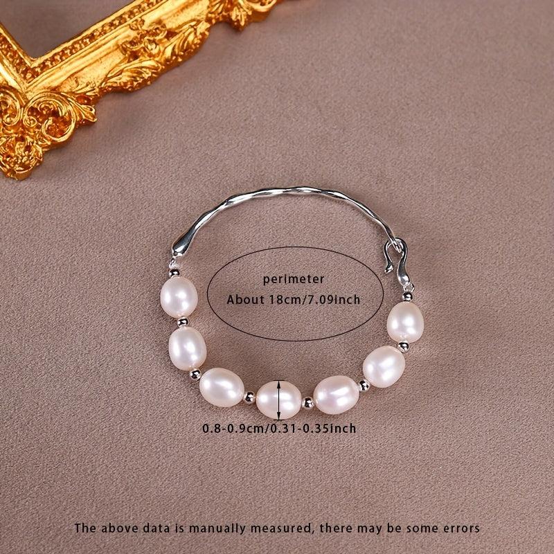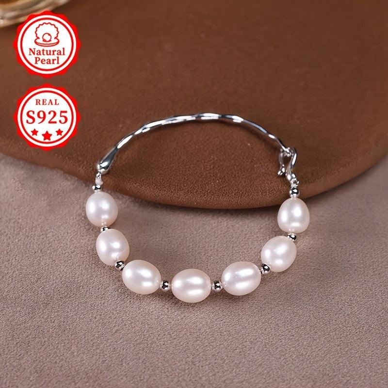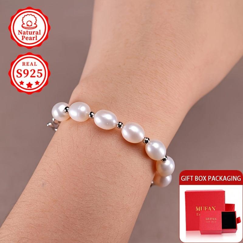 Elegant bracelet featuring 8-9mm rice-shaped natural freshwater pearls set in S925 silver. Each natural pearl may vary in shape.