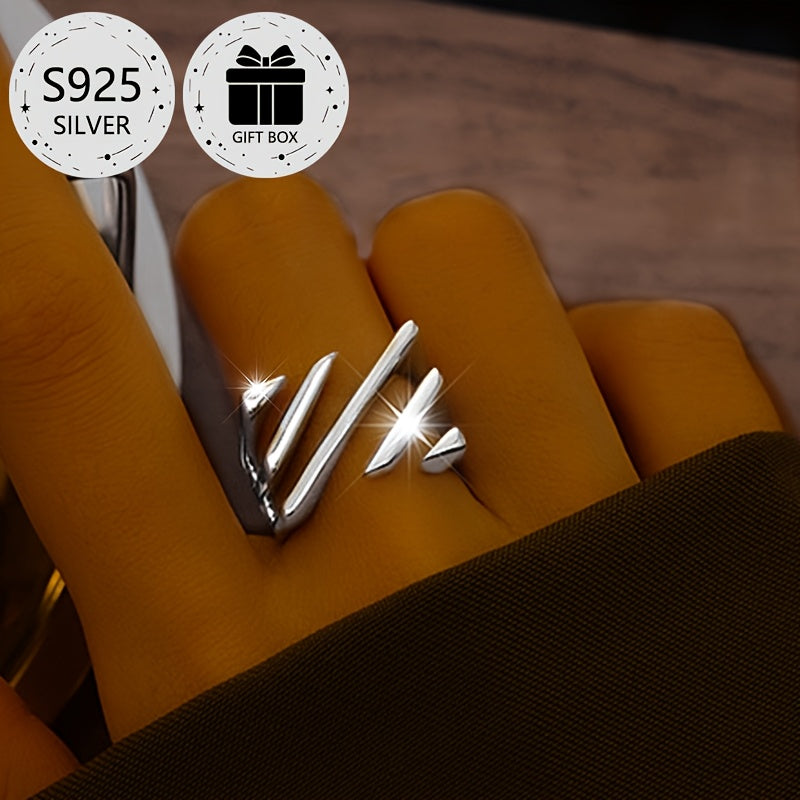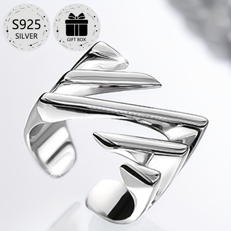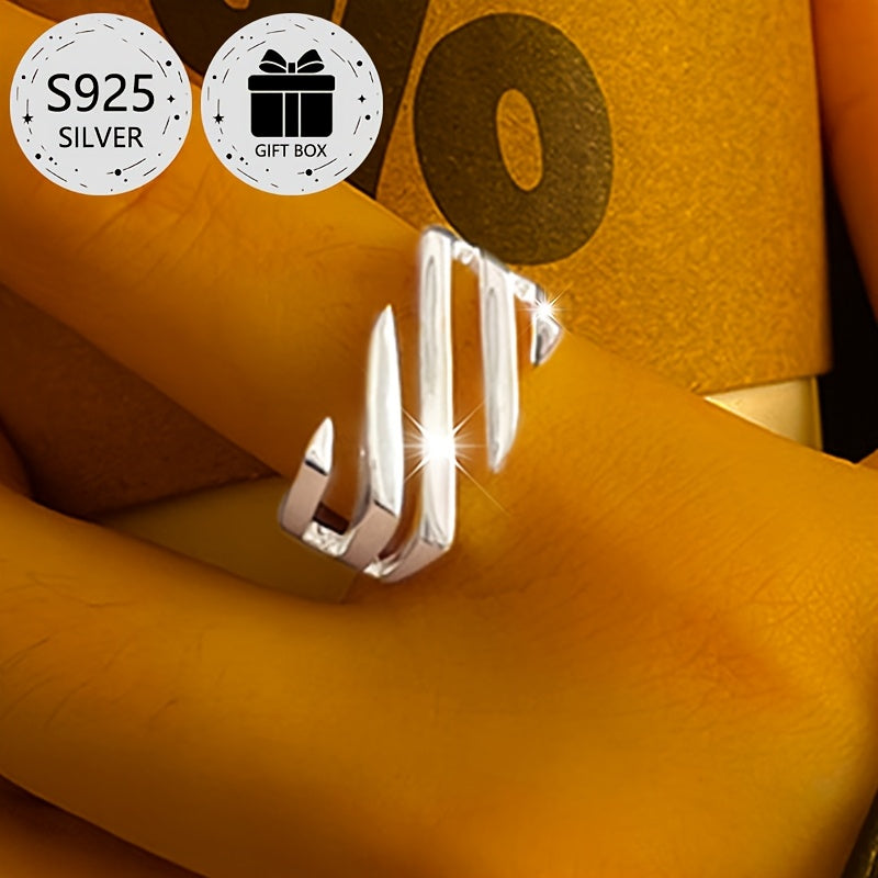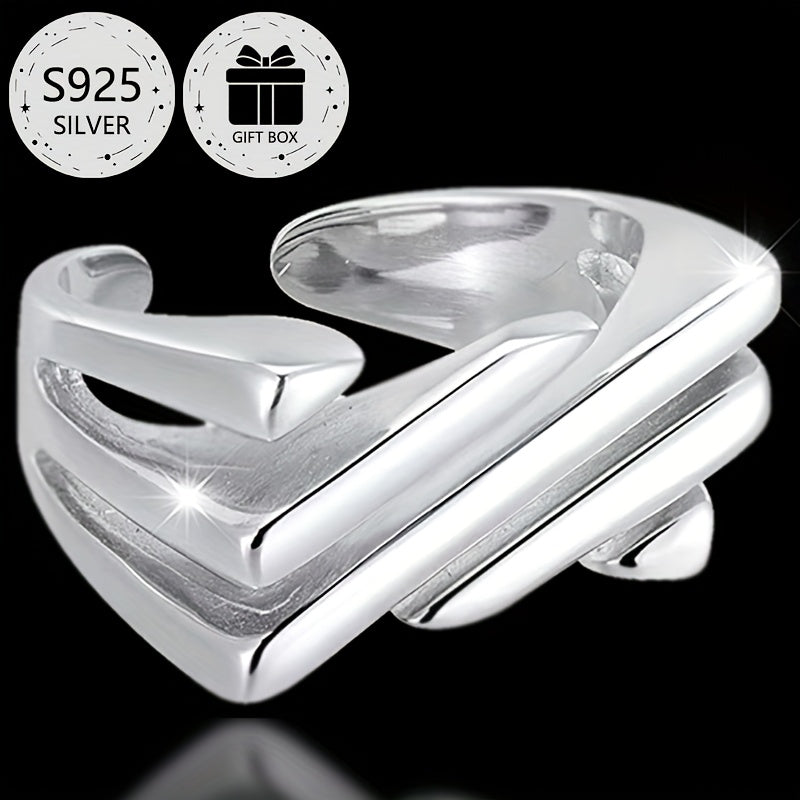 This open ring features a classic square hollow design with a twill layer, made of 925 silver. It is adjustable to fit different finger sizes and weighs approximately 4.8 grams. The ring comes packaged as a perfect gift for any occasion.