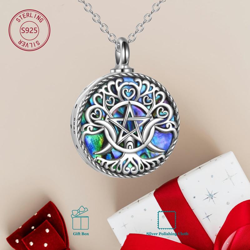 This Goddess Urn Necklace is a beautiful piece of jewelry featuring a pure silvery pentagram pendant. Perfect for men and women who are into Pagan witchcraft and magic. The Tree of Life design adds a touch of mysticism.