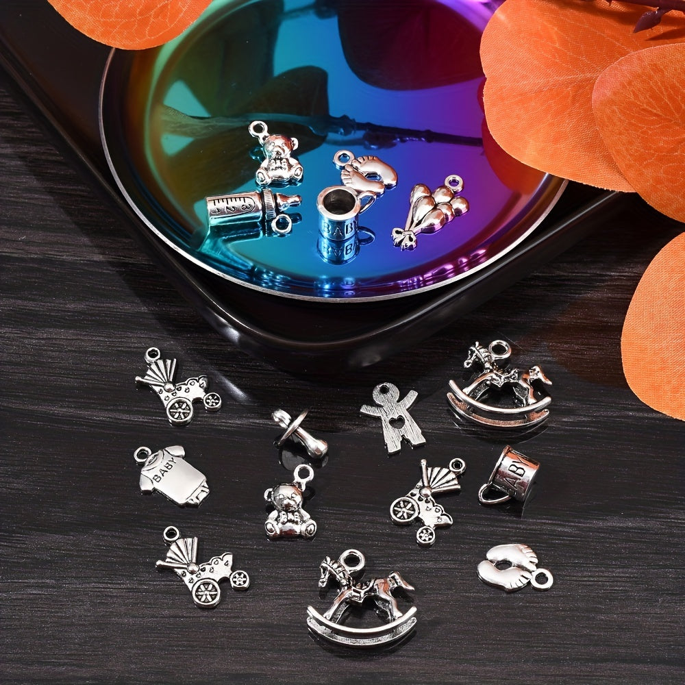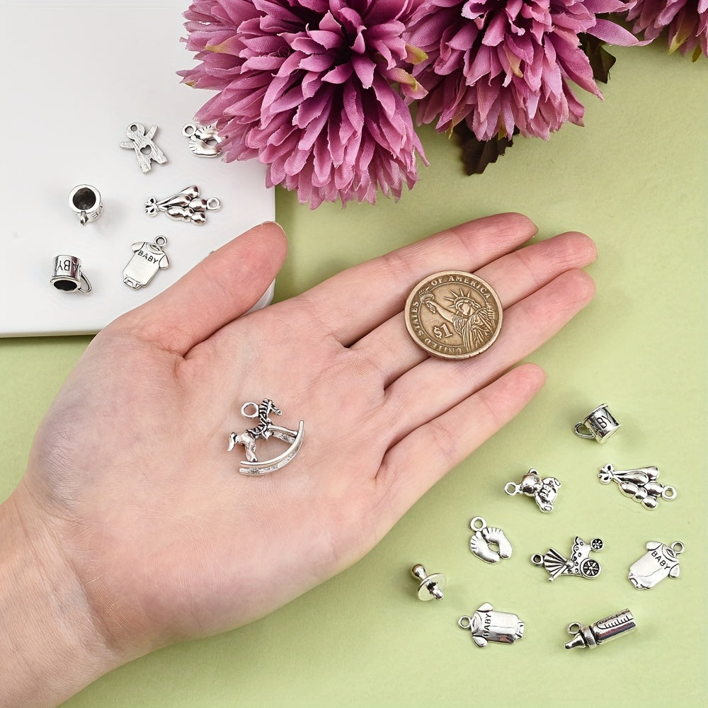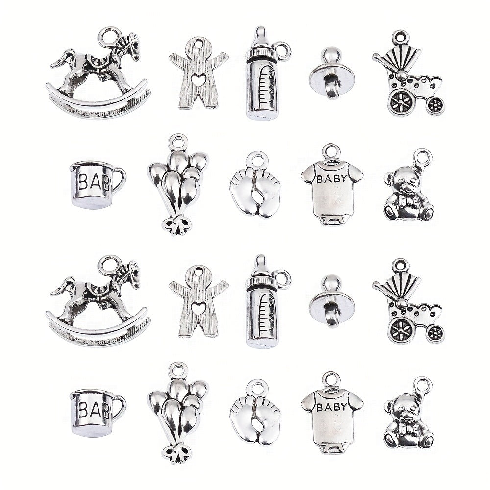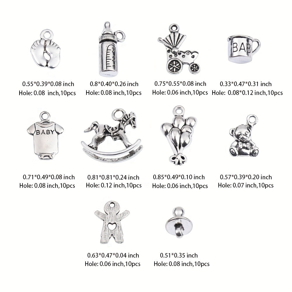 Get this bulk set of 100 footprint charms featuring various newborn baby-themed designs like bottles, carriages, pacifiers, balloons, and rocking horses. Perfect for birthday parties and craft projects.