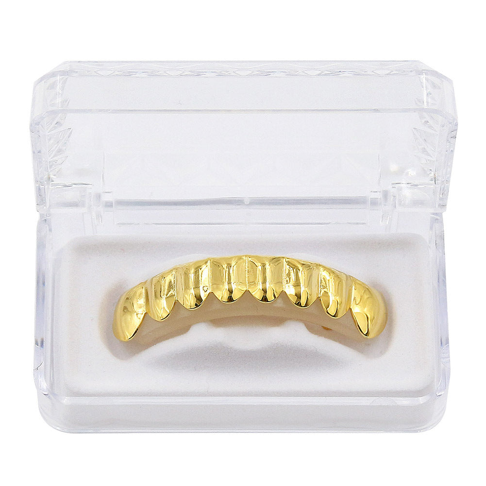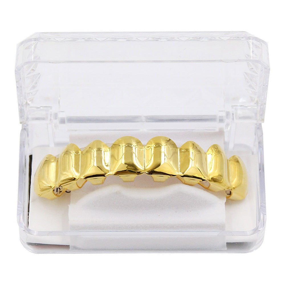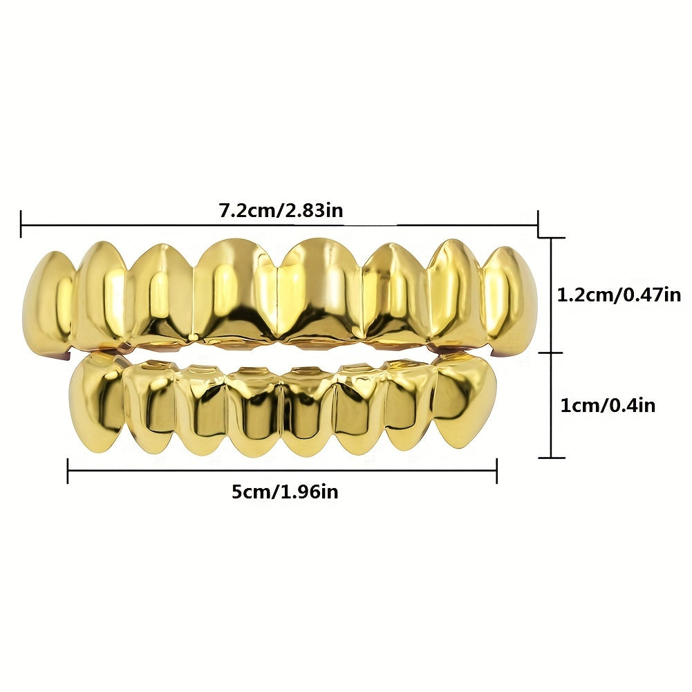 Add some bling to your smile with these 18k gold plated top and bottom tooth hip hop grills. Perfect for parties, events, or everyday wear.
