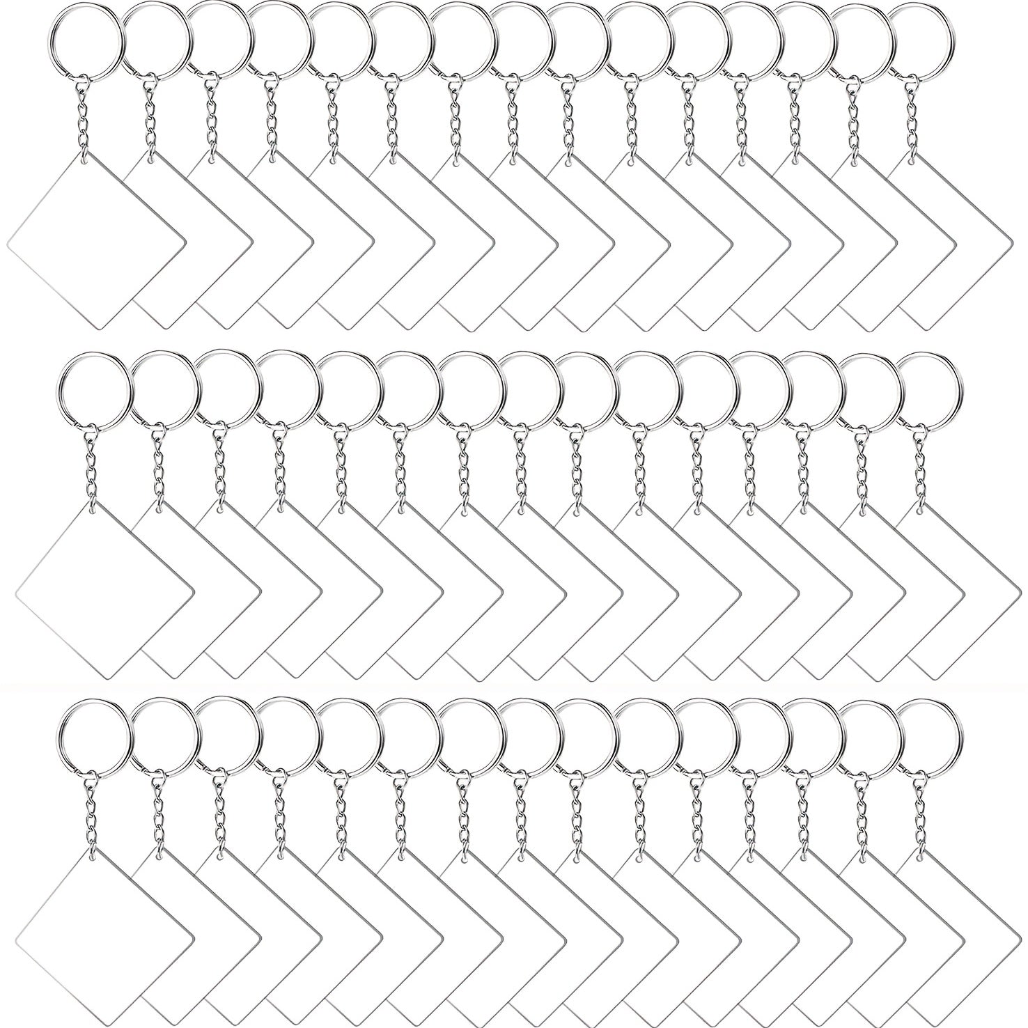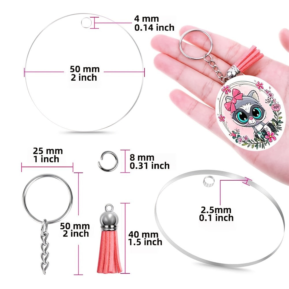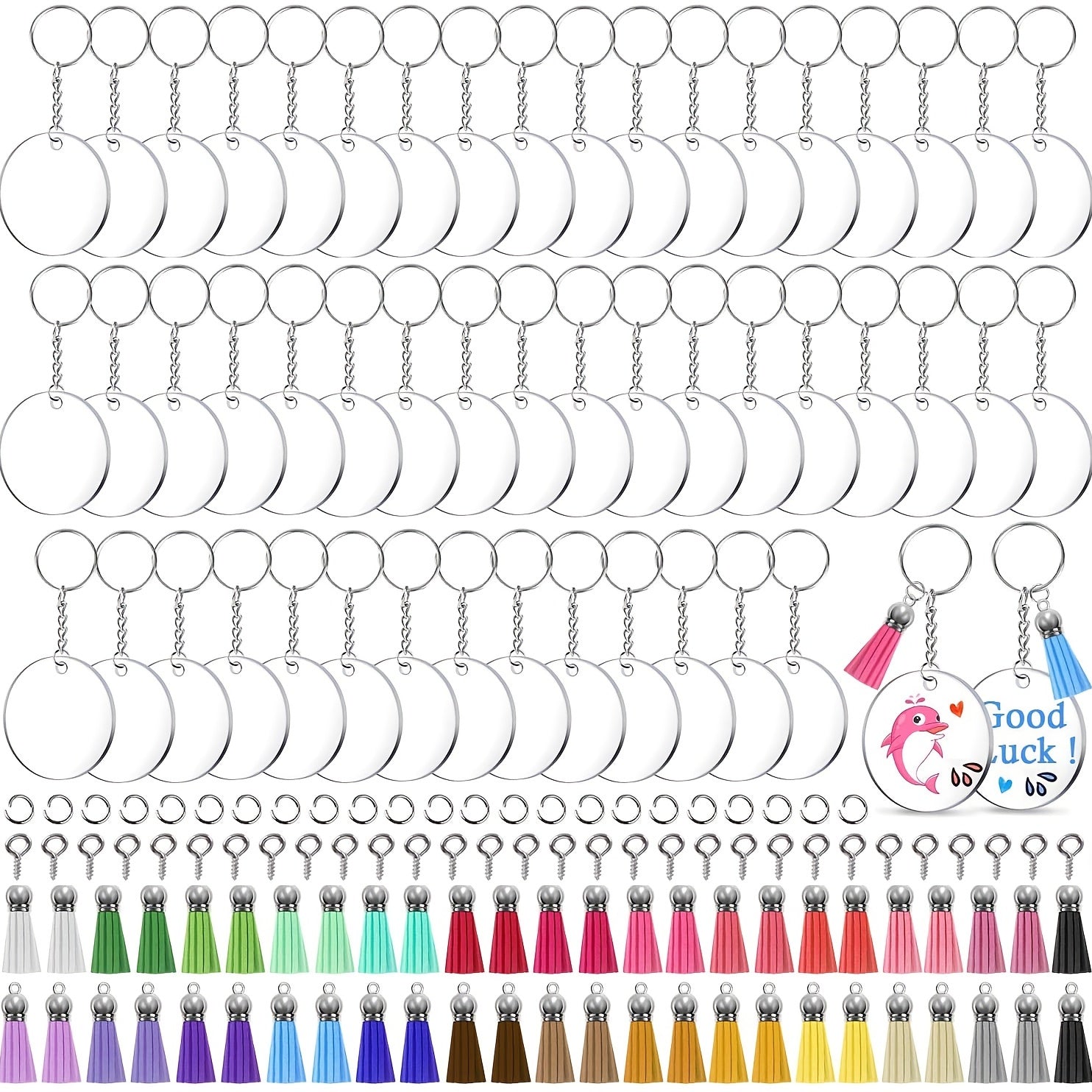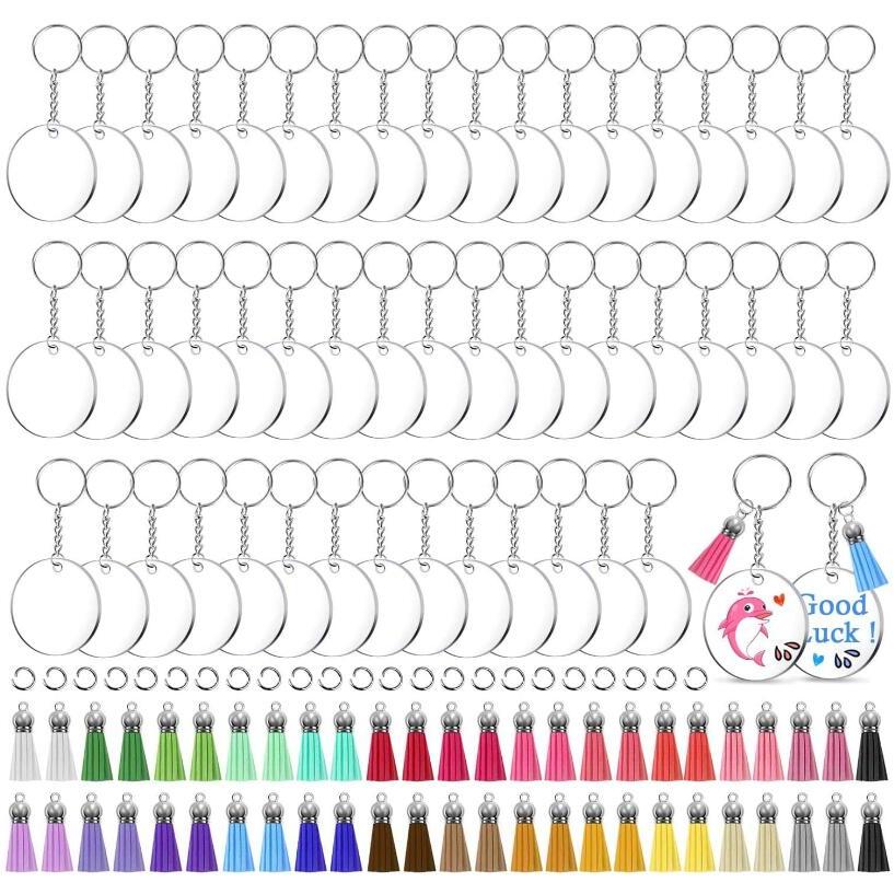 This set includes 200 clear acrylic keychain blanks, 50 tassels, 50 key rings with chains, and 50 jump rings for a variety of crafting projects.
