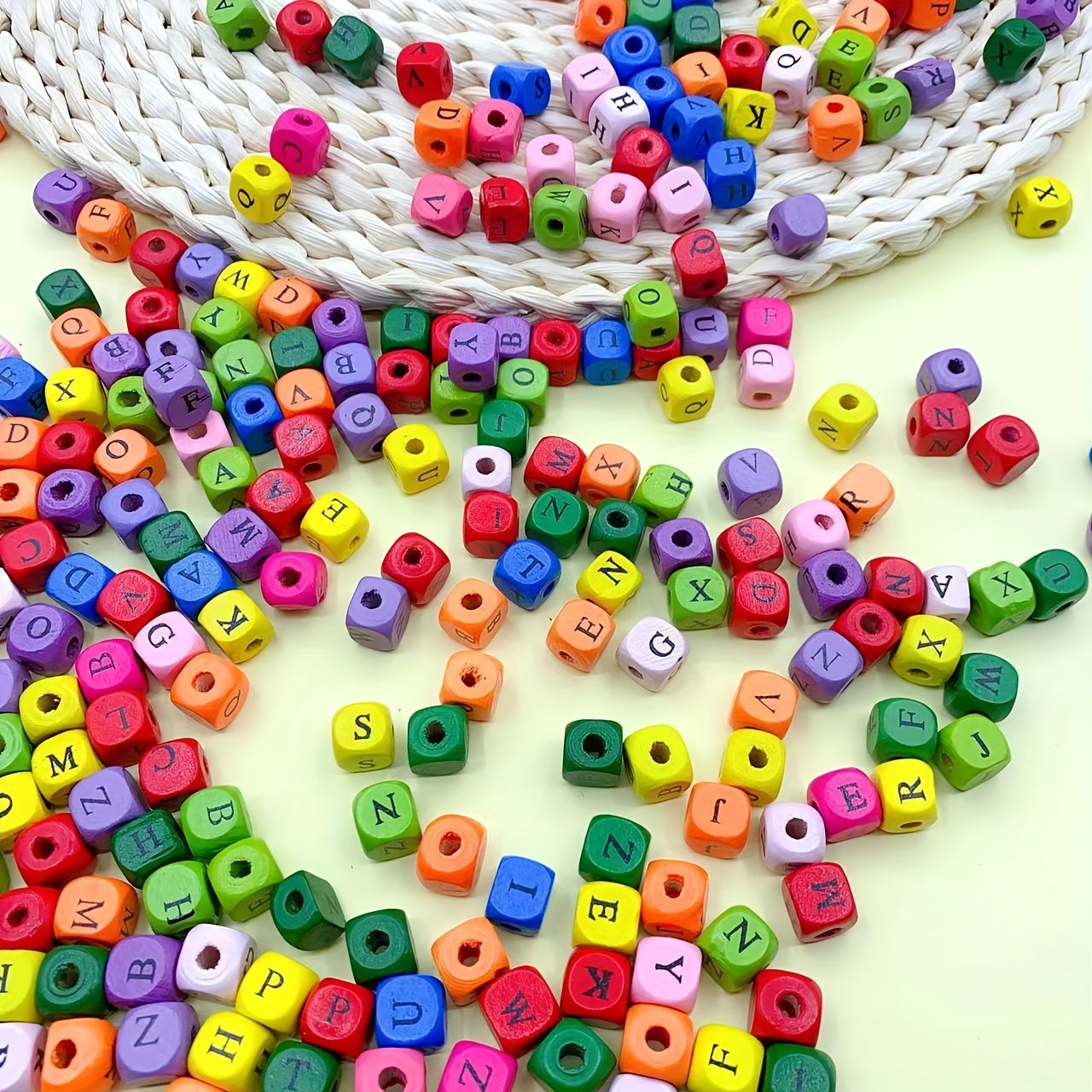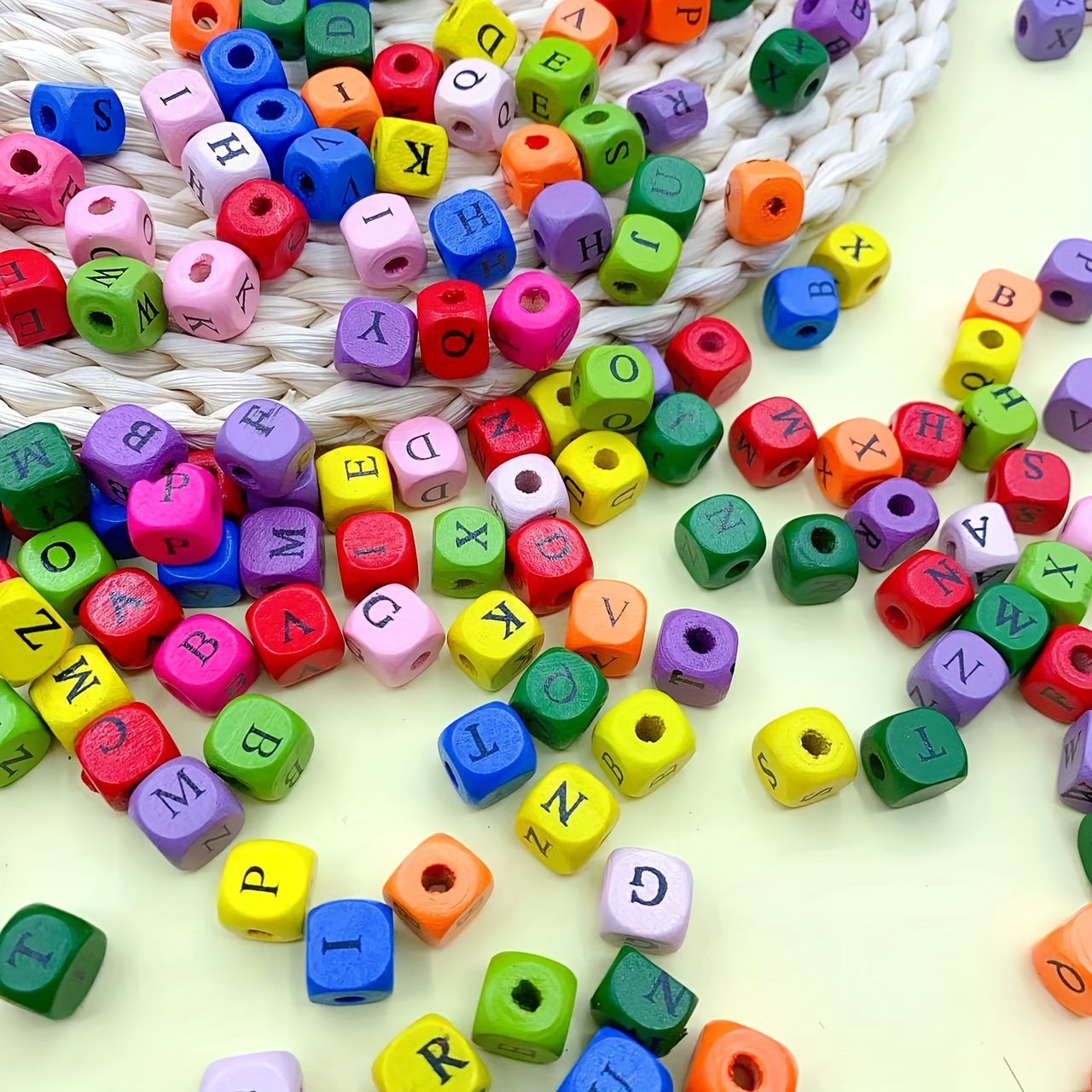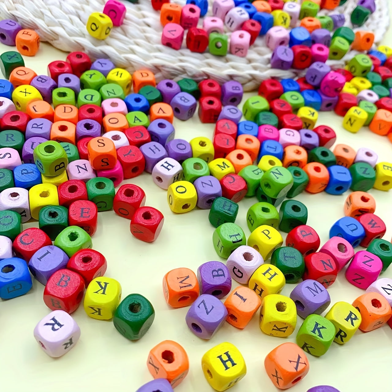These square wooden beads are perfect for DIY jewelry making. Each bead is dyed with a vibrant color and features one of the 26 letters of the alphabet. Use them to create personalized bracelets, necklaces, or keychains.