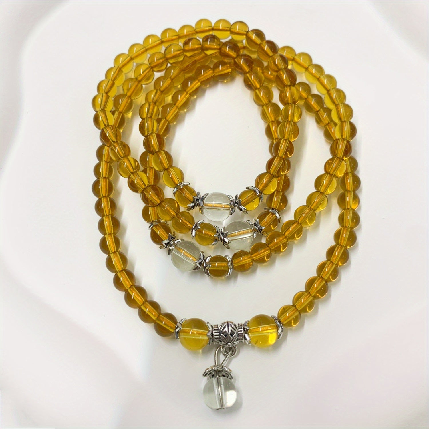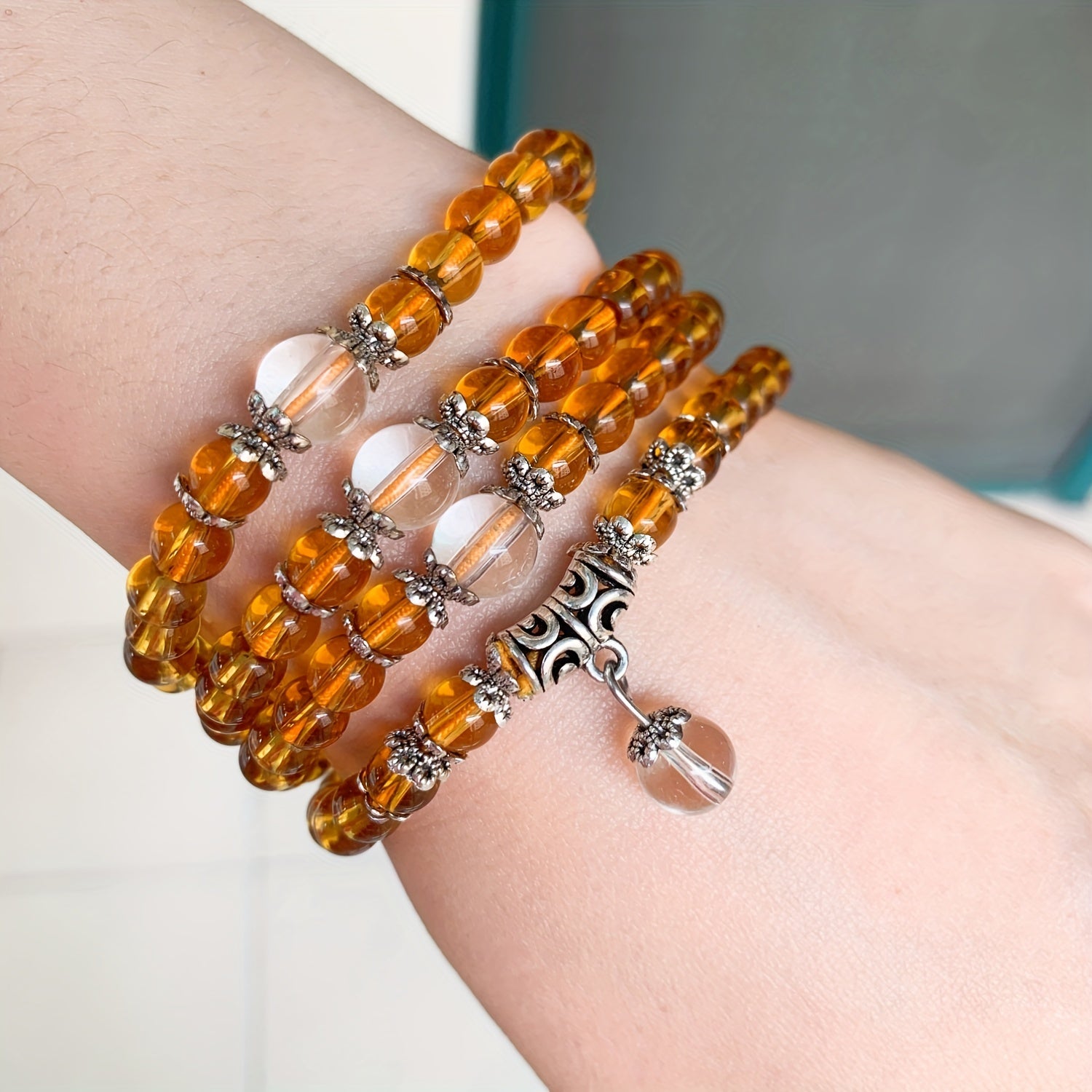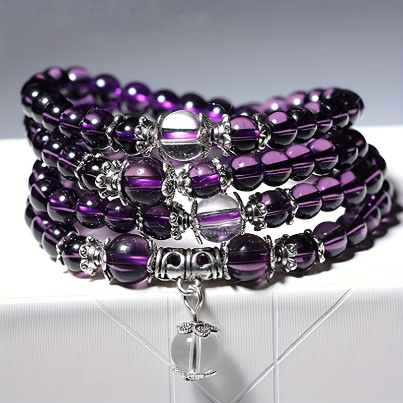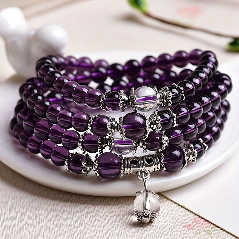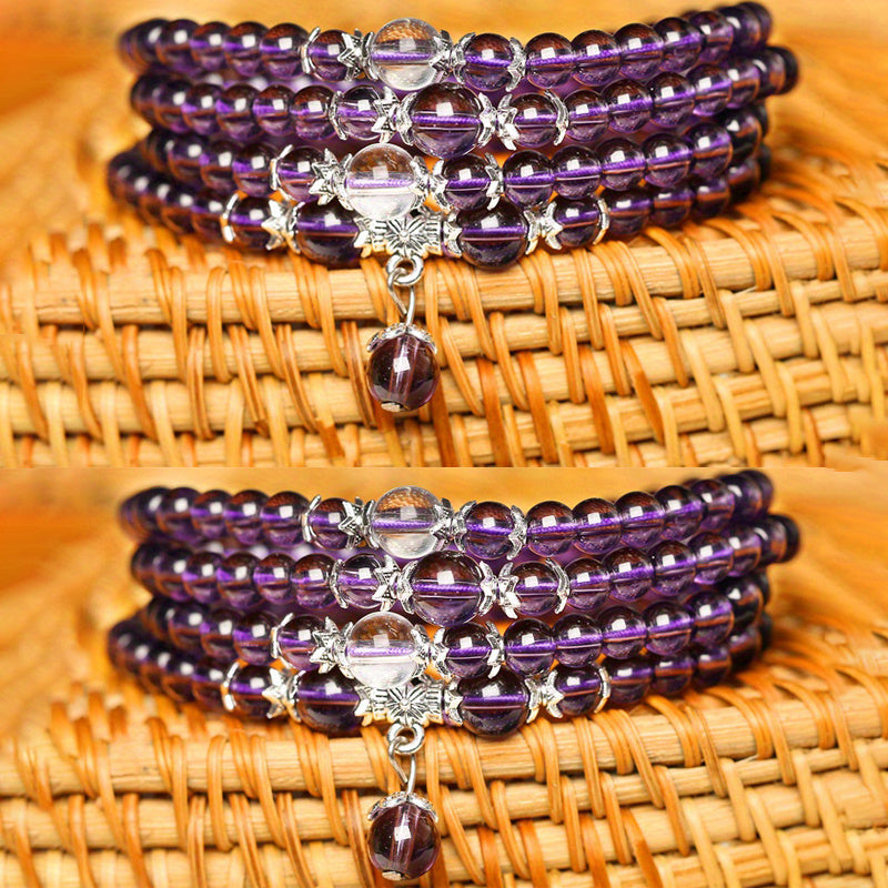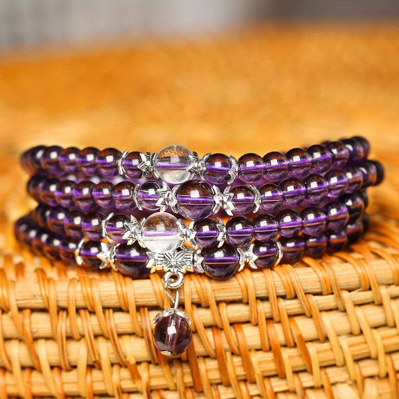 This stylish bracelet features 6mm long elastic crystal stone beads made of genuine amethyst. It is designed to fit both men and women and adds a touch of elegance to any outfit.