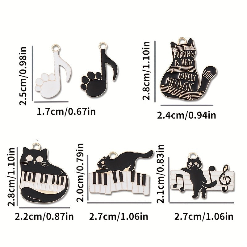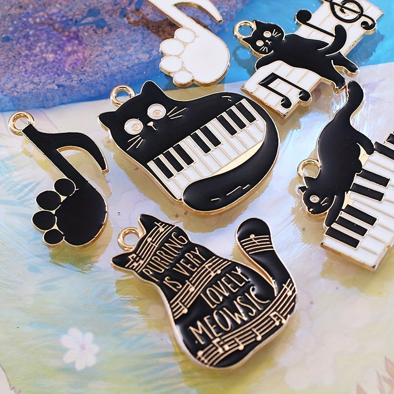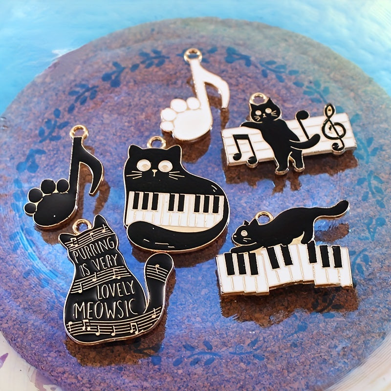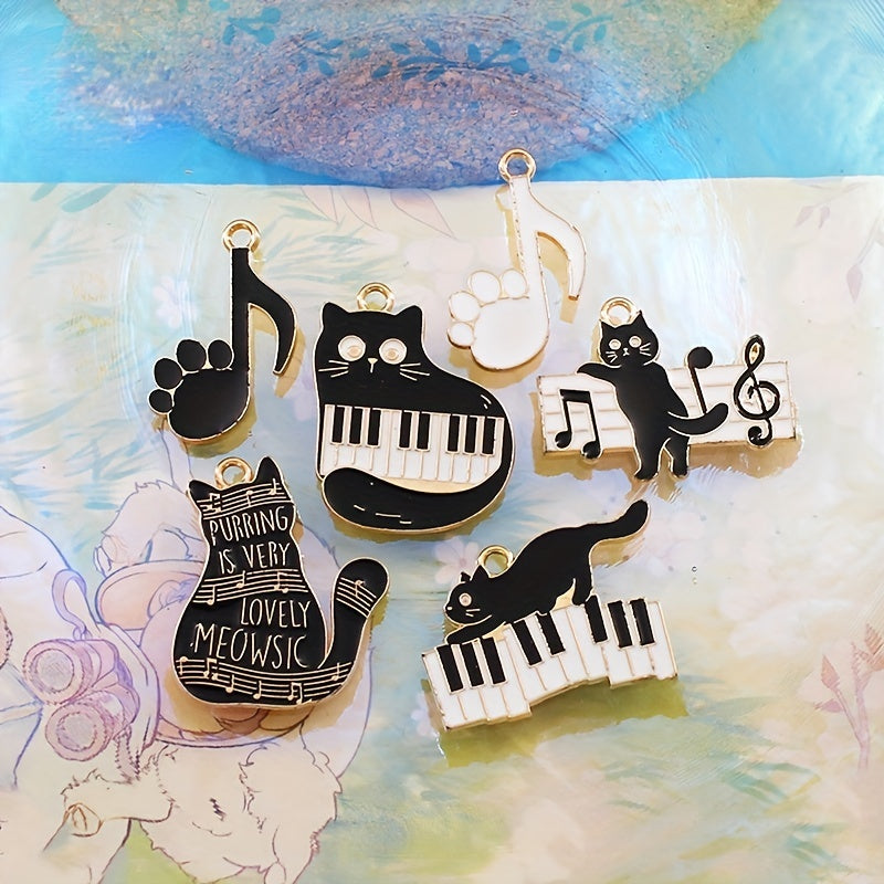 Create your own unique jewelry with this set of 6 cute mixed cartoon cat musical note pendants. Perfect for bracelets, necklaces, key chains, earrings, and anklets.