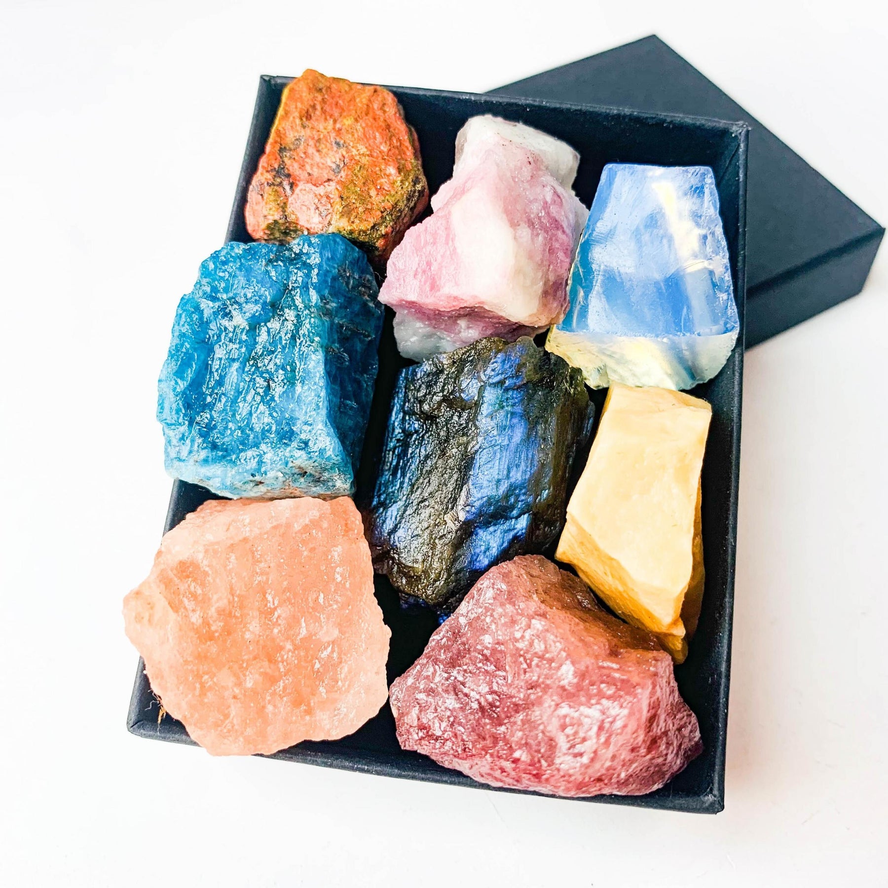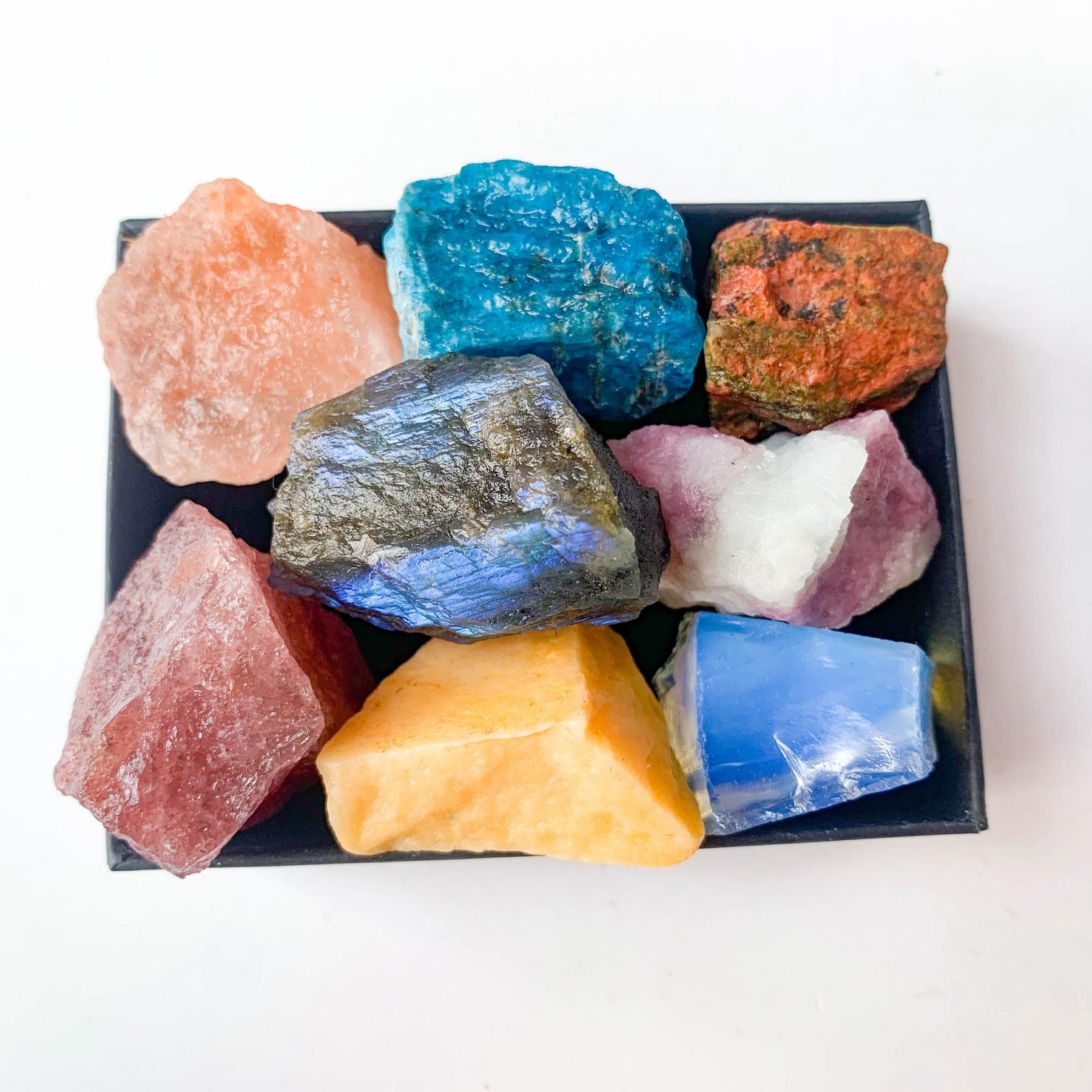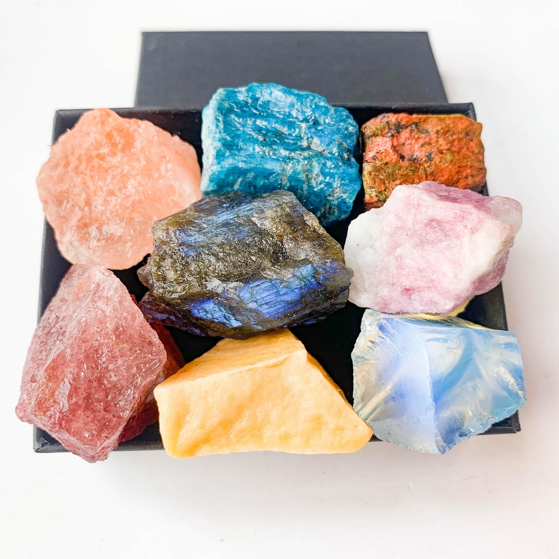 Discover the power of rare crystals with this set of 8 large chakra healing stones. Each crystal has unique properties to bring balance and positive energy to your life. Perfect for yourself or as a thoughtful gift for a loved one.