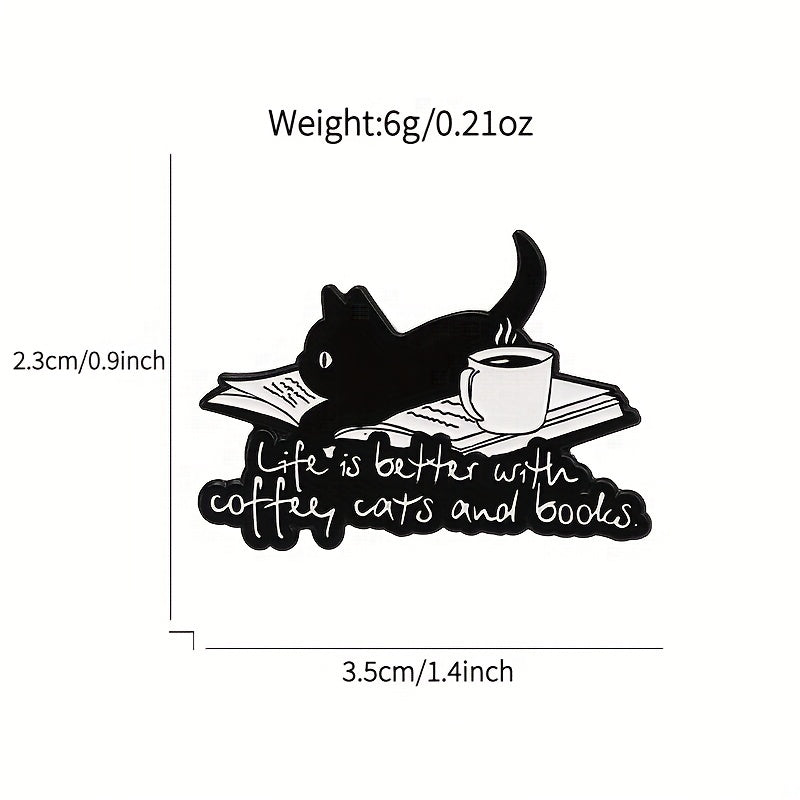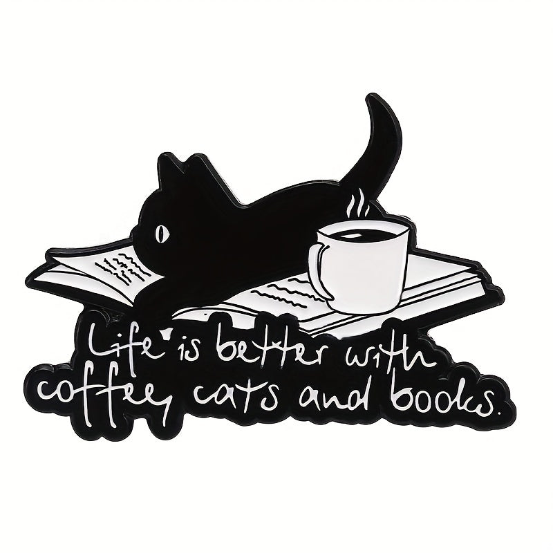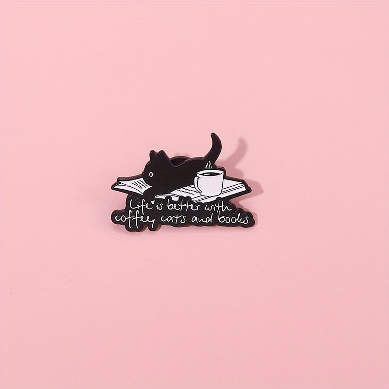 Get this cute cartoon lapel brooch featuring a cat, coffee, and book design. Perfect for jackets and jeans.