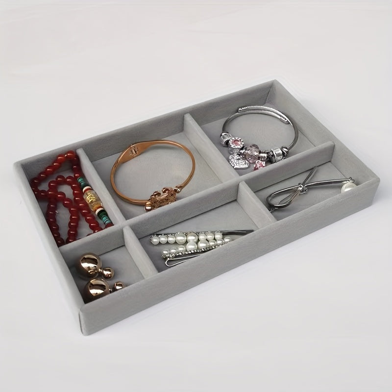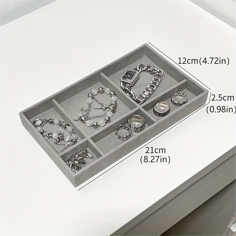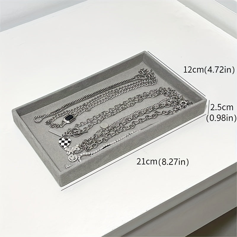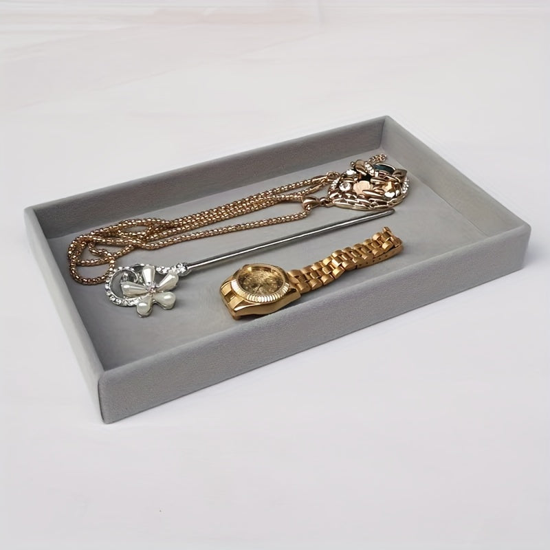 Keep your earrings organized and dust-free with this elegant gray velvet jewelry plate. It features a drawer for convenient storage and display.