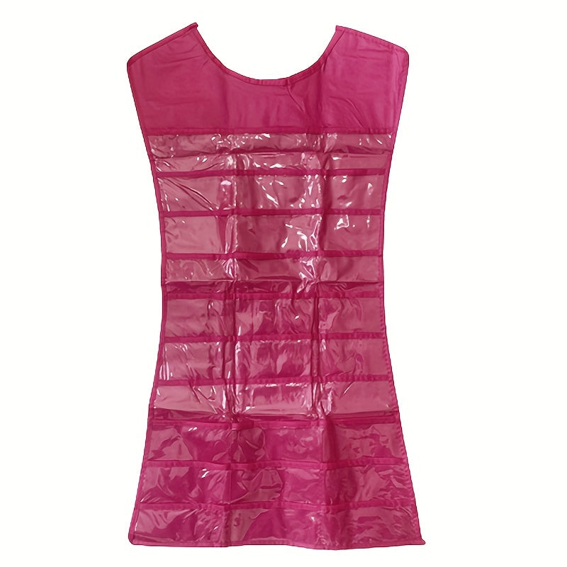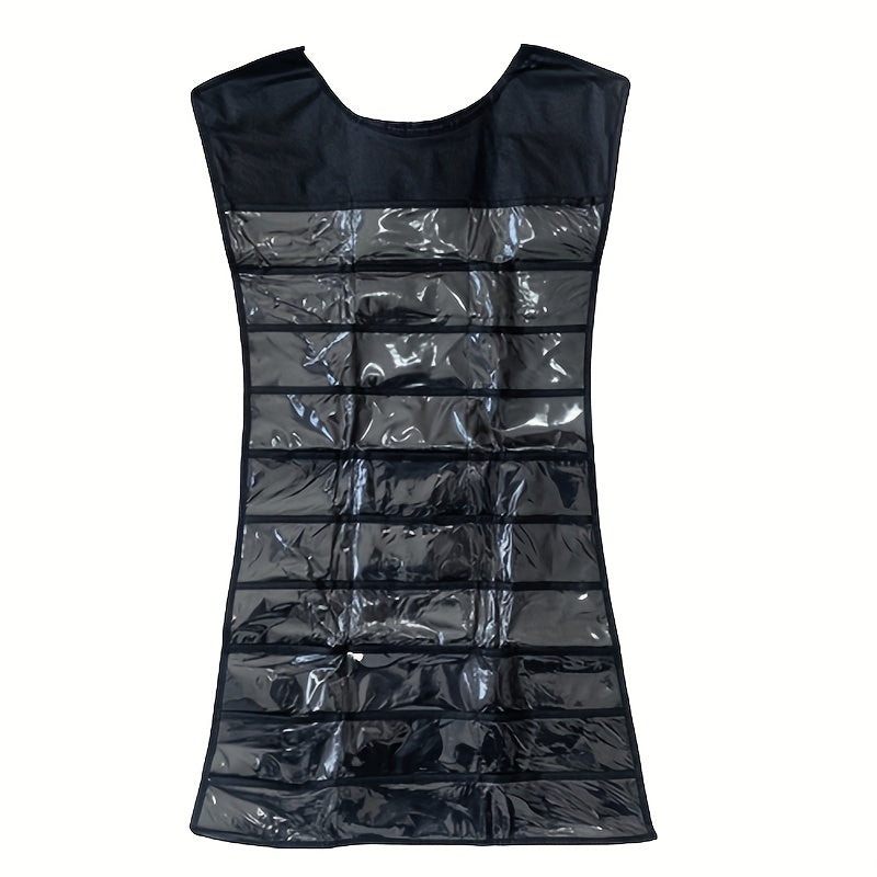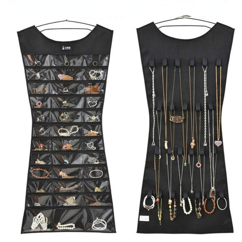 Keep your jewelry neat and organized with this hanging storage bag that features compartments for necklaces, bracelets, earrings, rings, and more. No hanger included.
