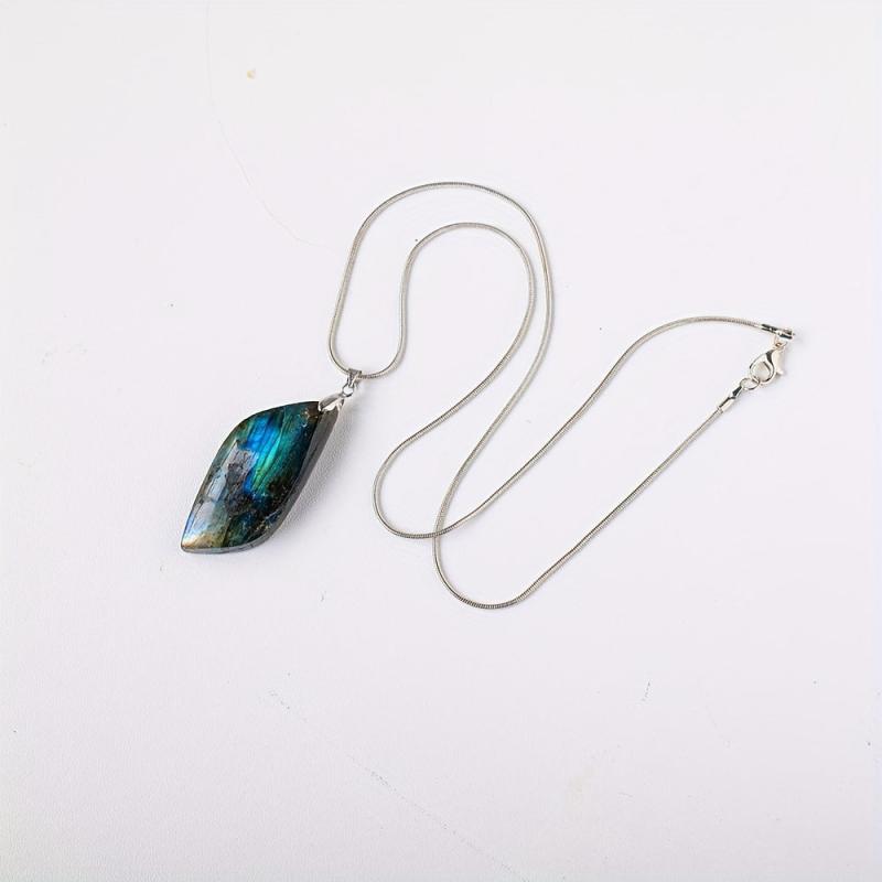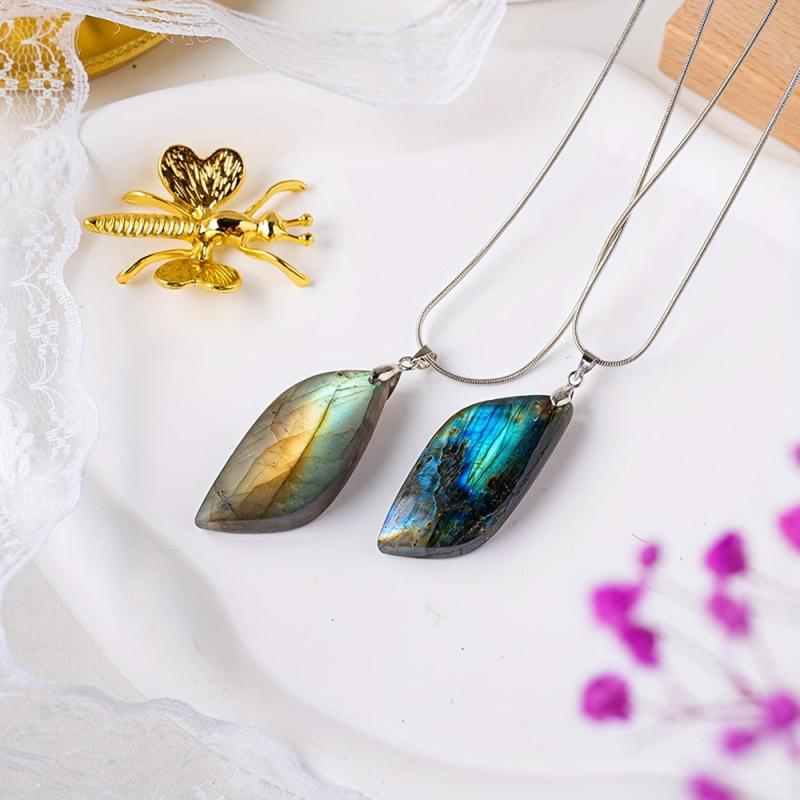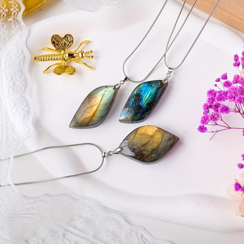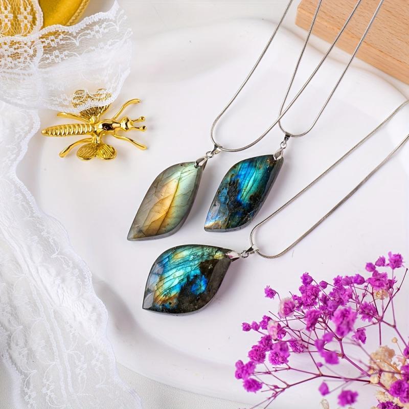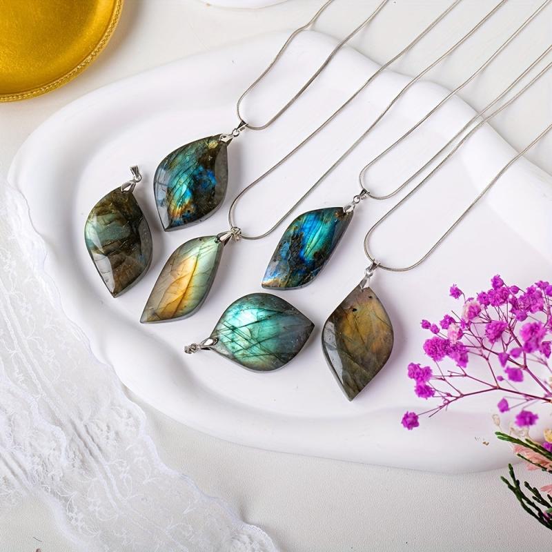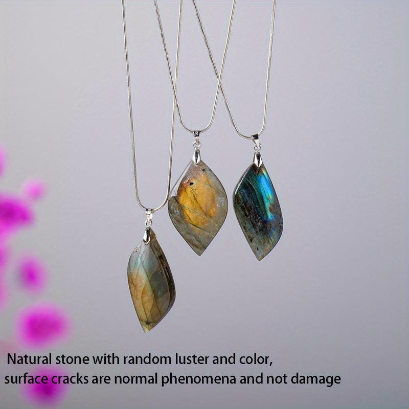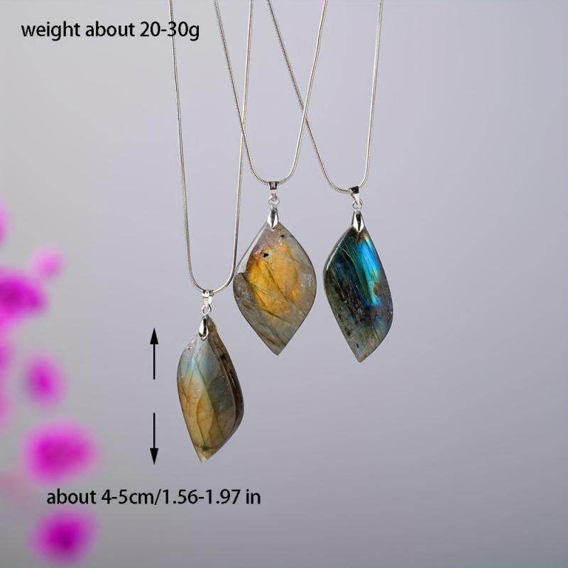 This natural Labradorite leaf-shaped stone pendant is perfect for creating unique DIY jewelry or ornaments. The polished finish adds a touch of elegance to any project.