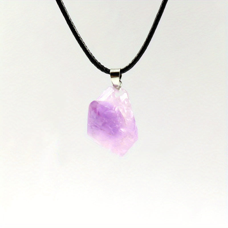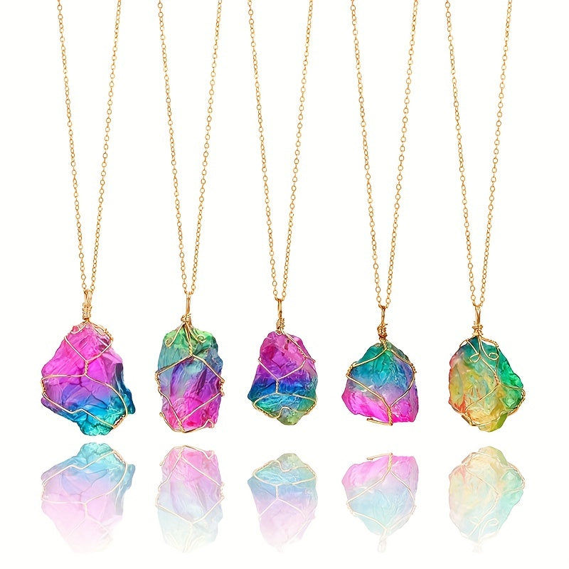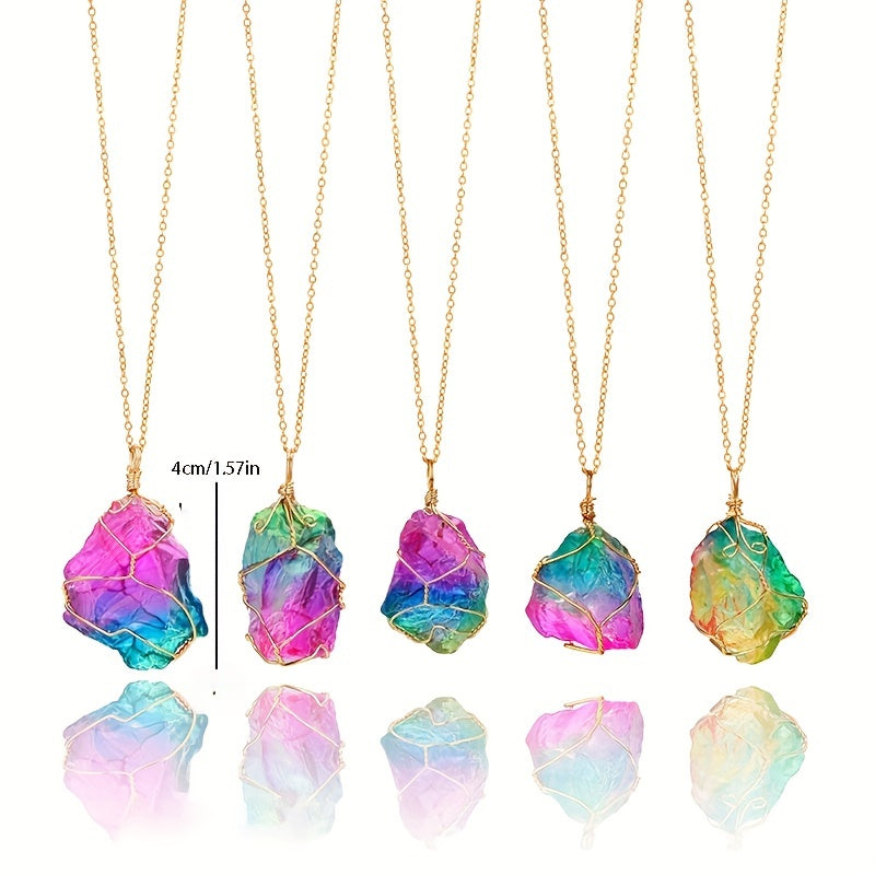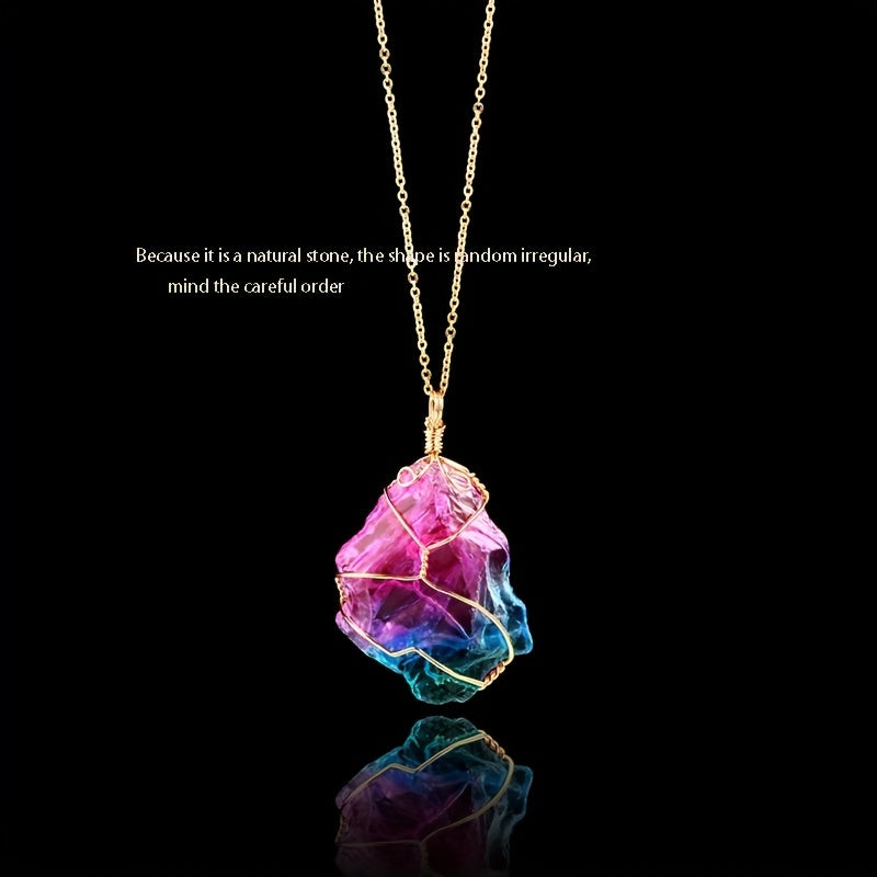 This pendant features a natural raw stone wrapped in wire, showcasing seven vibrant colors. Each pendant is unique and makes a stunning accessory.