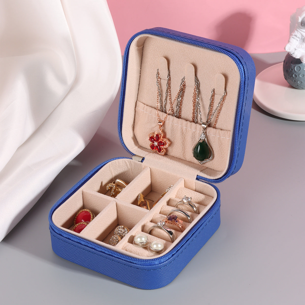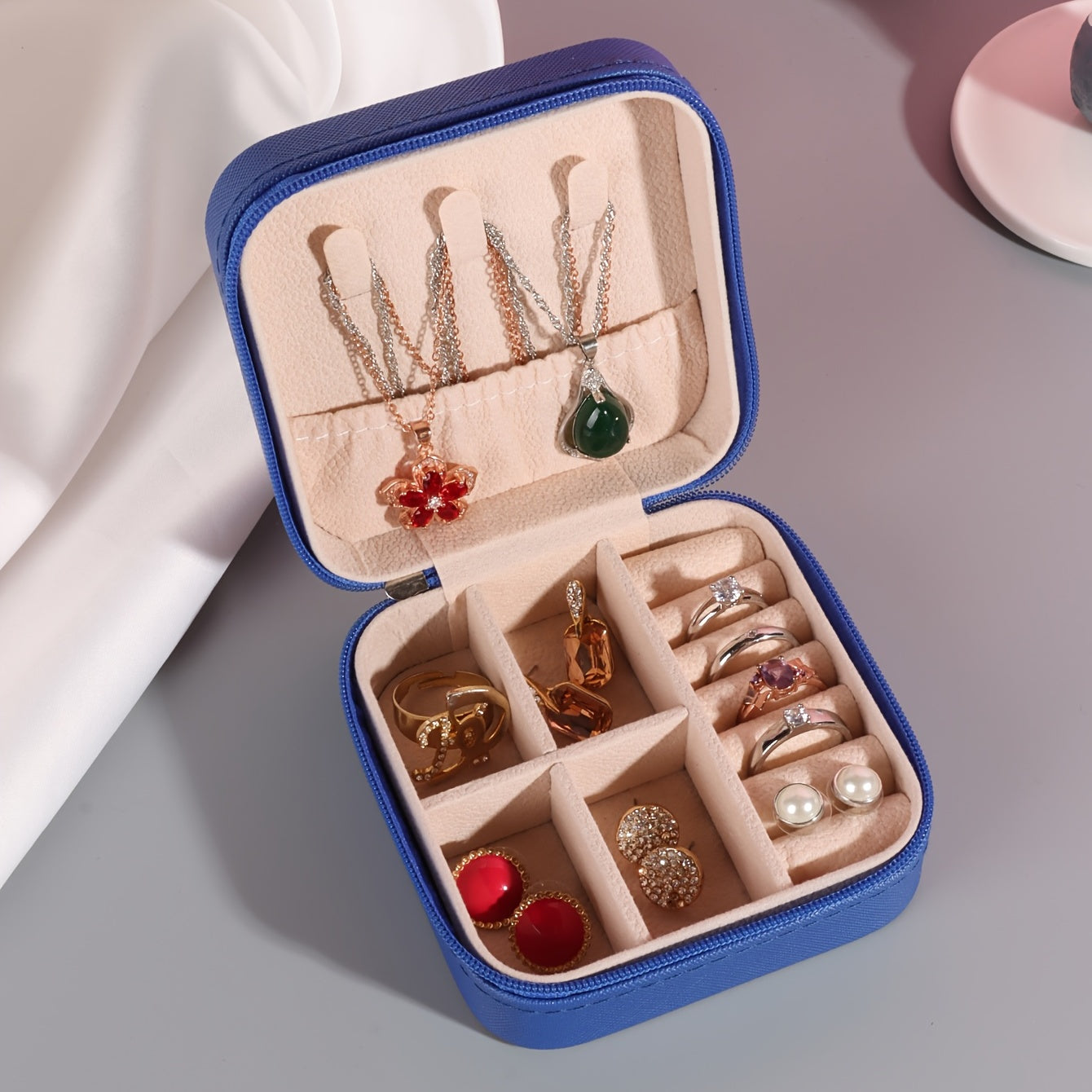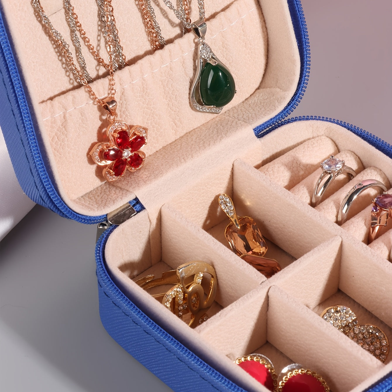 This jewelry box is made of high-quality PU leather, featuring a zipper closure for secure storage of earrings, rings, necklaces, and more.