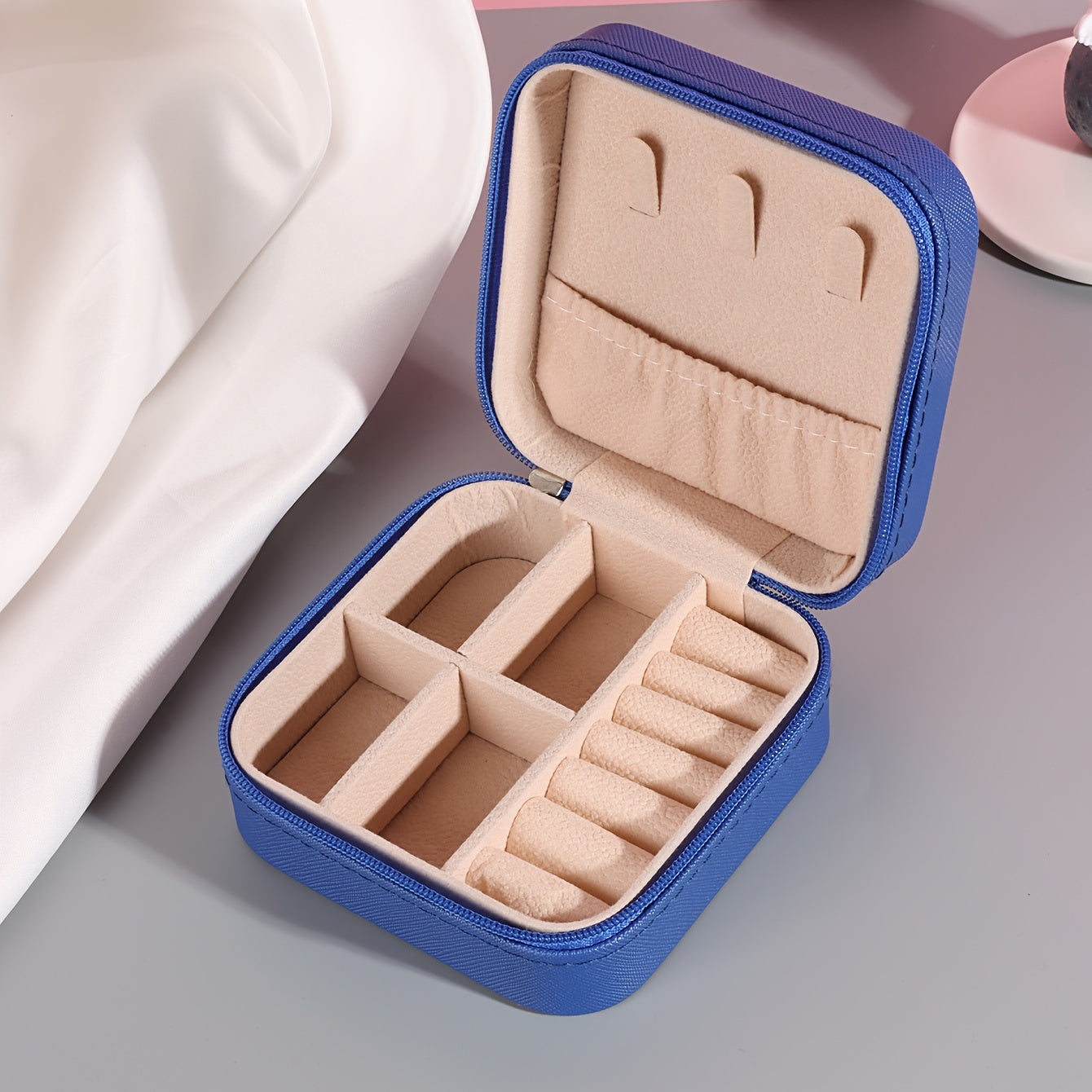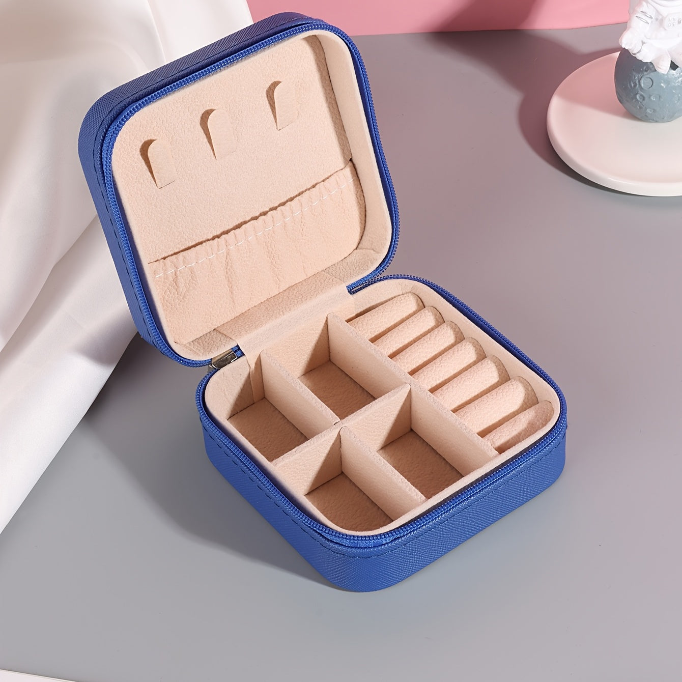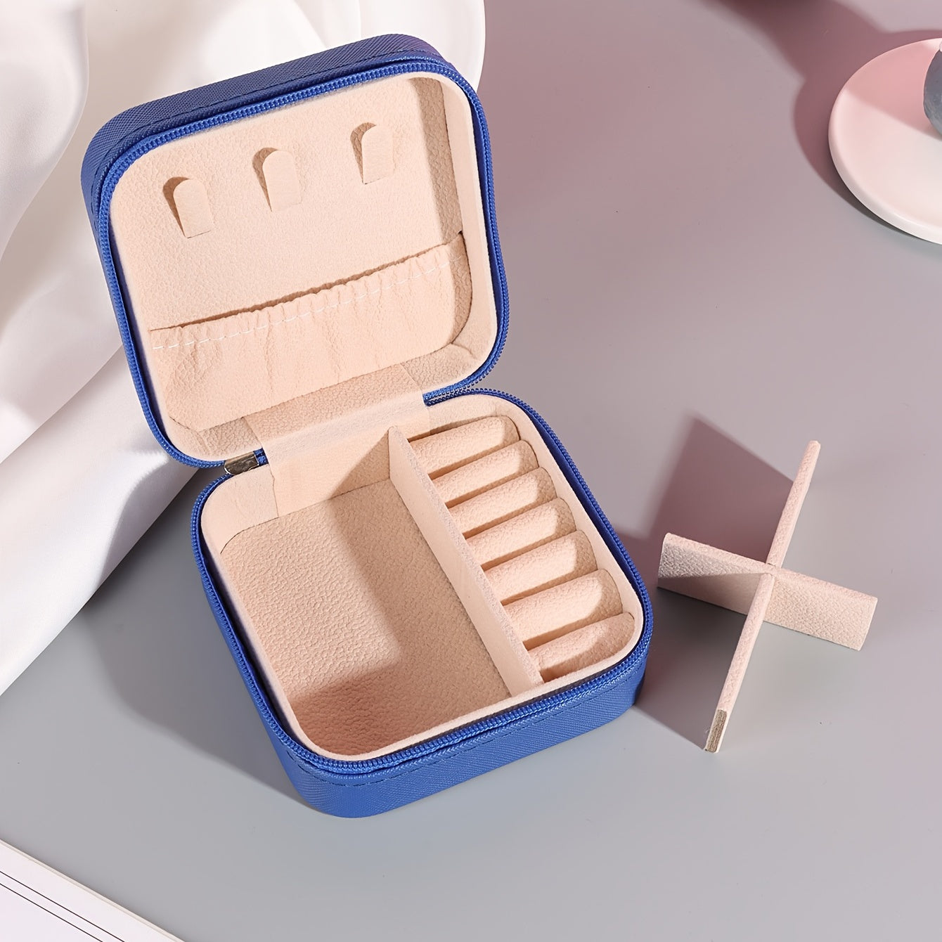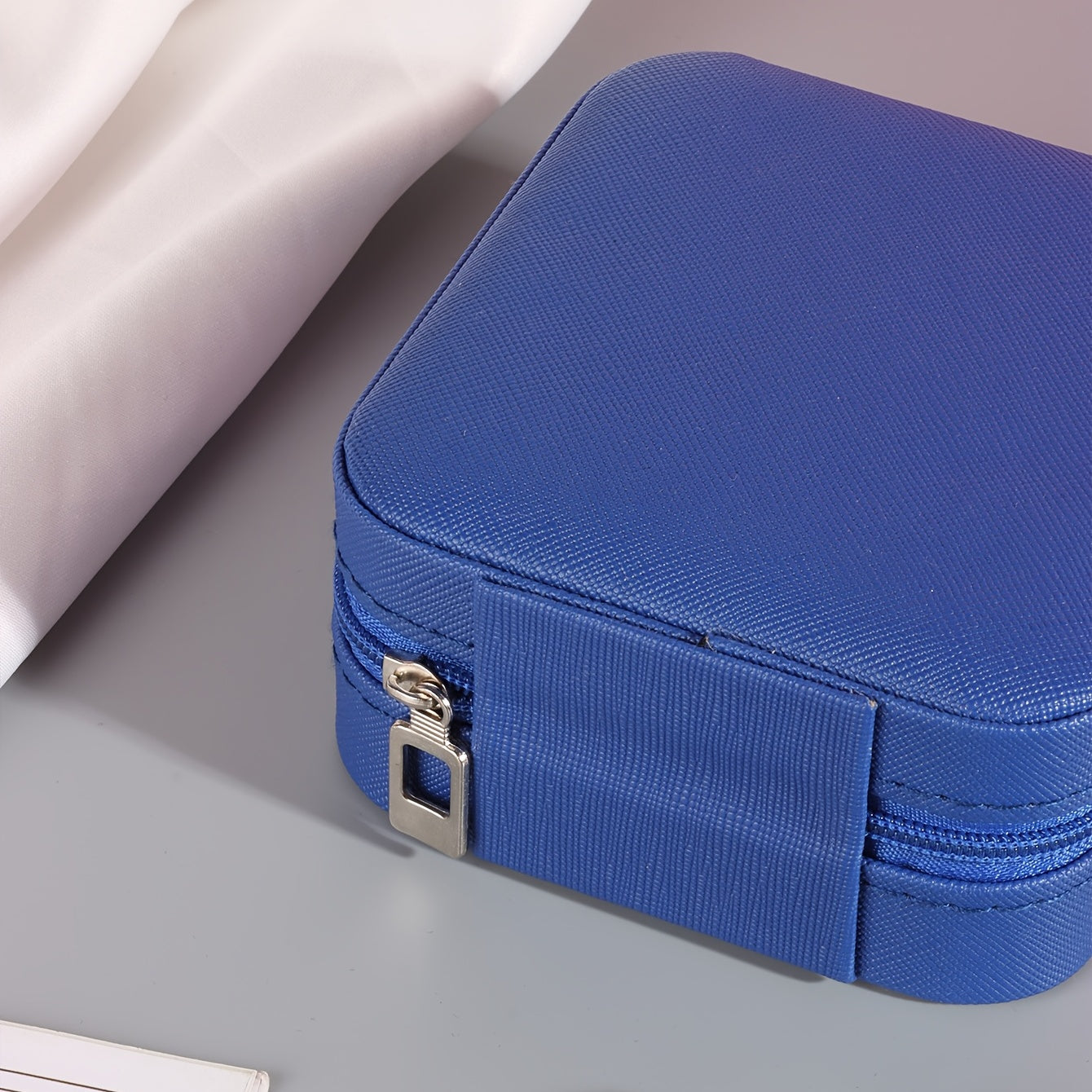 This jewelry box is made of high-quality PU leather, featuring a zipper closure for secure storage of earrings, rings, necklaces, and more.