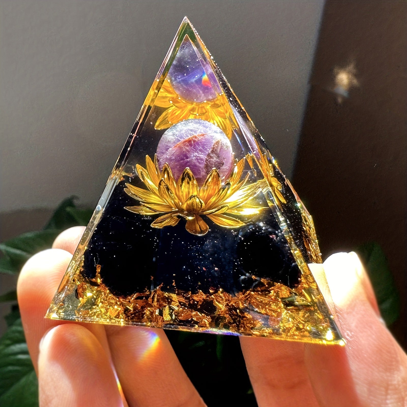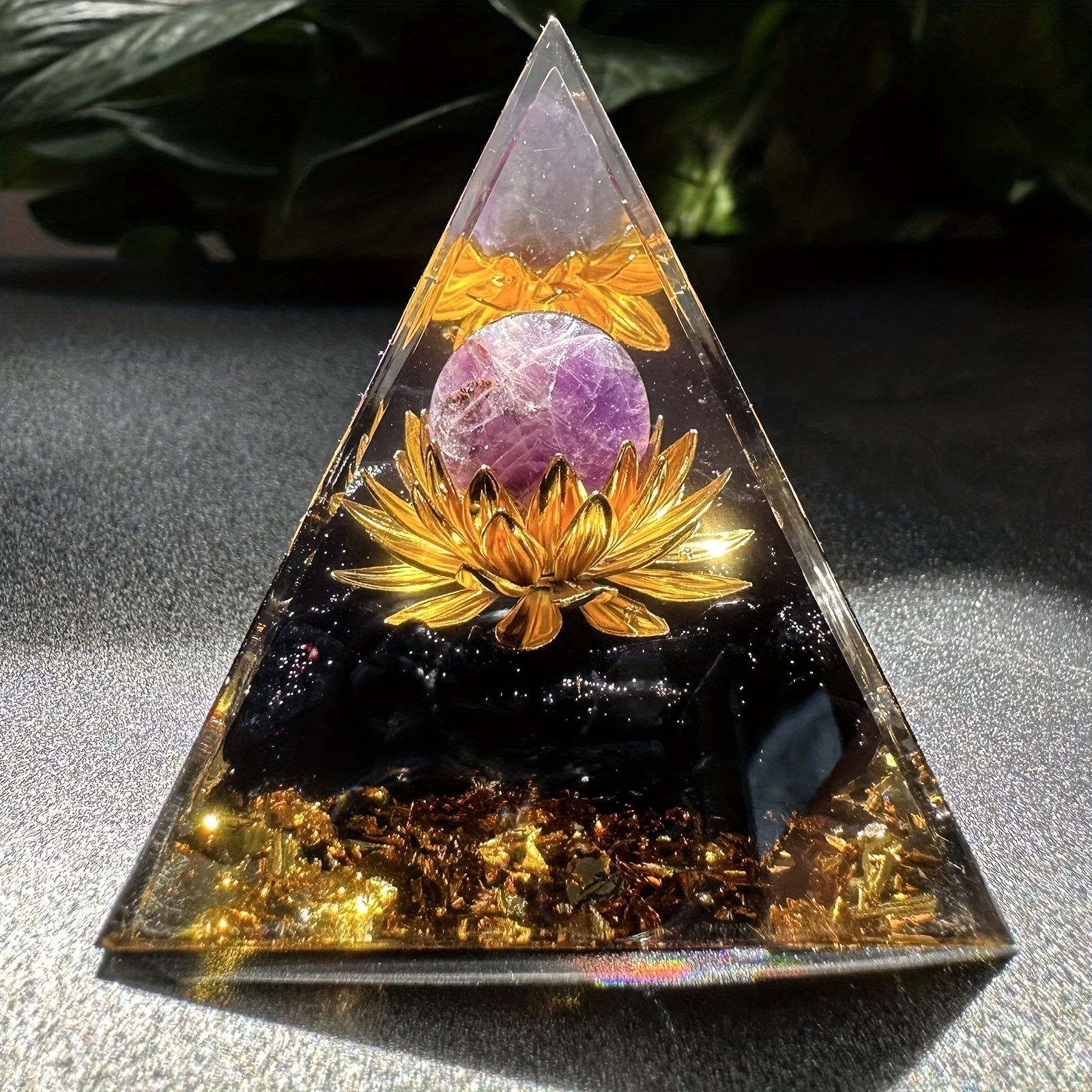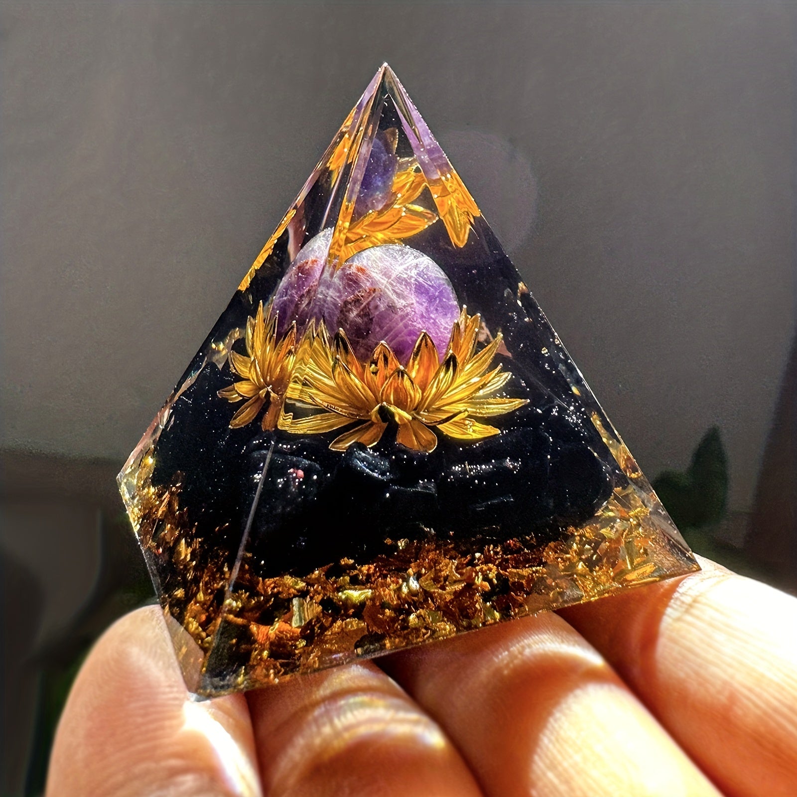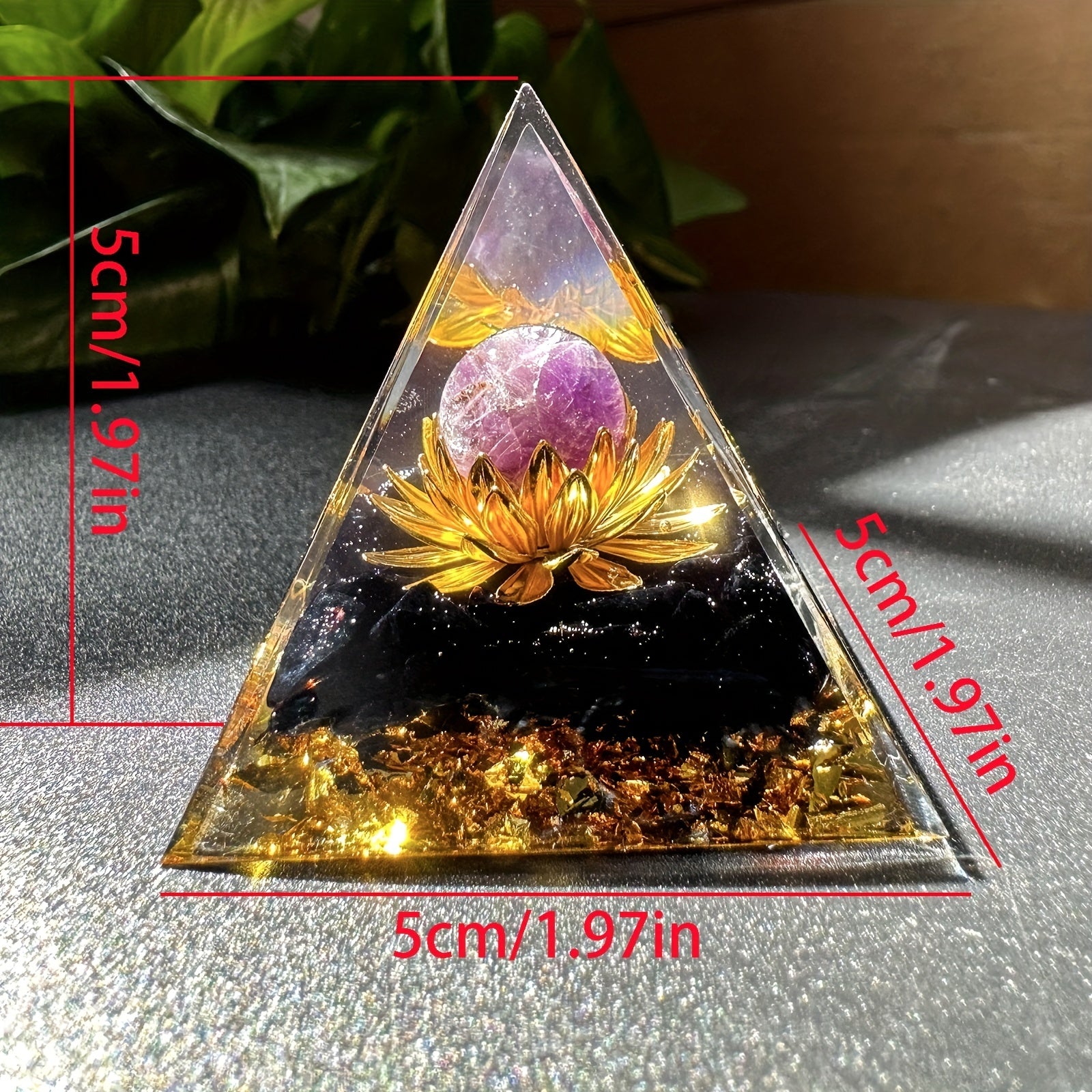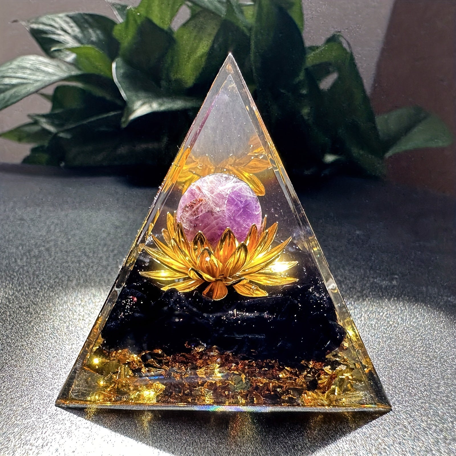 Harness the power of positive energy with this orgone pyramid featuring an amethyst crystal ball. Perfect for stress reduction, healing, meditation, and wealth attraction. Enhance your home decor with this unique piece.