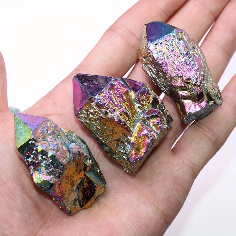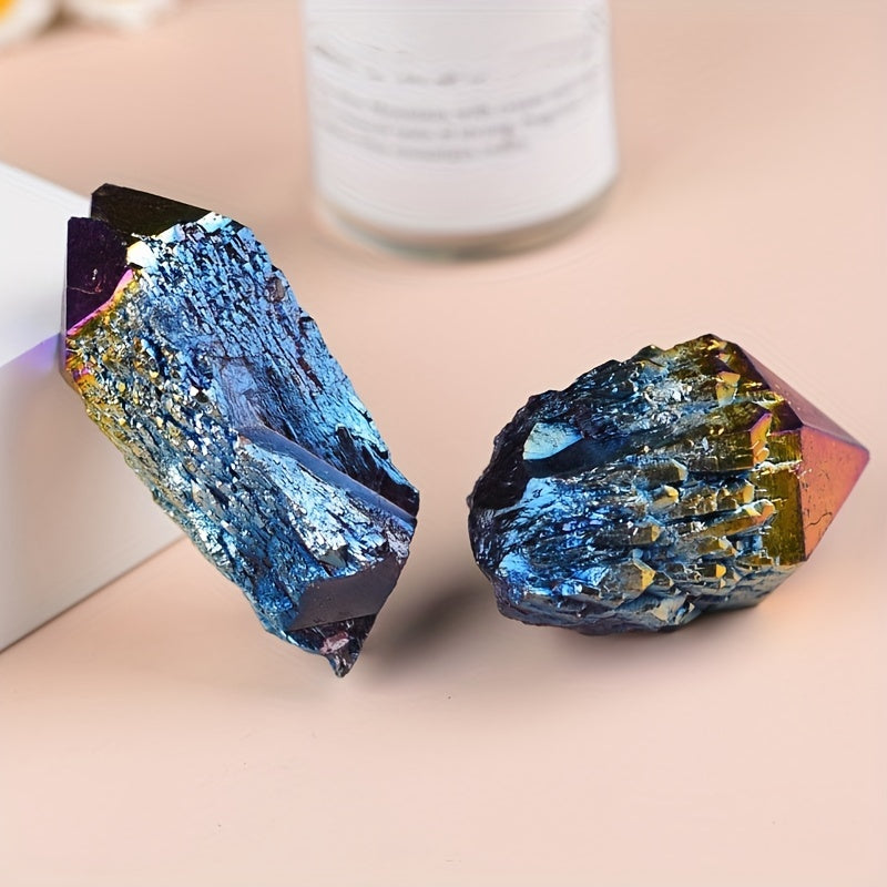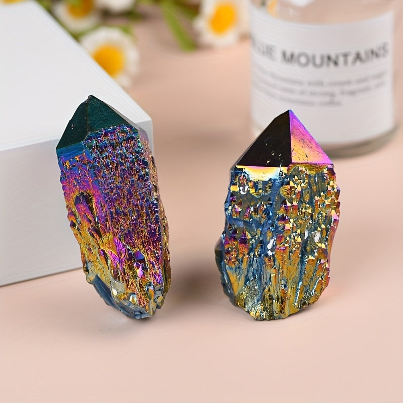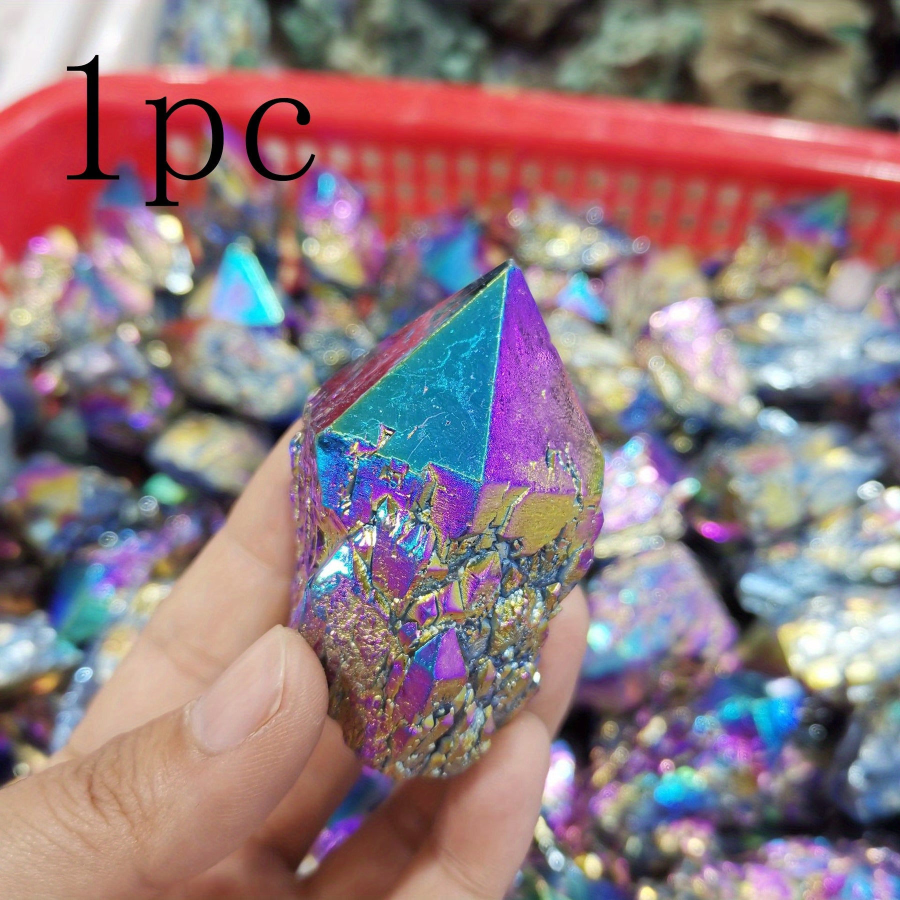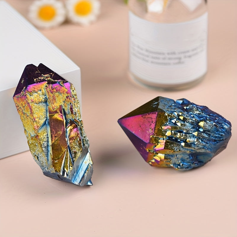 Add a touch of color and sparkle to your space with this rainbow electroplated crystal cluster. Each crystal reflects a spectrum of colors, creating a mesmerizing visual display.