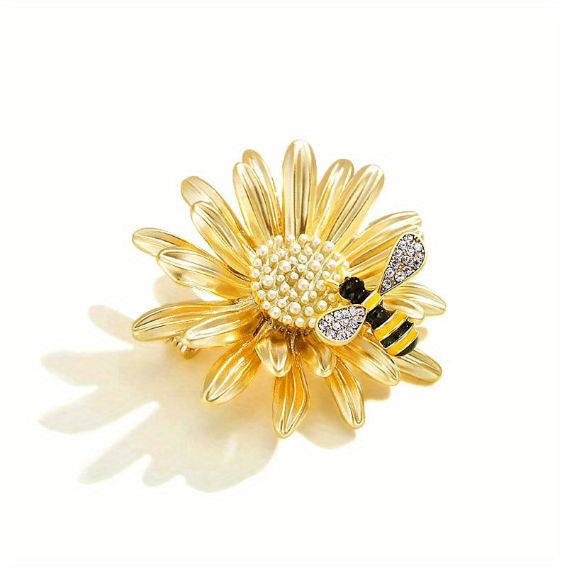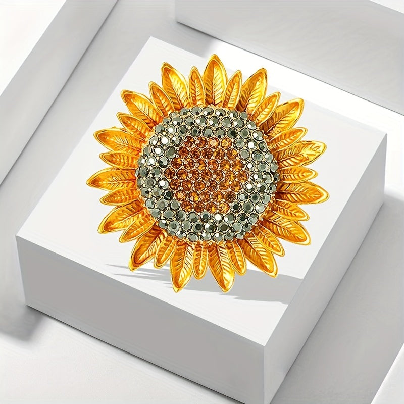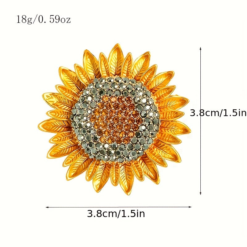 Adorn your outfit with this delicate sunflower brooch pin featuring a yellow enamel design and rhinestone accents. The metal pin back includes a locking mechanism for secure wear.