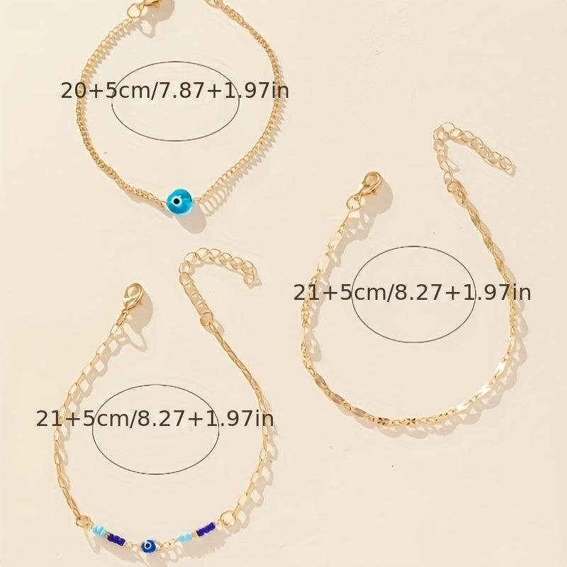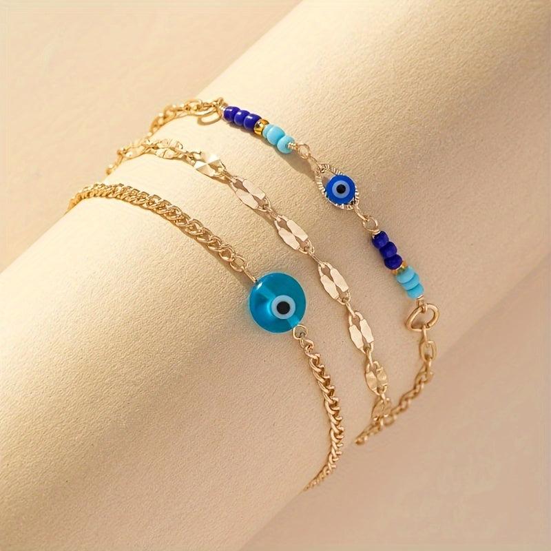 Embrace the beach vacation style with this set of 3 ankle bracelets featuring evil eye charms. Perfect for adding a boho chic touch to your summer outfits.