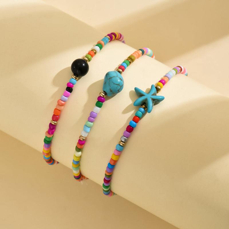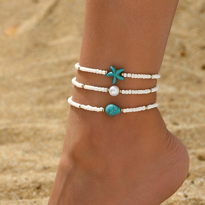 Add a touch of summer beach vacation style to your look with this 3-piece set of glass bead anklets featuring synthetic turquoise and colorful beads. The anklets are made with stretch elastic ropes for easy wear and stacking.