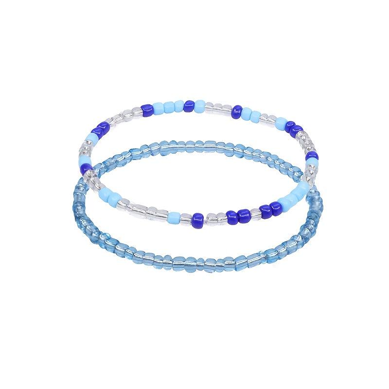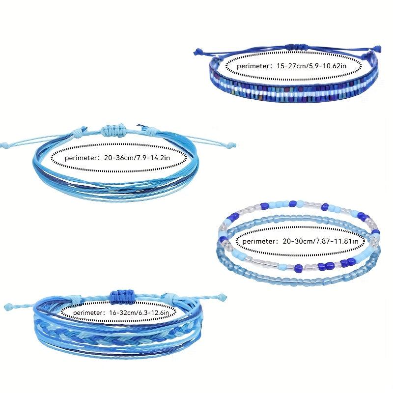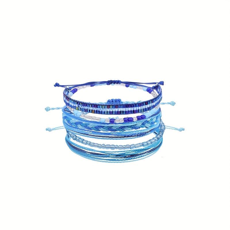This set includes 5 colorful braided bracelets and anklets that are perfect for beachwear. They are waterproof and adjustable, making them ideal for everyday wear.
