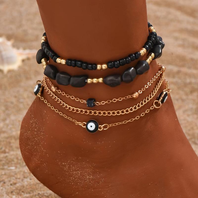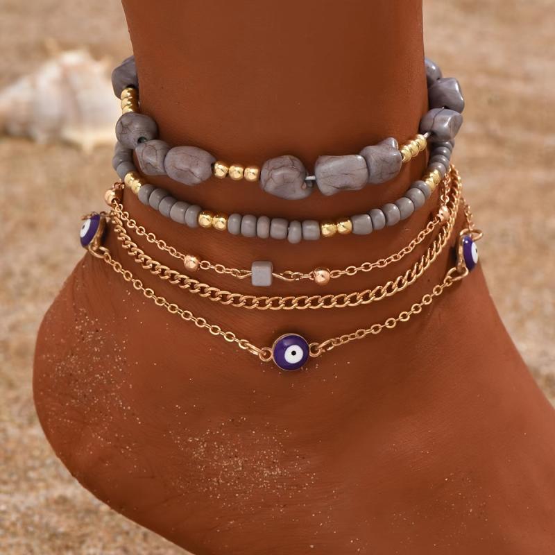 Adorn your feet with this Bohemian 5-piece anklet set featuring irregular stones and evil eye bead charms. Perfect for summer styling.