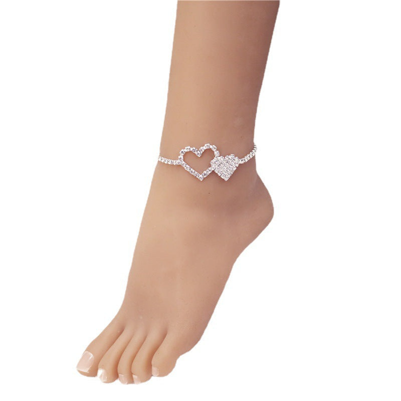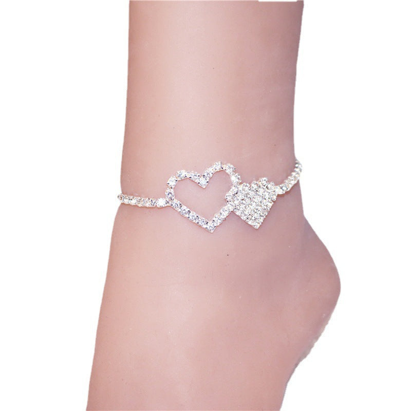 Enhance your style with this stunning double heart rhinestone anklet. Perfect for weddings and special occasions.