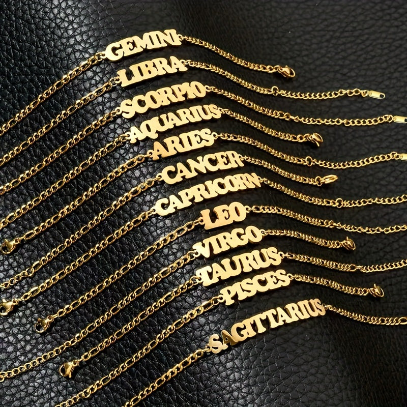 This delicate stainless steel anklet features 12 constellation charms, perfect for adding a touch of astrological style to your look. The thin chain is adjustable for a comfortable fit.
