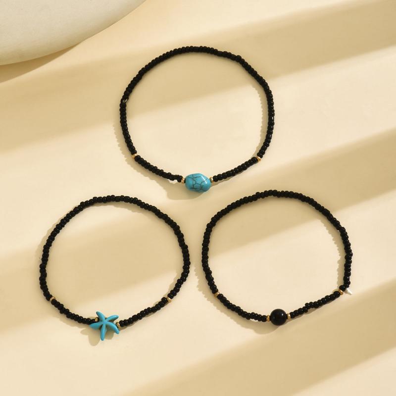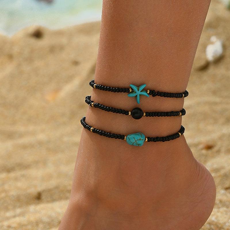This anklet set features glass beads in turquoise color with a charming starfish charm. The anklets are stretchy and elastic, perfect for layering and adding a beachy vibe to your outfit.