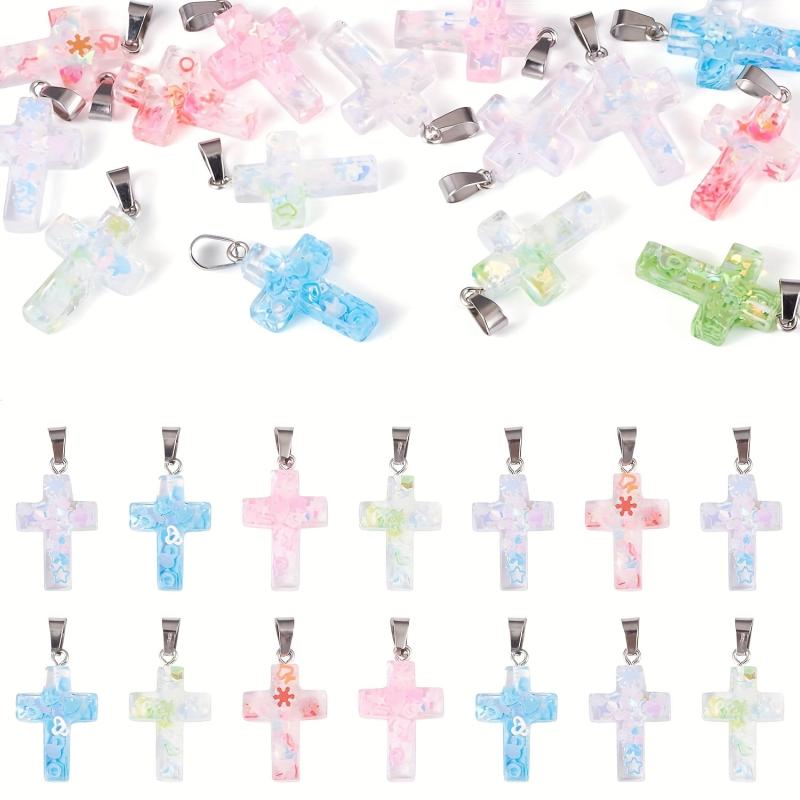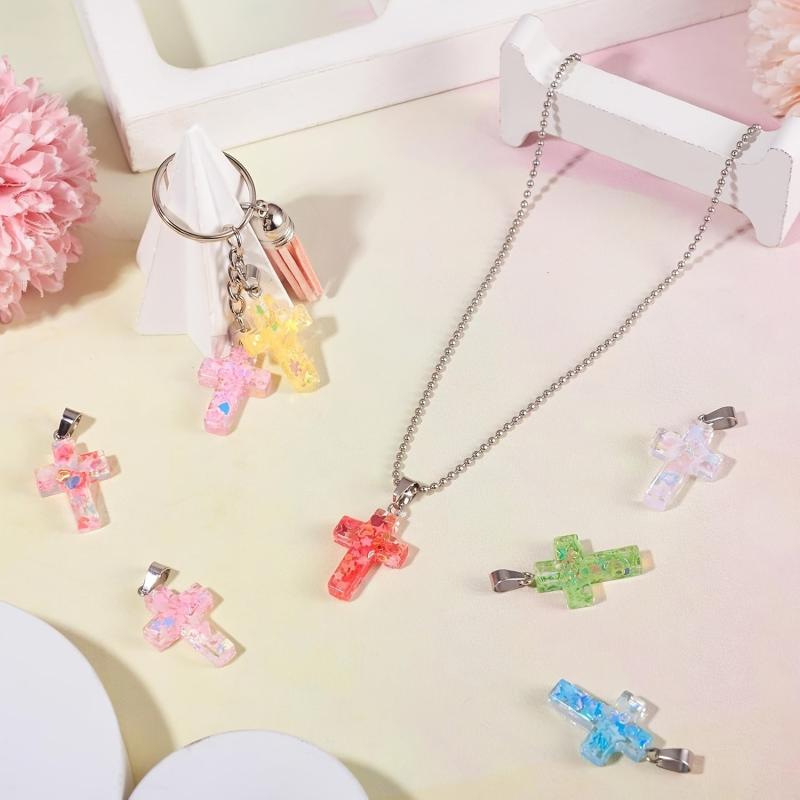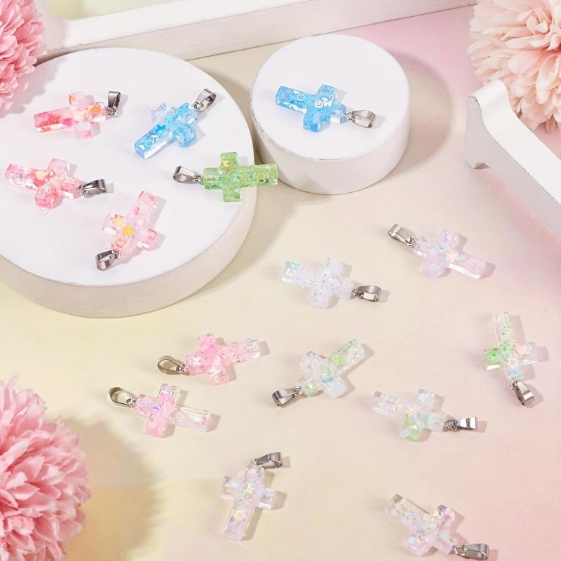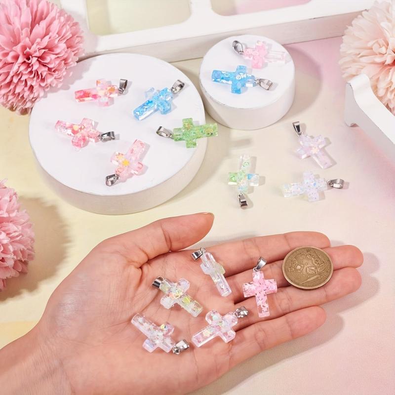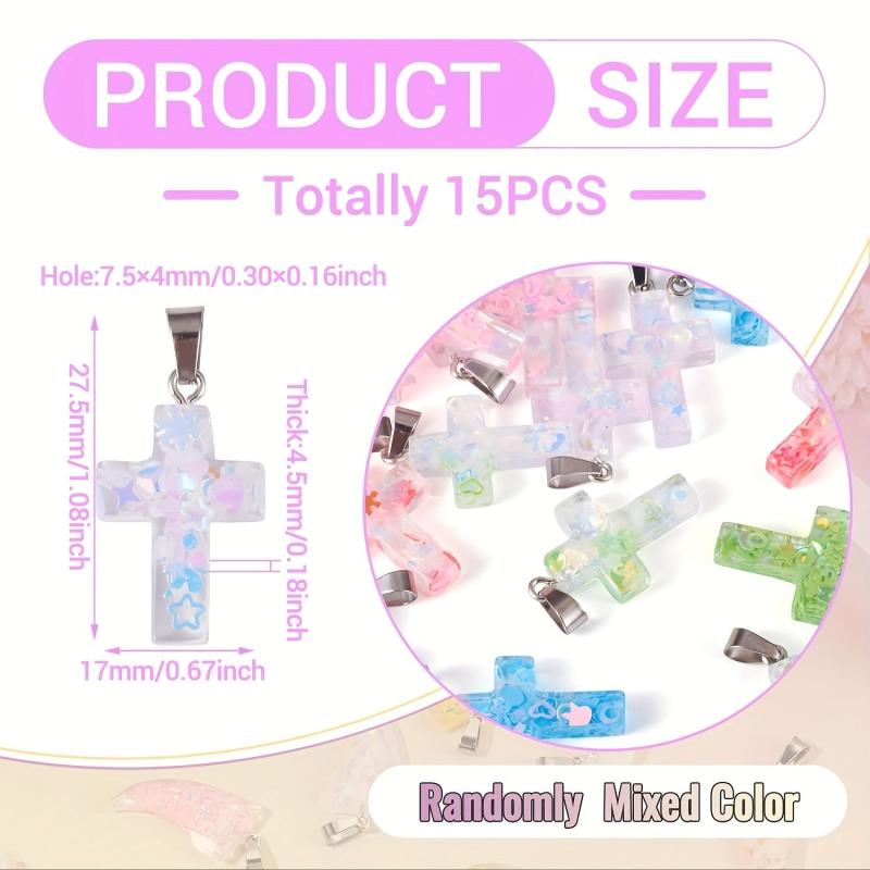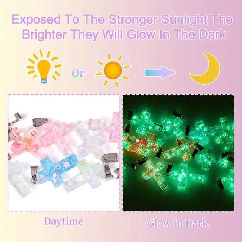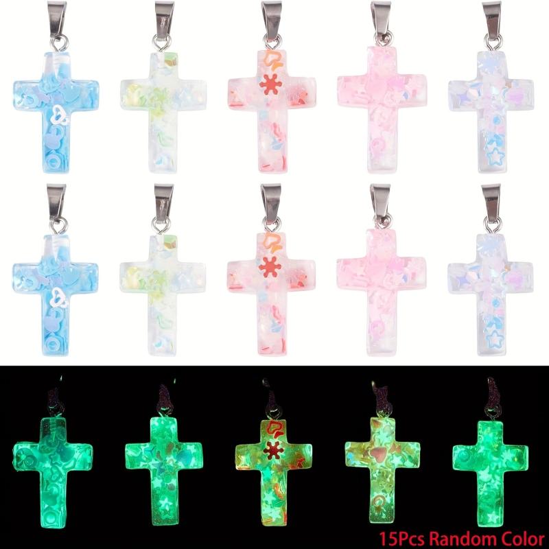 This bulk set includes 15 colorful glow-in-the-dark resin sequins cross pendants with silver hooks, perfect for DIY craft projects. Create your own unique necklaces that light up in the dark!