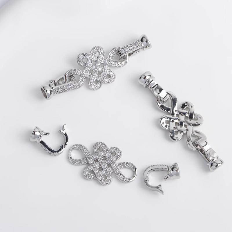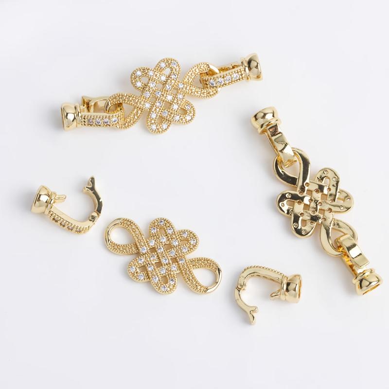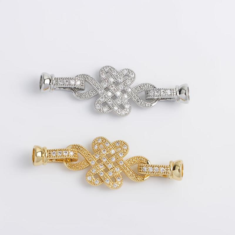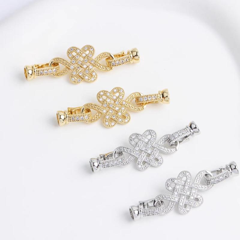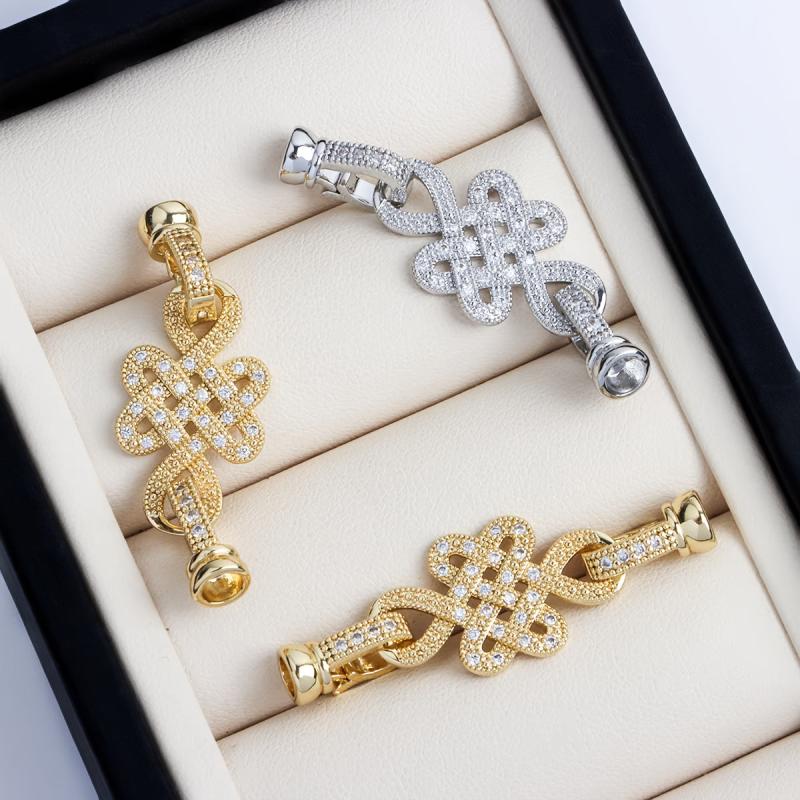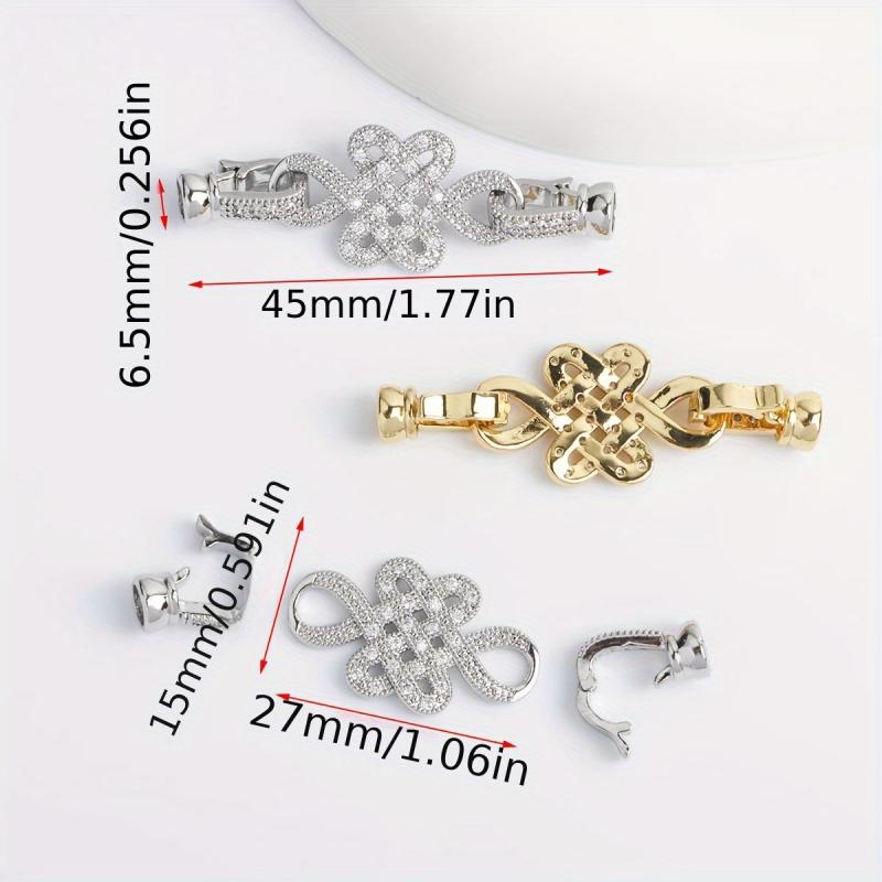 Elevate your DIY bracelet game with this stunning 18K plated copper necklace clasp. It features a Chinese knot design and micro pave cubic synthetic zirconia accents for added sparkle.