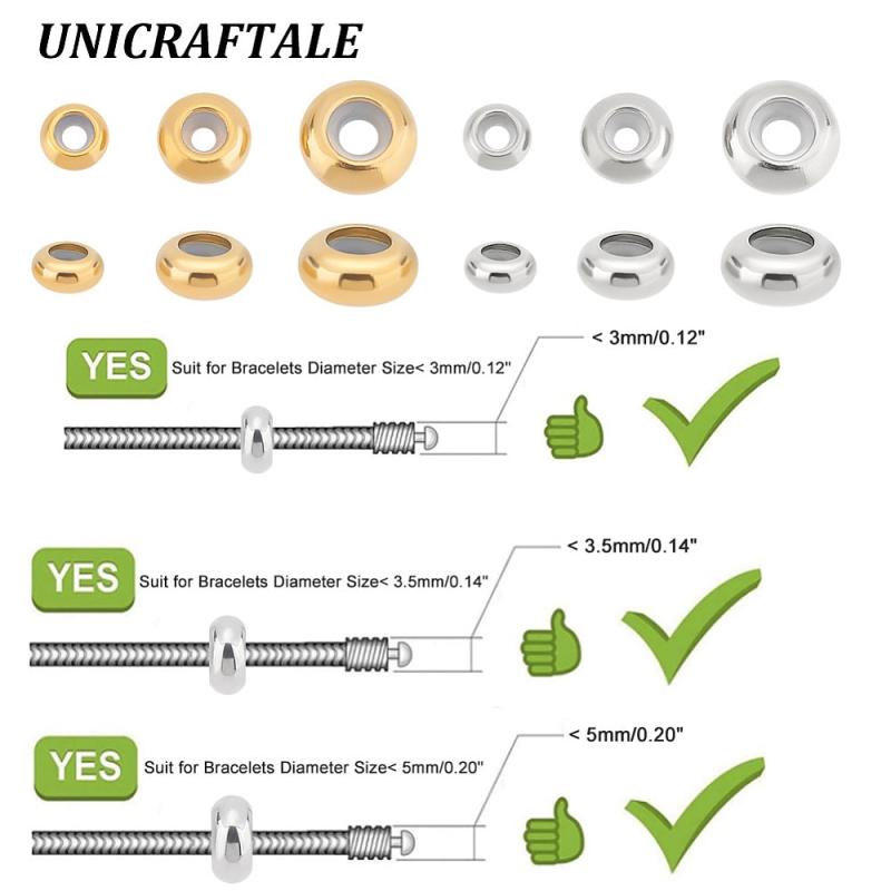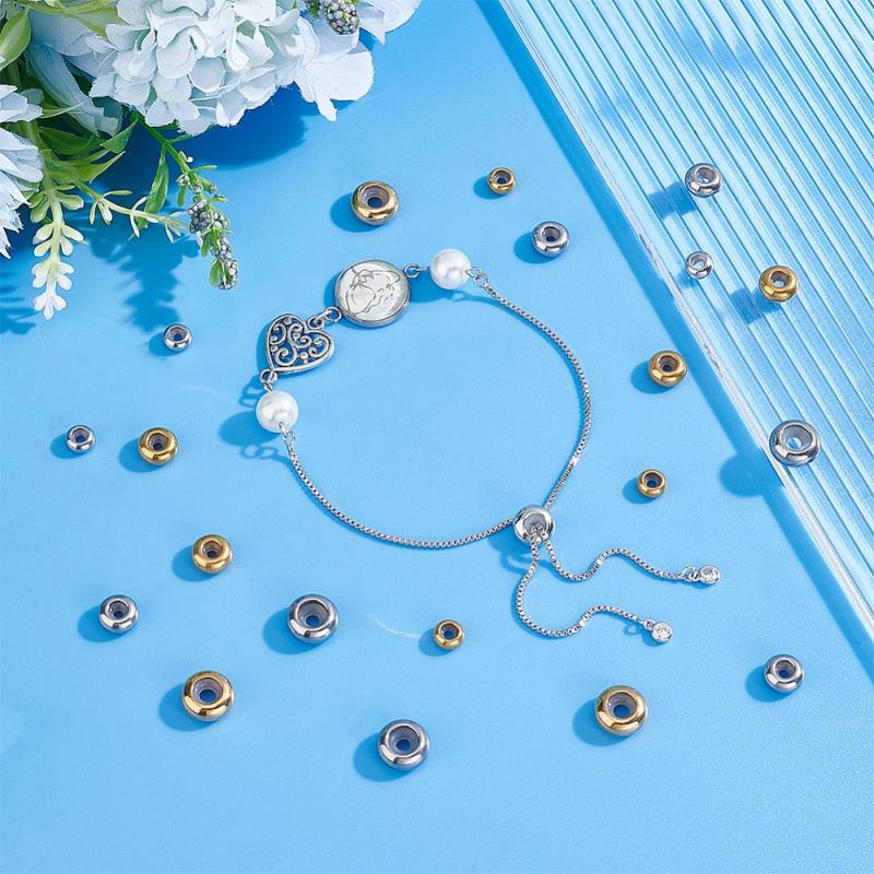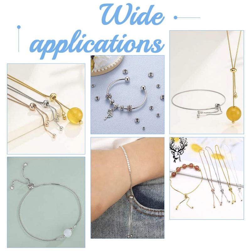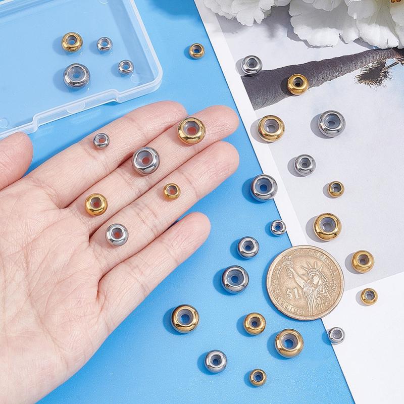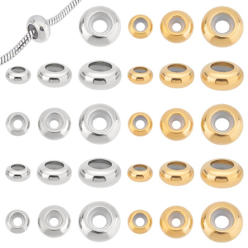Get a box of 30 mixed stainless steel beads with rubber inside for jewelry making. These slider beads are perfect for creating unique designs.