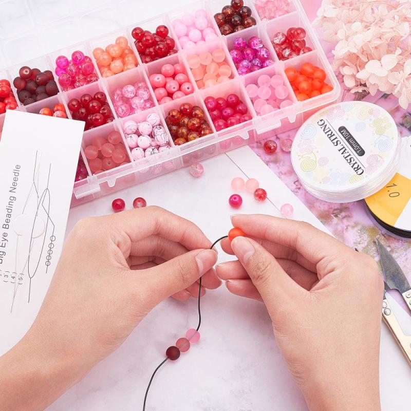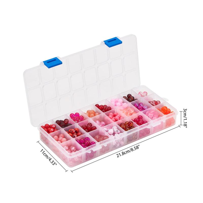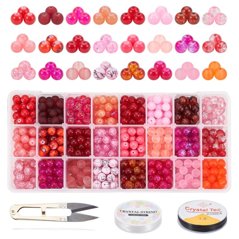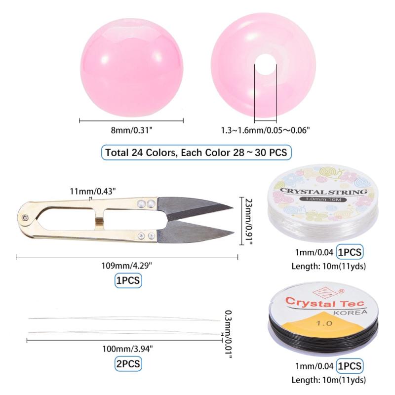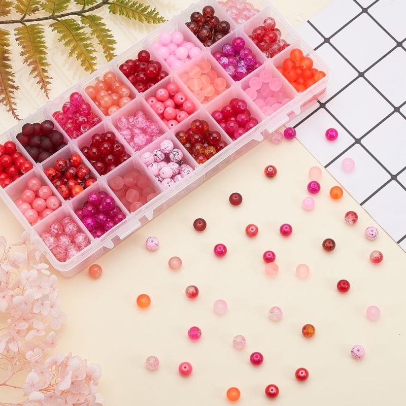 Get this box of 672 round glass beads in 8mm size for beading and jewelry making. The beads have a hole size of 1.3-1.6mm and come in 24 different colors, with approximately 28-30 beads per color.
