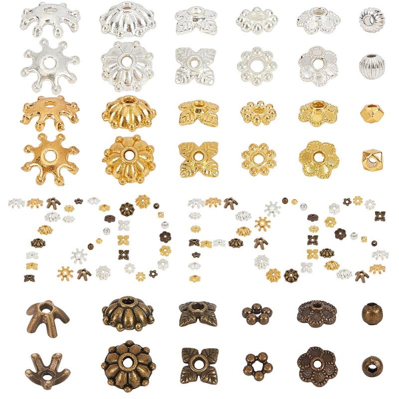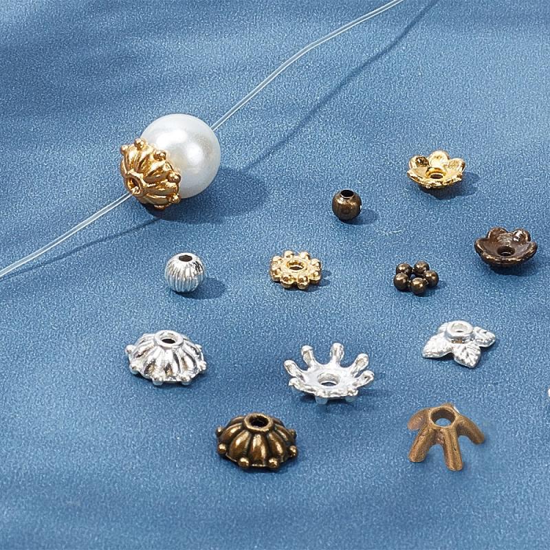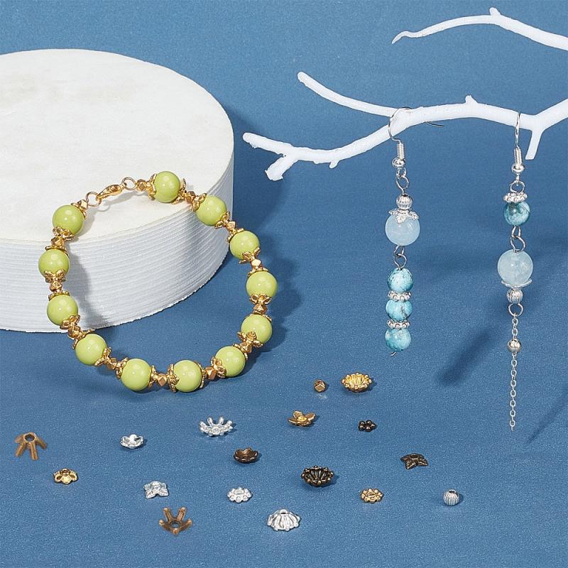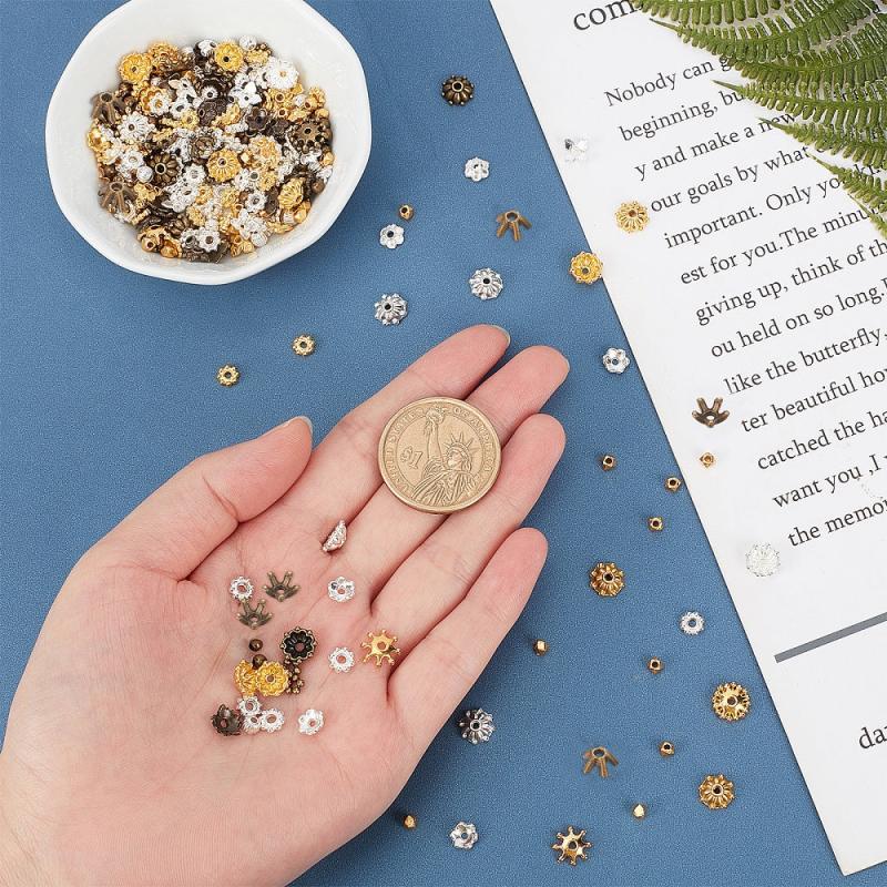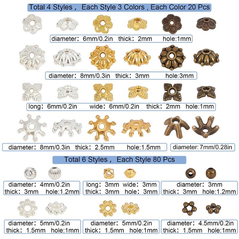 This set includes 240pcs of 5 styles bead caps and 480pcs of 5 styles alloy and iron spacer beads, perfect for crafting your own unique jewelry pieces.