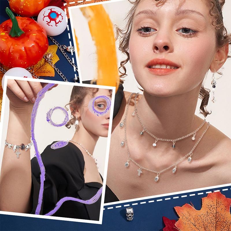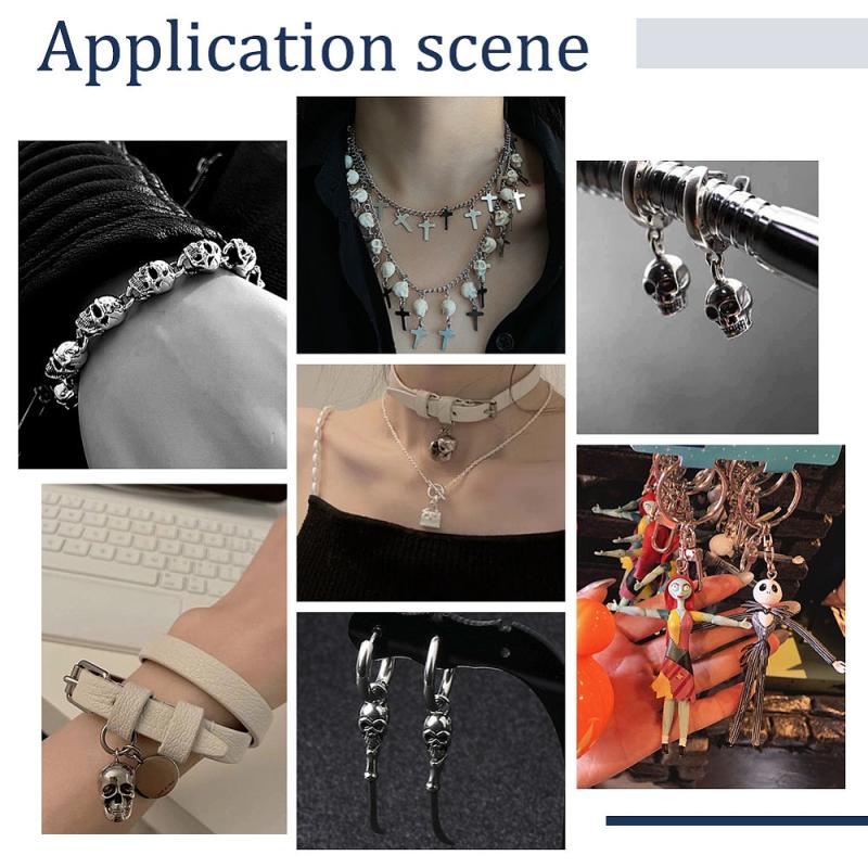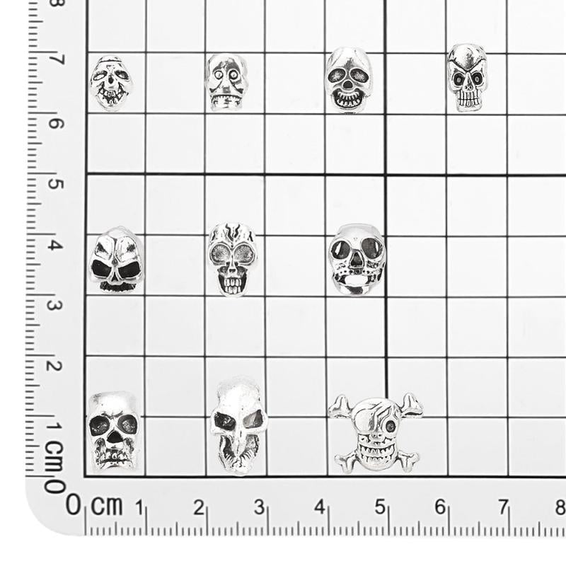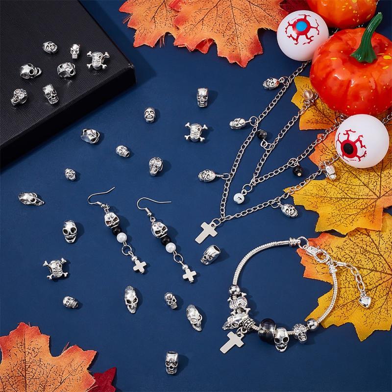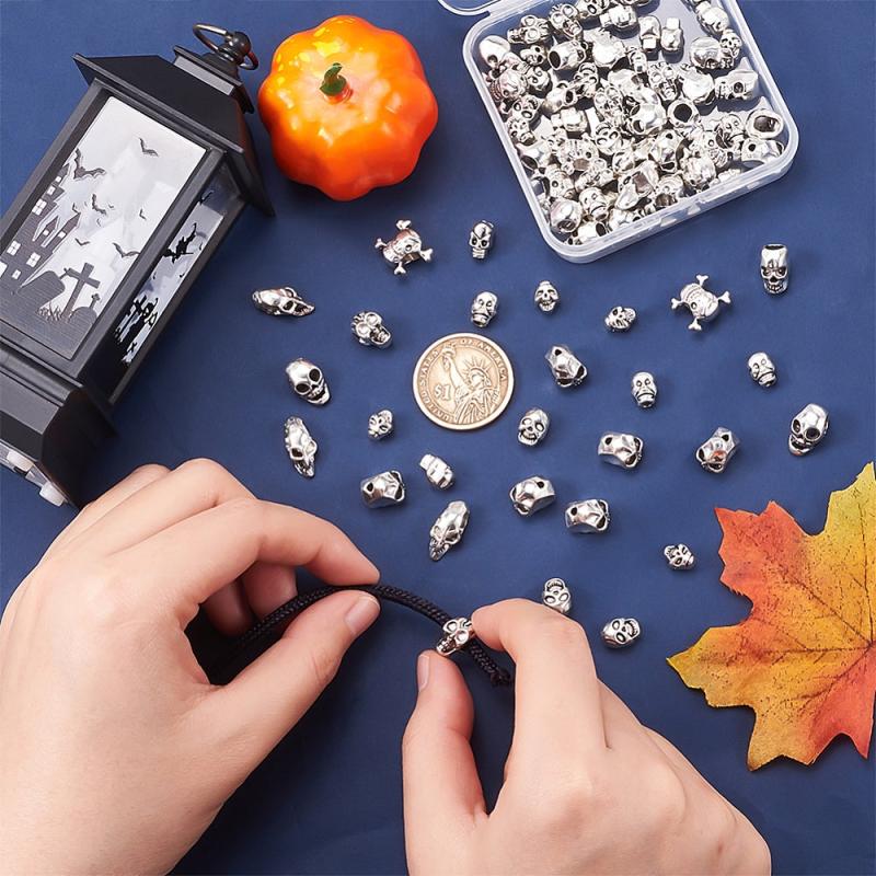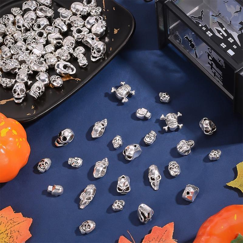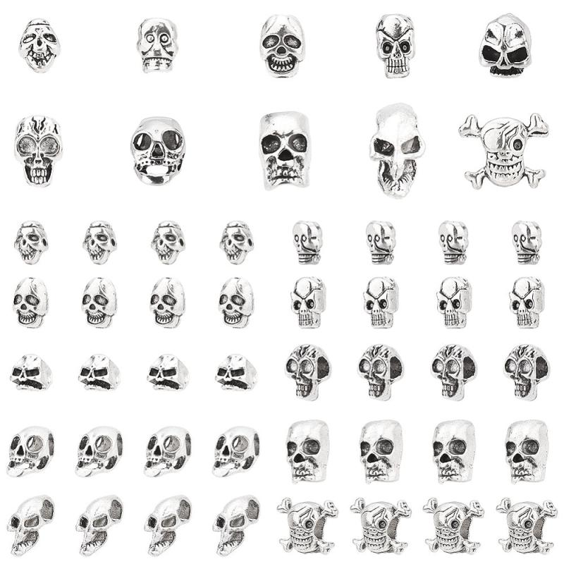 Add a spooky touch to your jewelry designs with this set of 80 skull spacer beads. Made of alloy, these skeleton head beads come in 10 different styles, perfect for your Halloween-themed creations.