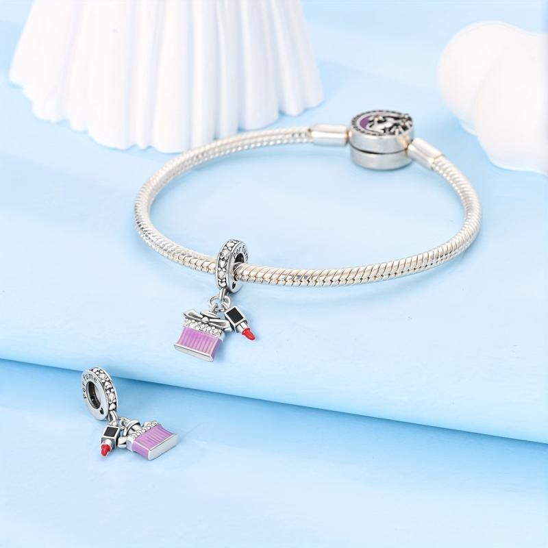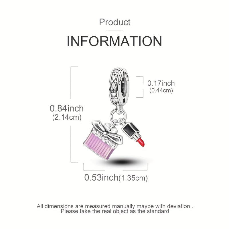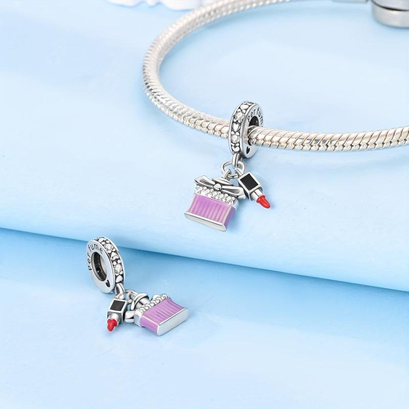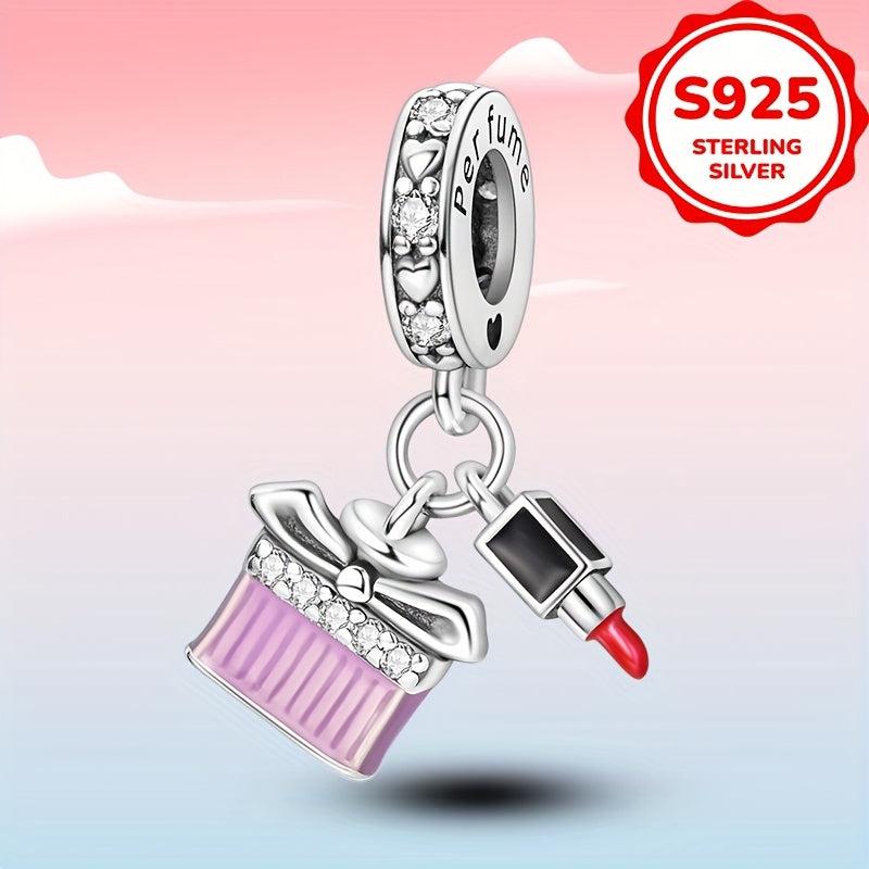 Elegant 925 silver charms designed like perfume bottles and lipsticks. Perfect for women at vacations, parties, banquets, weddings. Ideal fine jewelry accessory.