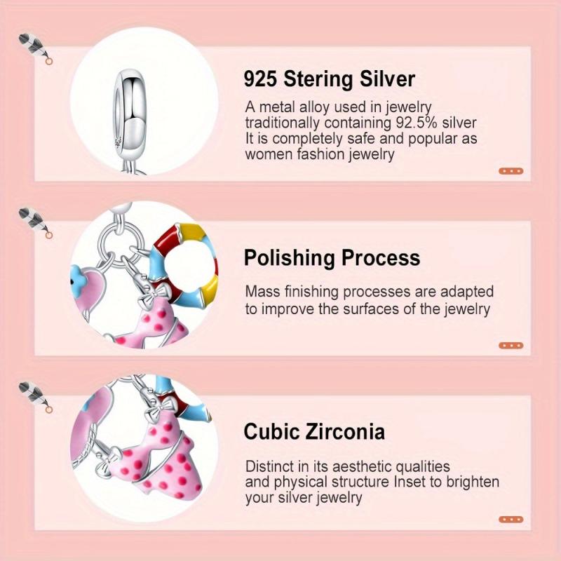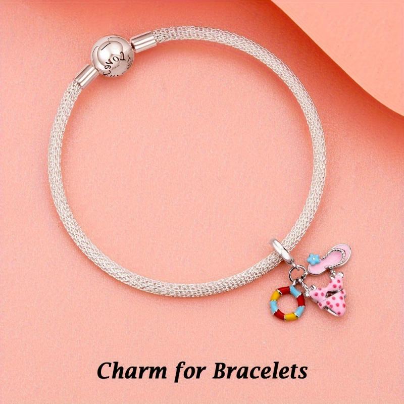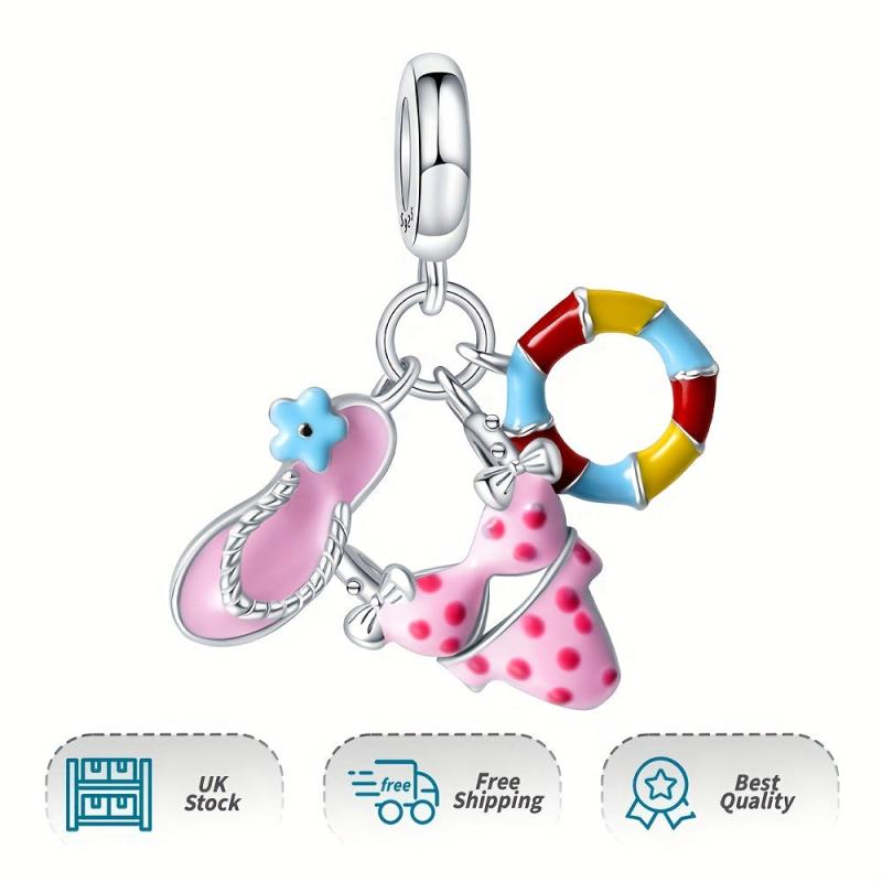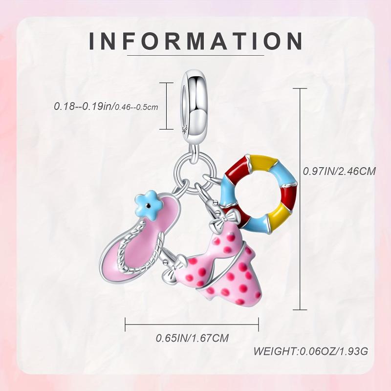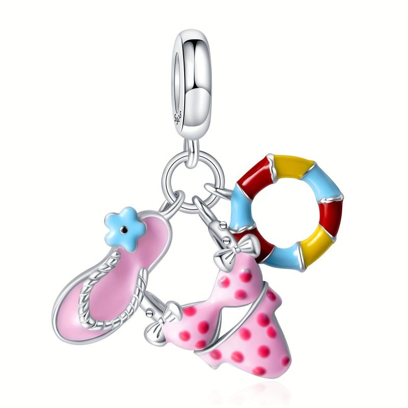 This sterling silver charm pendant features women's slipper bikini swimsuit & swimring triple dangle design. Perfect for adding to a bracelet or necklace for a holiday DIY project.