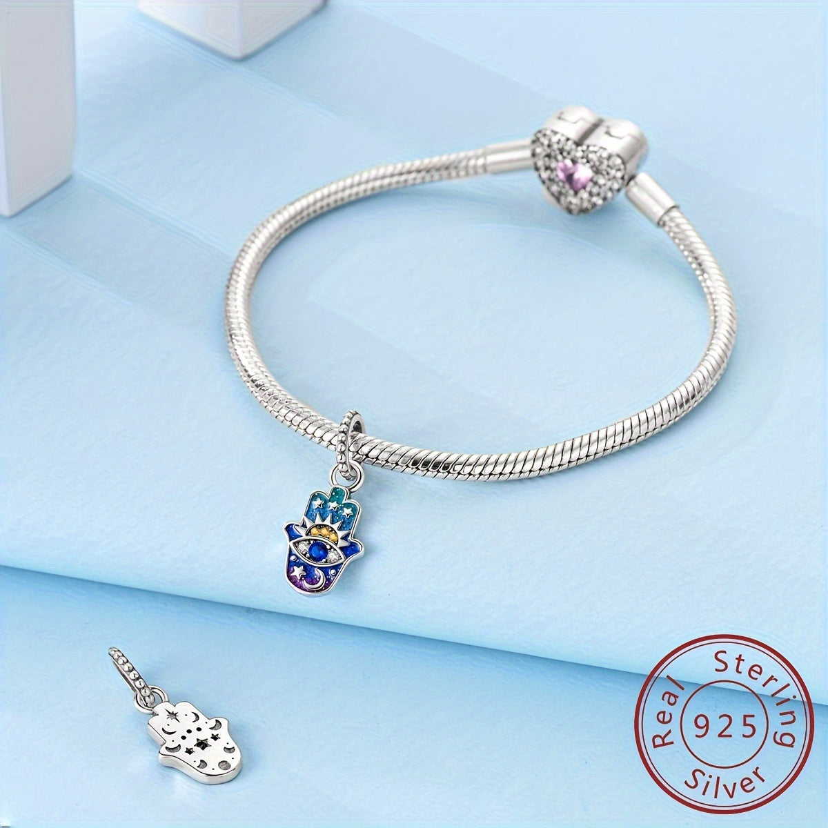 This creative pendant charm features colorful enamel design with zirconia accents. It symbolizes protection with elements like the sun, moon, star, and Fatima hamsa hand.