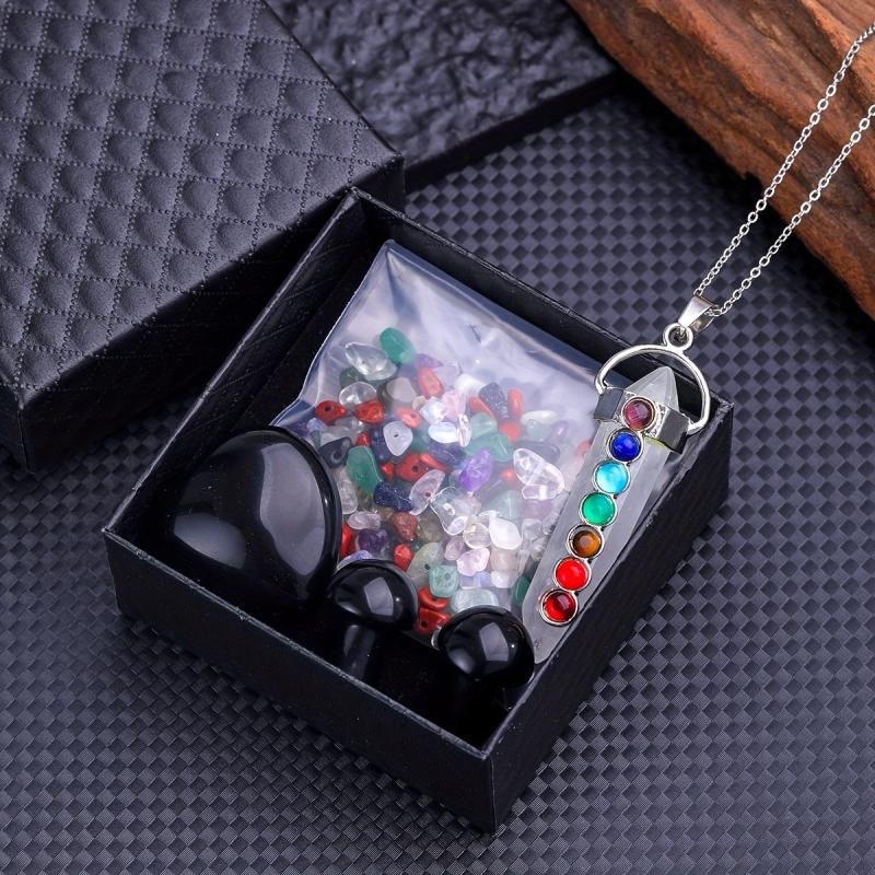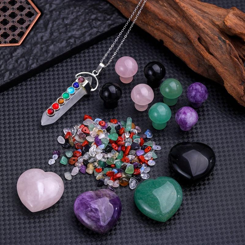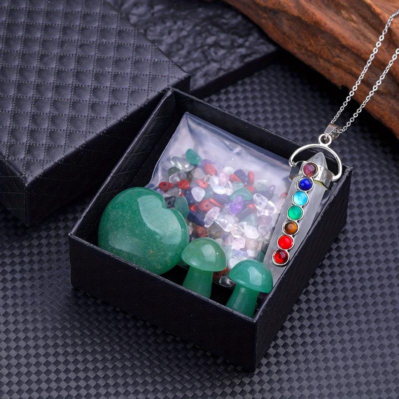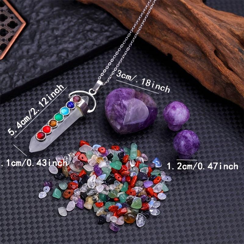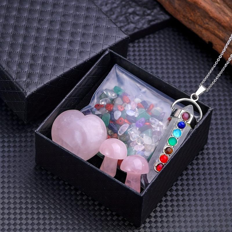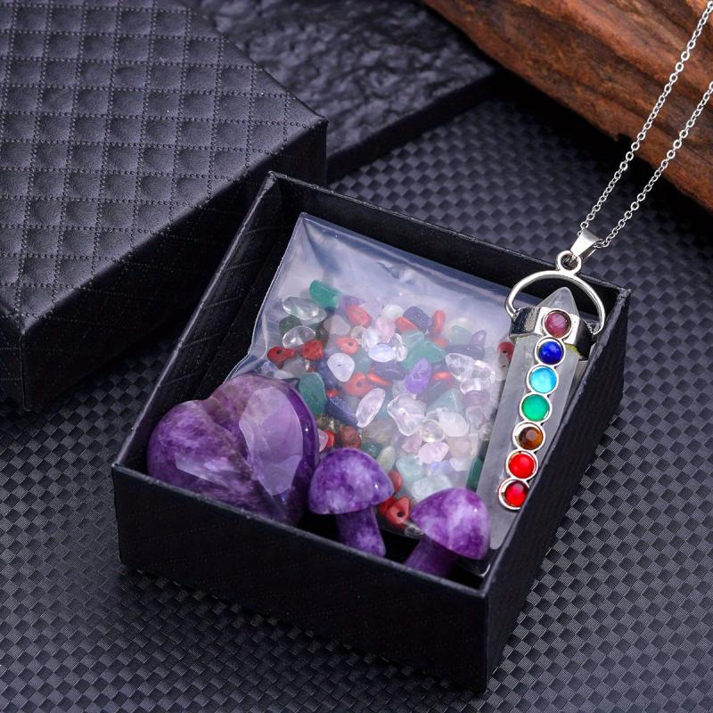 This crystal healing set includes a collection of pink crystal amethyst chakra necklace for reiki balancing. It comes in a beautiful box, making it perfect for meditation.