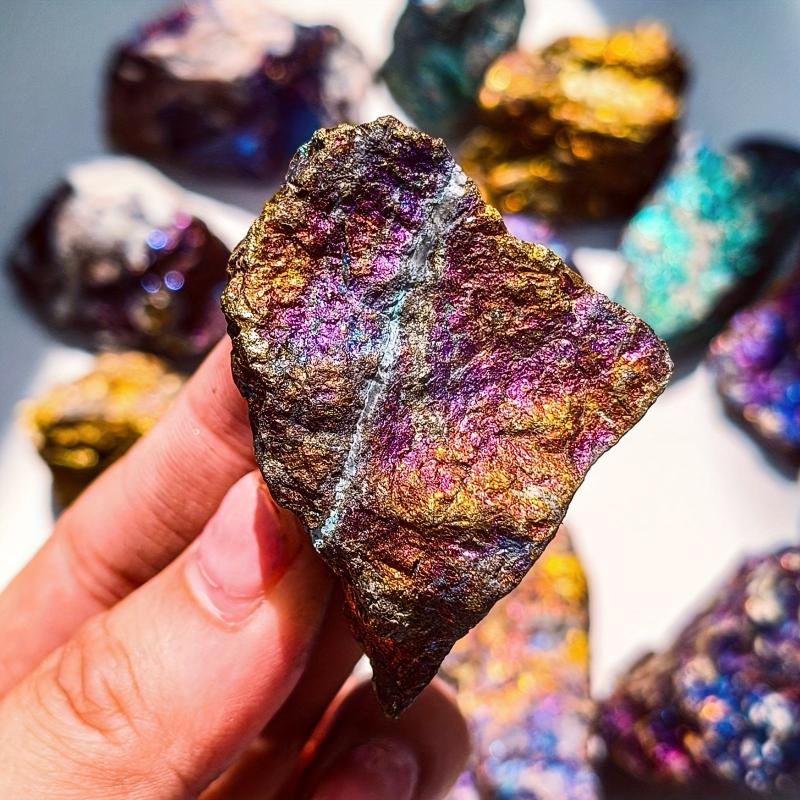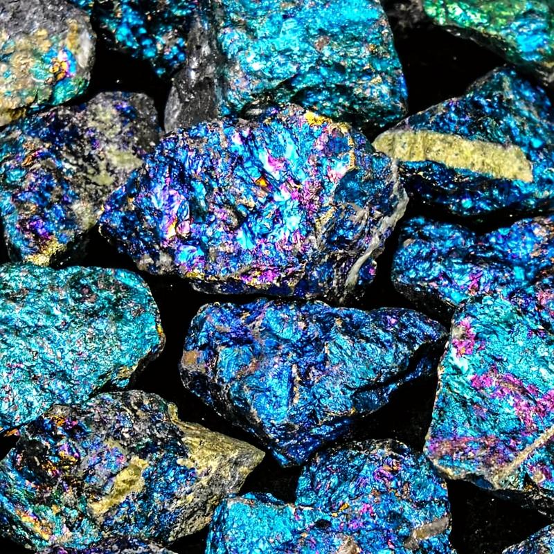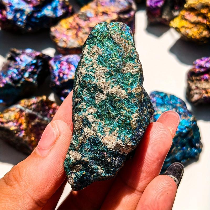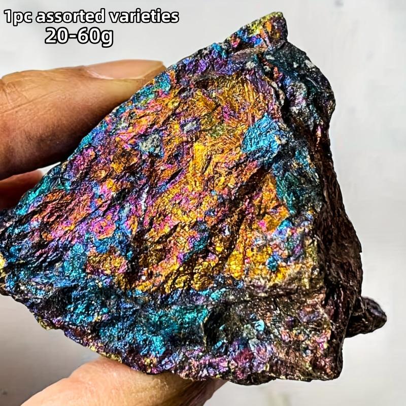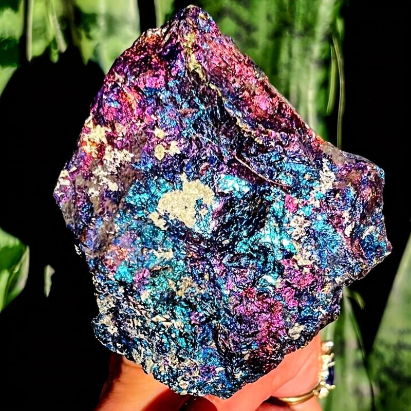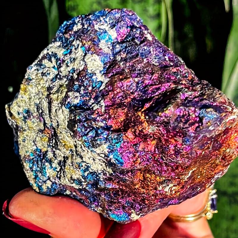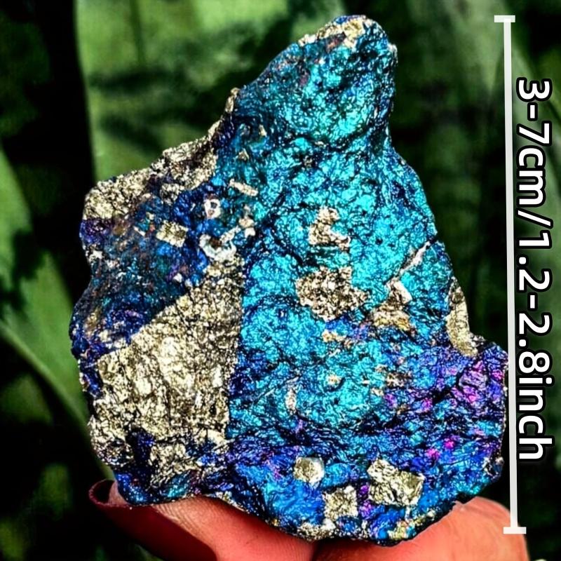 This bohemian home decor piece features a unique bornite specimen with vibrant chalcopyrite and malachite crystals. A stunning addition to any collection or display.