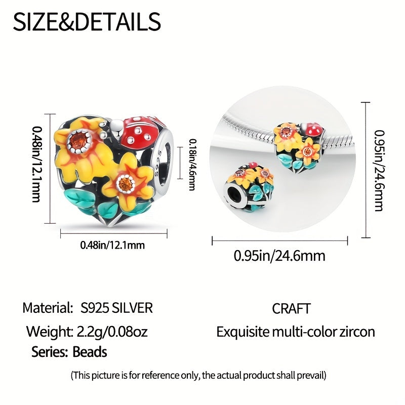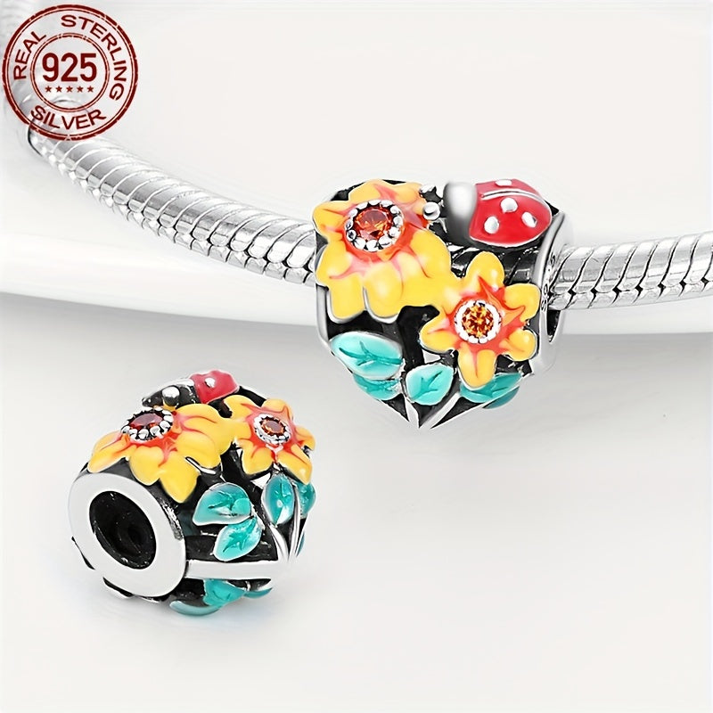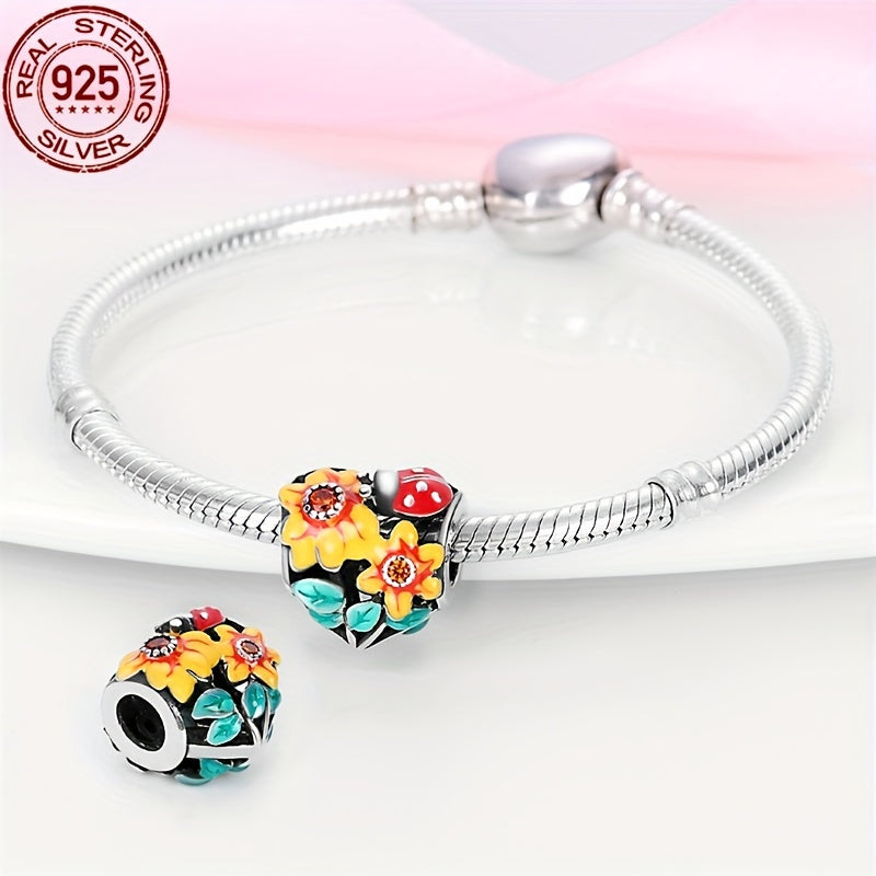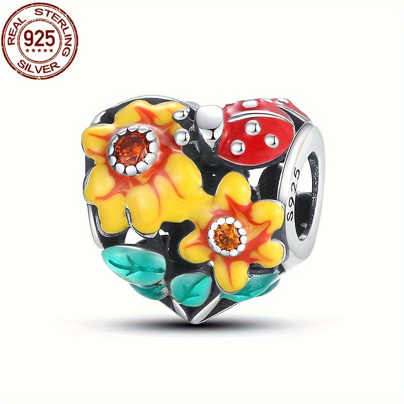 Beautifully crafted S925 sterling silver charm bracelet featuring a heart-shaped pendant adorned with yellow sunflowers, a red ladybug, and green leaves.