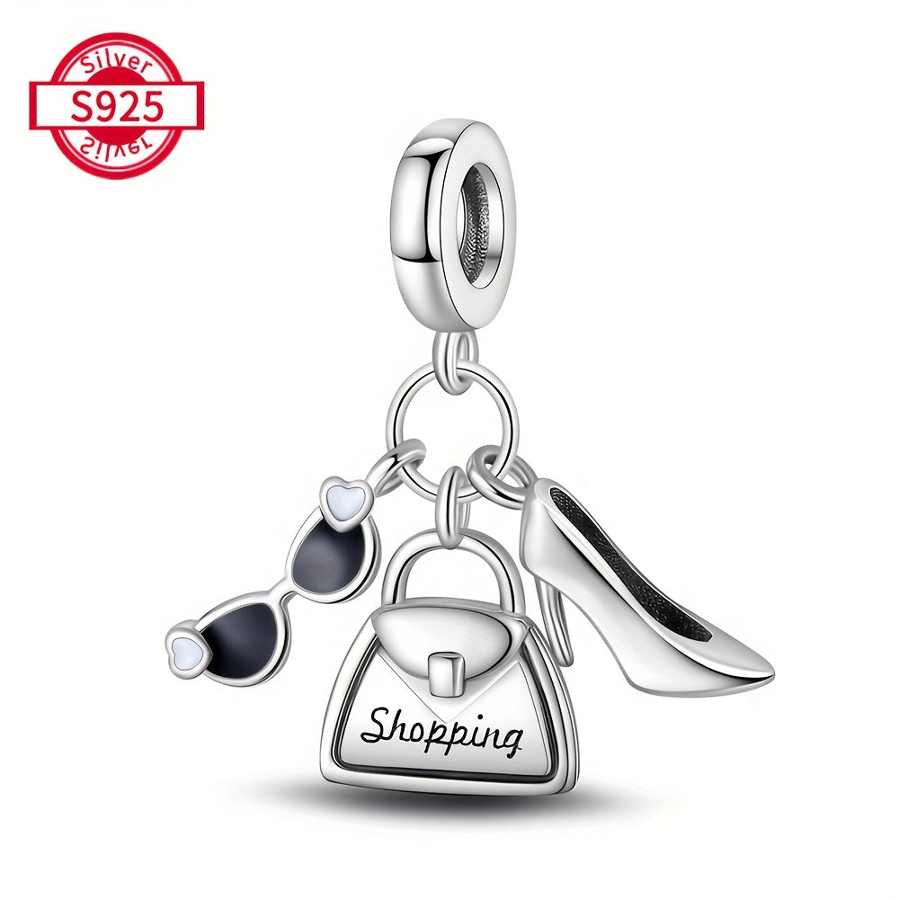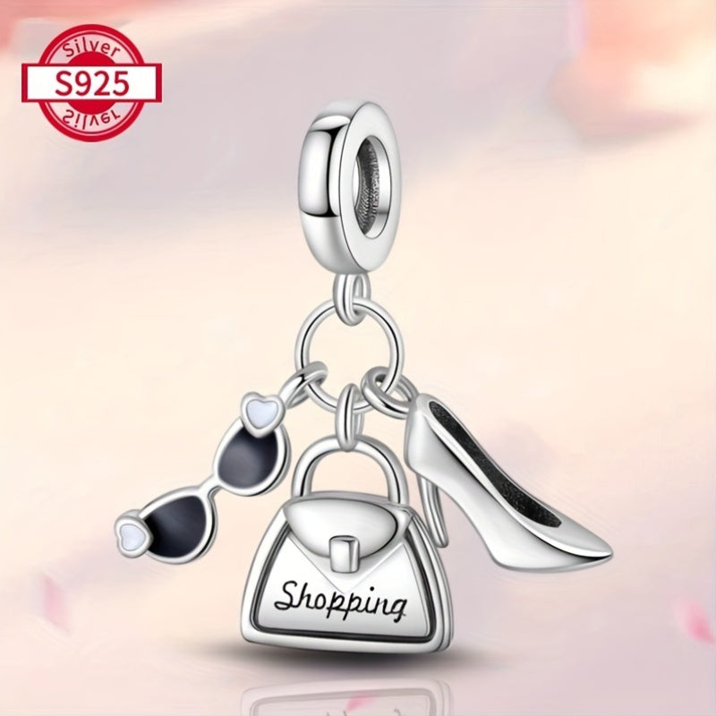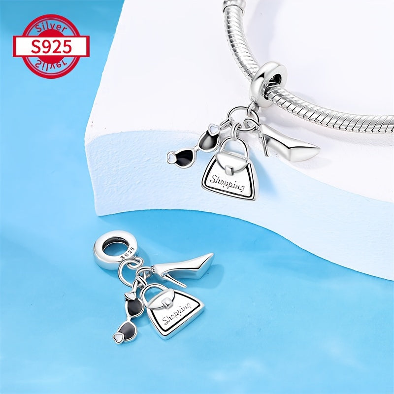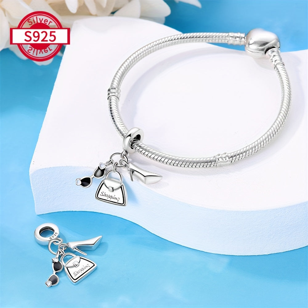 Add a touch of elegance with this sterling silver charm bracelet set featuring high heel, glasses, and handbag pendants. Perfect gift for women, family, and friends.