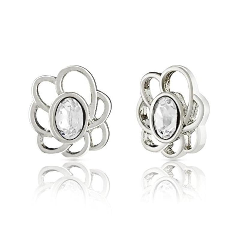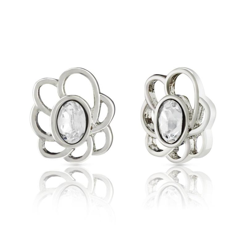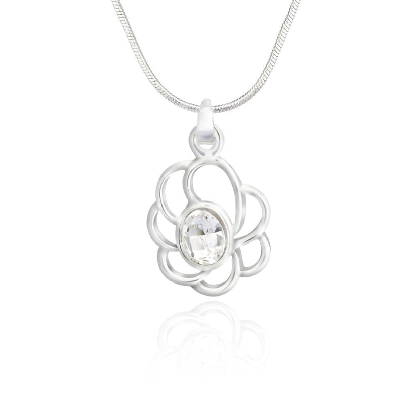 Elegant Valentine pendant set featuring an oval flower design with Swarovski crystals, plated in rhodium.