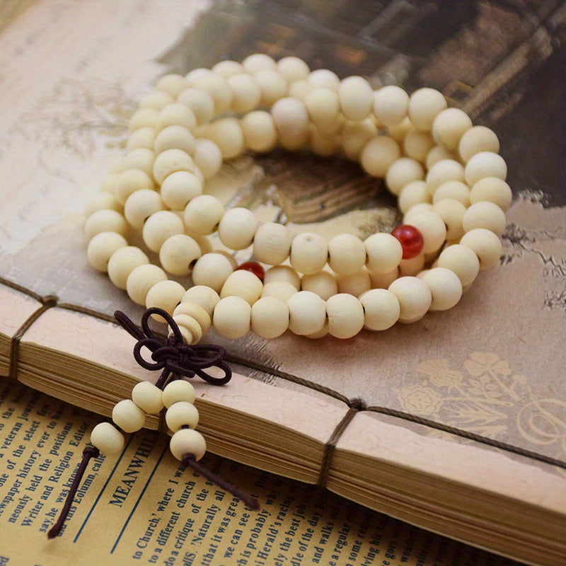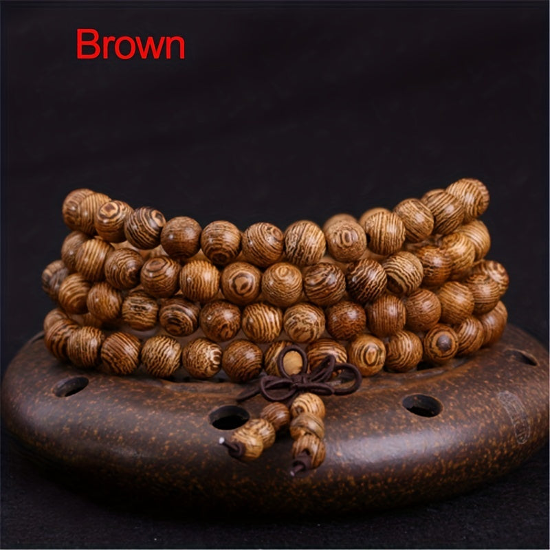 Handmade bracelet featuring 108 wooden beads with agate accents for a stylish look.