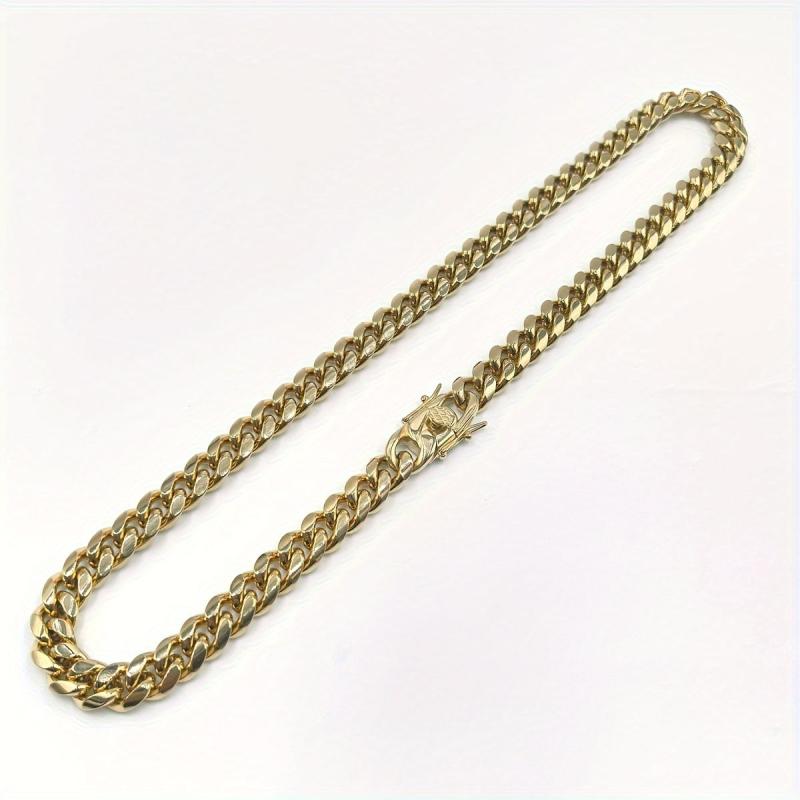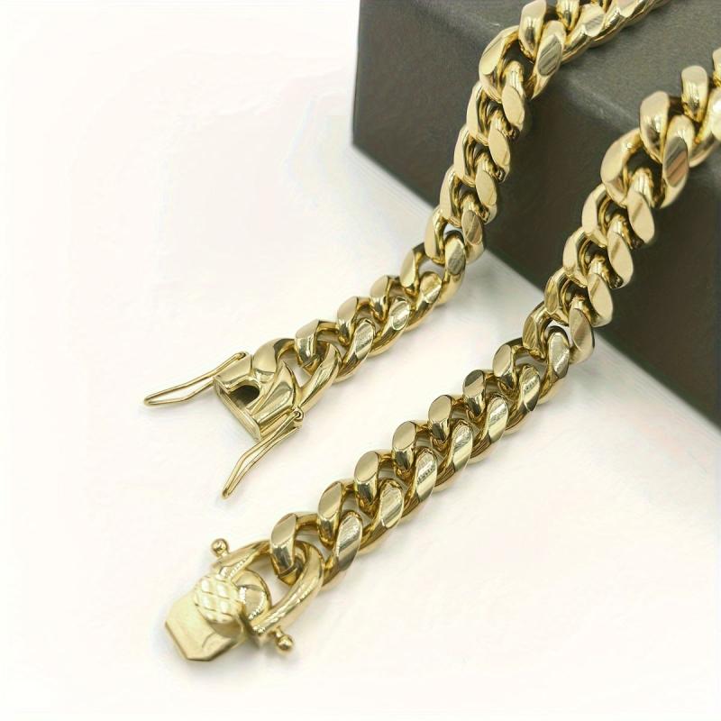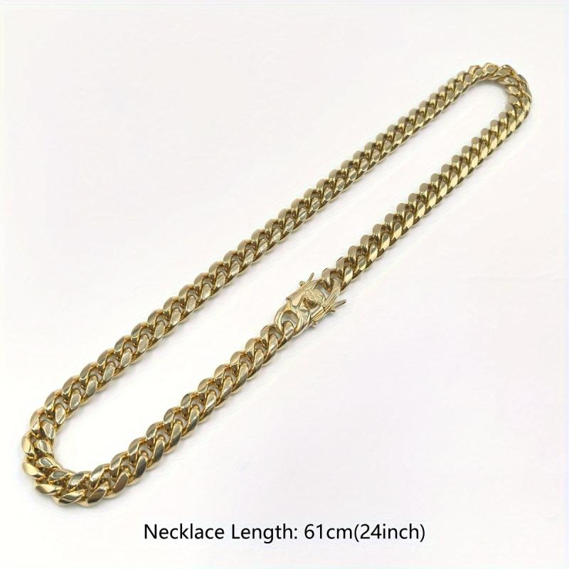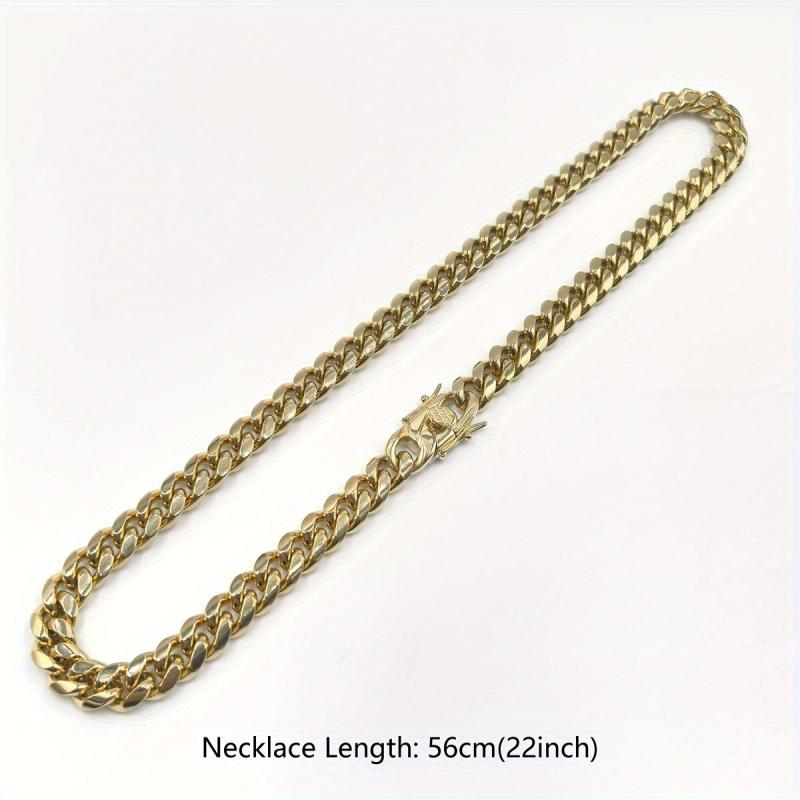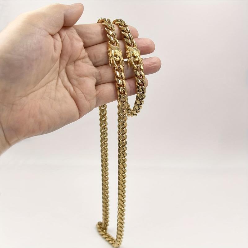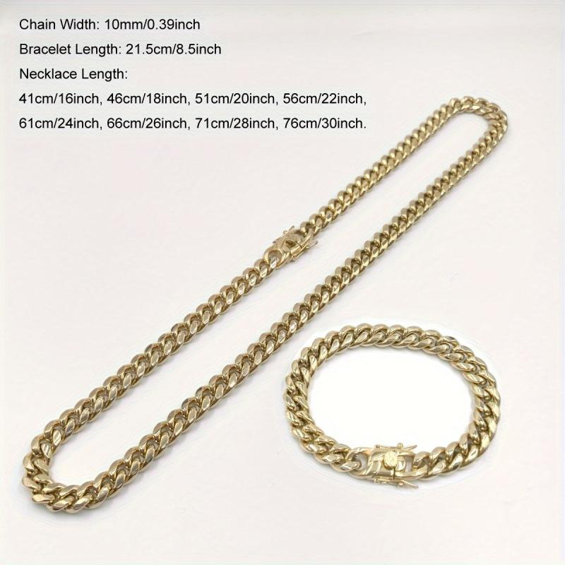 This hip hop punk golden necklace and bracelet set is a stylish accessory for both men and women. Made of durable stainless steel, it features a 10mm Miami Cuban chain design.