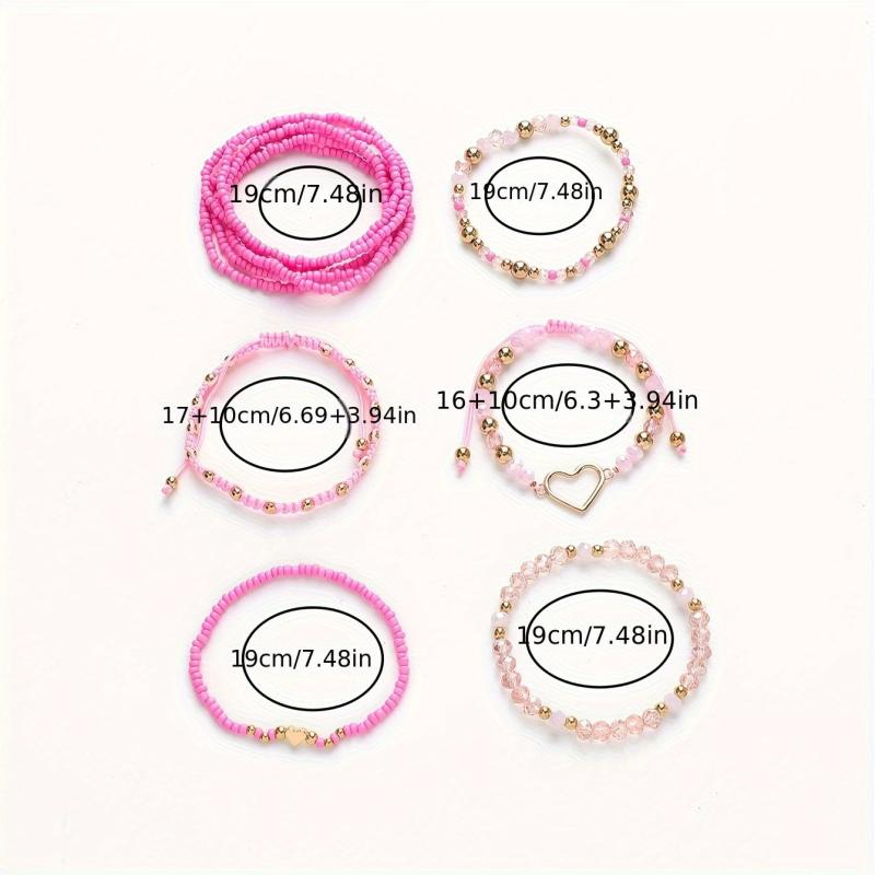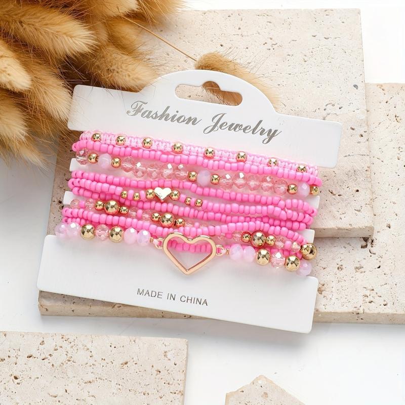 Handcrafted stackable wristbands for daily or vacation wear, this set includes 10 Y2K inspired pink heart glass beaded bracelets with golden accents. Perfect for couples!