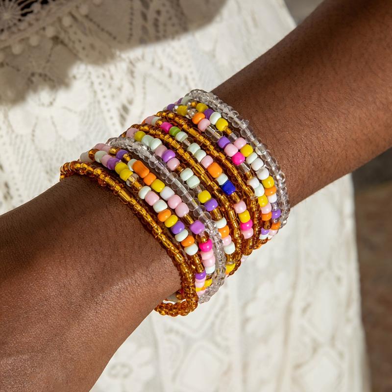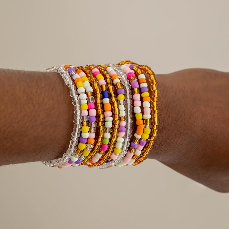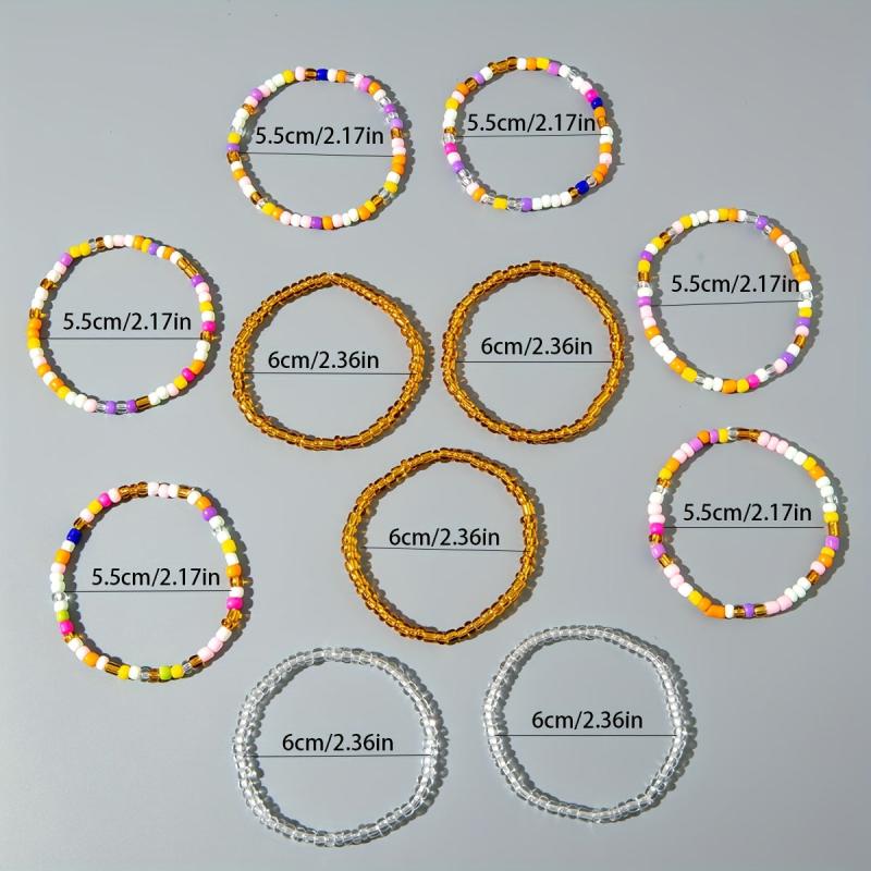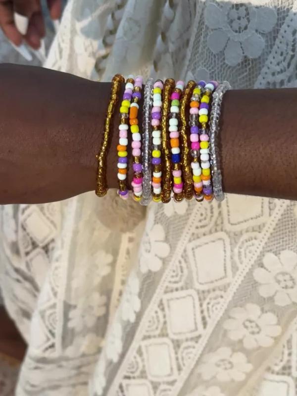 Elevate your style with this 11-piece bohemian beaded bracelet set. Featuring colorful bangles that stretch to fit any wrist size, adding a pop of color and fun to your outfit.