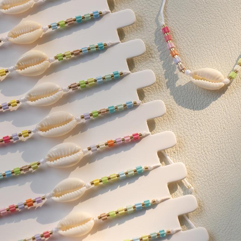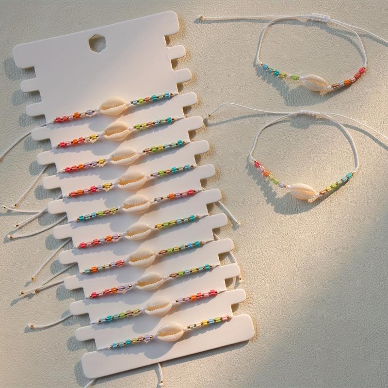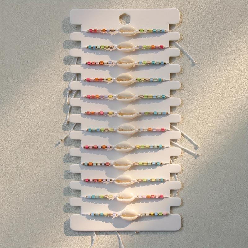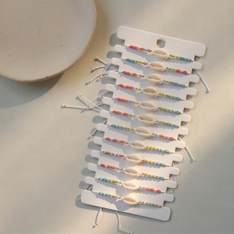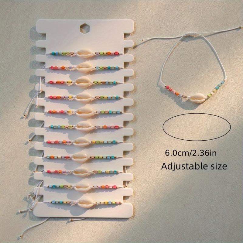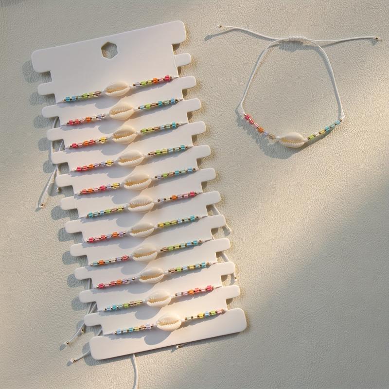 Elevate your vacation or party look with this set of 12 fashionable and colorful beaded shell bracelets. Adjustable design for a comfortable fit.