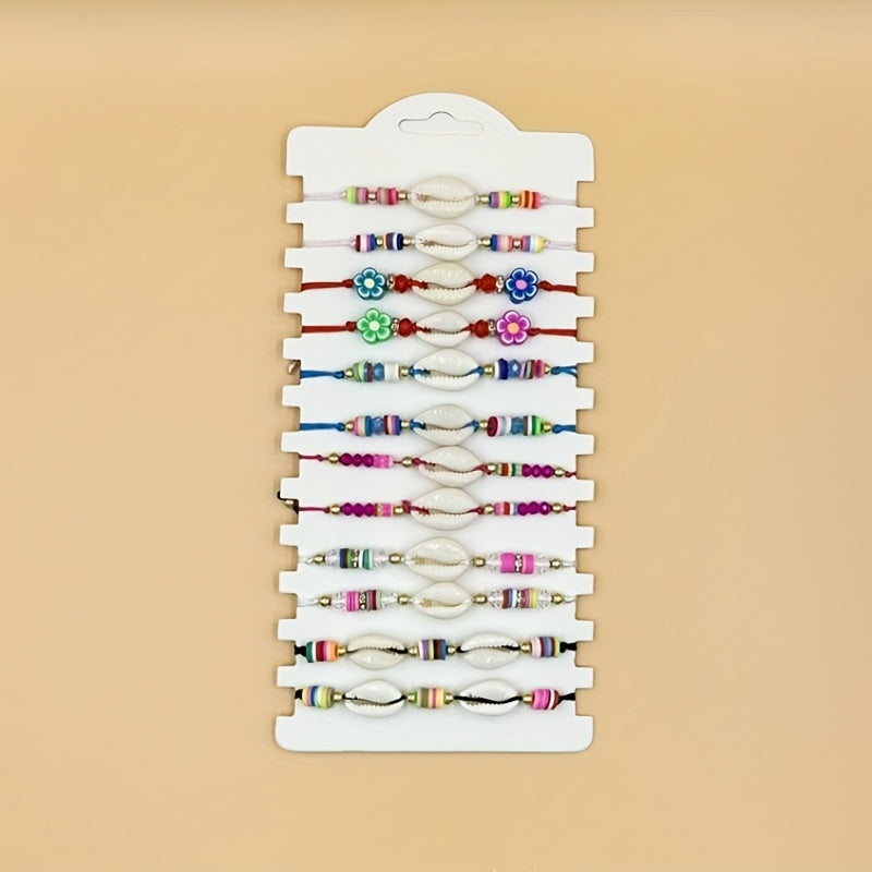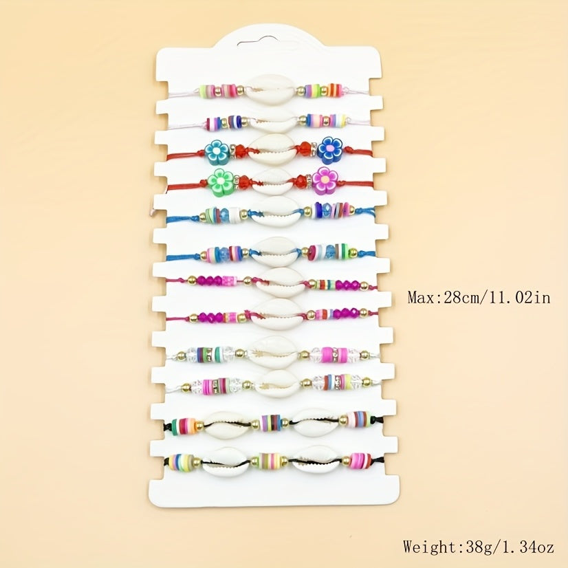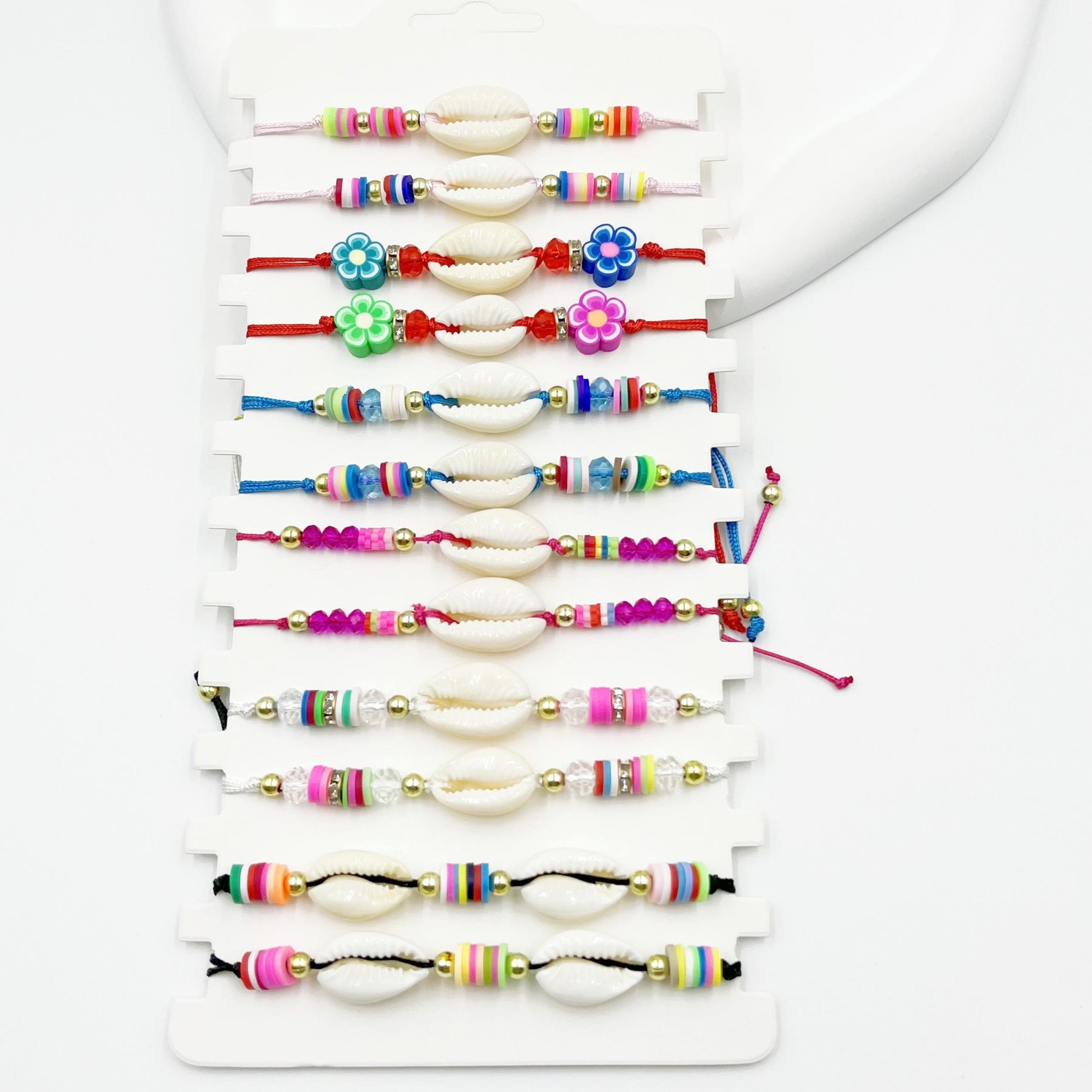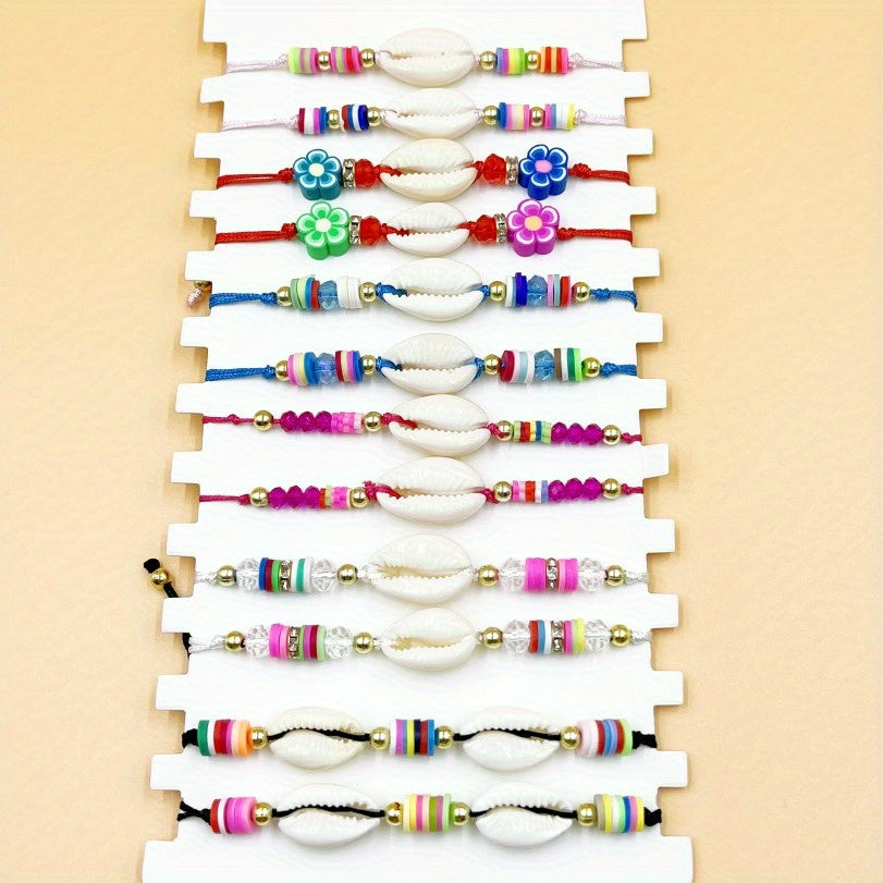 Get summer-ready with this set of 12 bohemian soft pottery flower shell beads friendship bracelets. Perfect for adding a touch of ocean style to your hand jewelry collection or to give as a holiday gift to women.