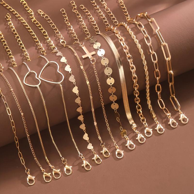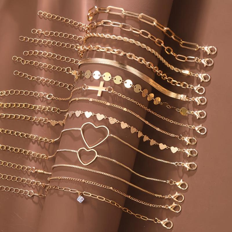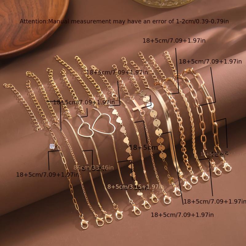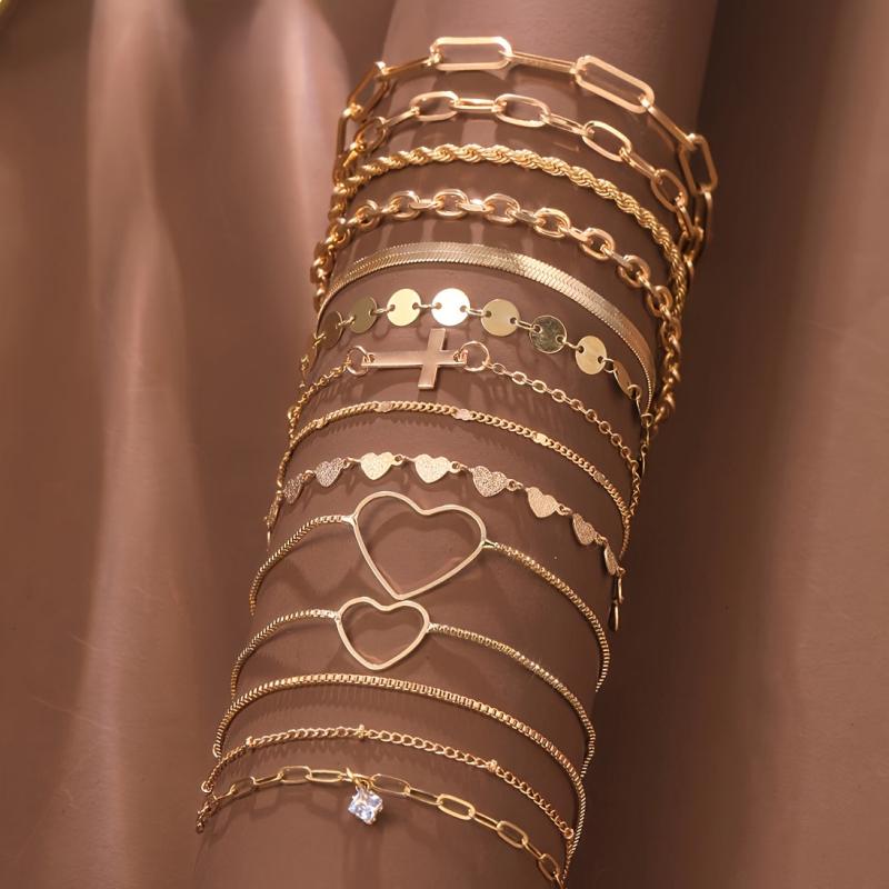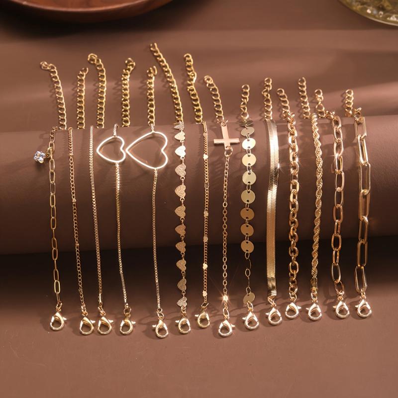 This set includes 14 stylish bracelets with heart and disc designs, ideal for everyday wear or special occasions. Mix and match to create your own unique look.