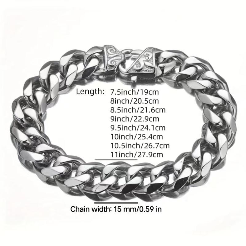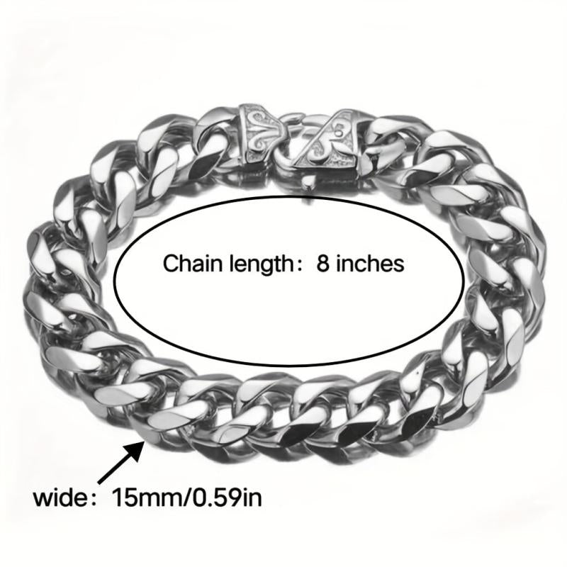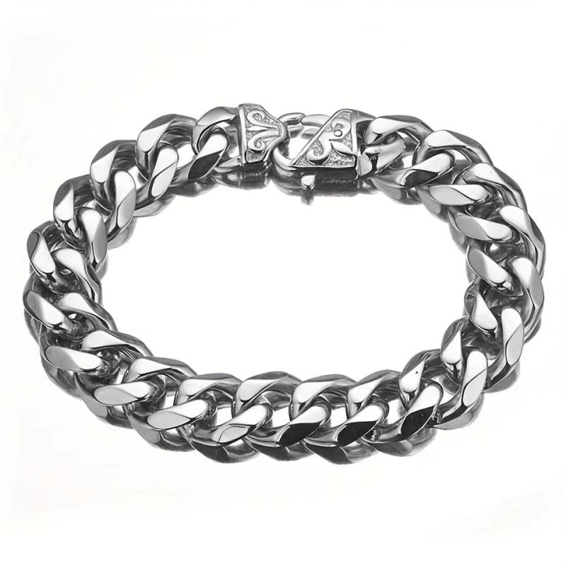 Add a touch of style to your outfit with this silvery Cuban chain bracelet made of durable 316L stainless steel.